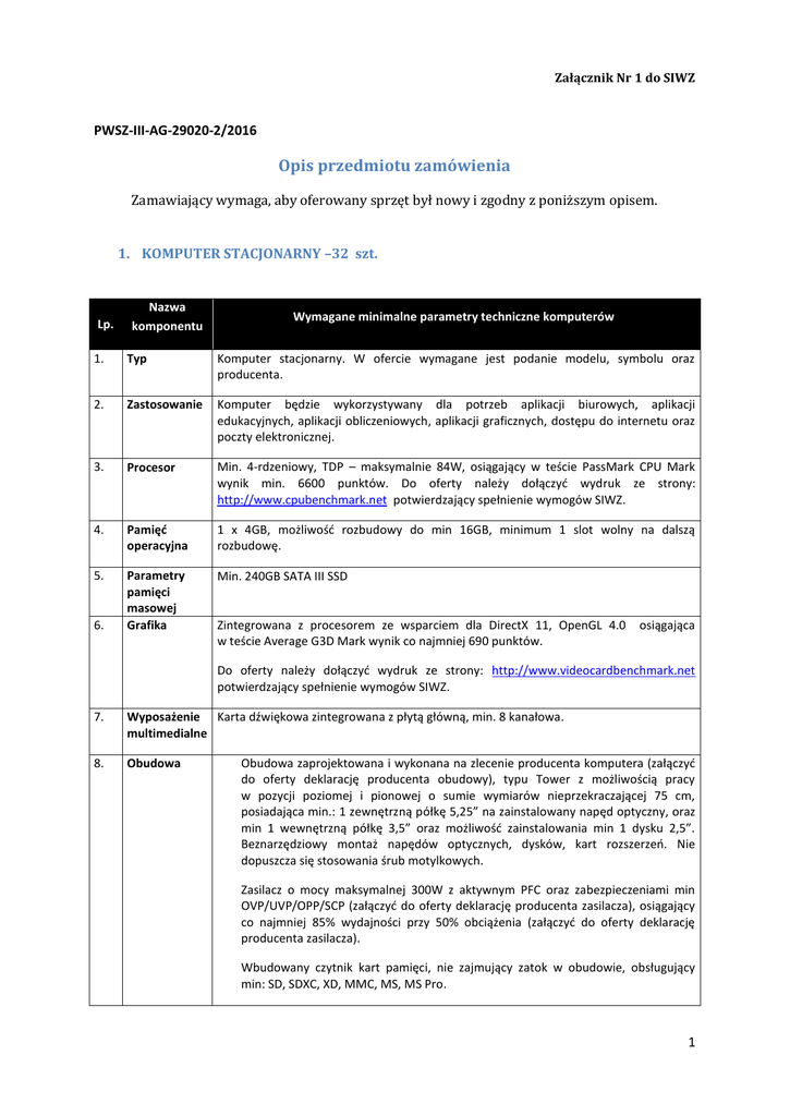 Załącznik Nr 1 do SIWZ PWSZ-III-AG-29020-2/2016 Opis przedmiotu zamówienia Zamawiający wymaga, aby oferowany sprzęt był nowy i zgodny z poniższym opisem. 1. KOMPUTER STACJONARNY –32 szt. Lp. Nazwa komponentu Wymagane minimalne parametry techniczne komputerów 1. Typ Komputer stacjonarny. W ofercie wymagane jest podanie modelu, symbolu oraz producenta. 2. Zastosowanie Komputer będzie wykorzystywany dla potrzeb aplikacji biurowych, aplikacji edukacyjnych, aplikacji obliczeniowych, aplikacji graficznych, dostępu do internetu oraz poczty elektronicznej. 3. Procesor Min. 4-rdzeniowy, TDP – maksymalnie 84W, osiągający w teście PassMark CPU Mark wynik min. 6600 punktów. Do oferty należy dołączyć wydruk ze strony: http://www.cpubenchmark.net potwierdzający spełnienie wymogów SIWZ. 4. Pamięć operacyjna 1 x 4GB, możliwość rozbudowy do min 16GB, minimum 1 slot wolny na dalszą rozbudowę. 5. Parametry pamięci masowej Grafika Min. 240GB SATA III SSD 6. Zintegrowana z procesorem ze wsparciem dla DirectX 11, OpenGL 4.0 w teście Average G3D Mark wynik co najmniej 690 punktów. osiągająca Do oferty należy dołączyć wydruk ze strony: http://www.videocardbenchmark.net potwierdzający spełnienie wymogów SIWZ. 7. Wyposażenie Karta dźwiękowa zintegrowana z płytą główną, min. 8 kanałowa. multimedialne 8. Obudowa Obudowa zaprojektowana i wykonana na zlecenie producenta komputera (załączyć do oferty deklarację producenta obudowy), typu Tower z możliwością pracy w pozycji poziomej i pionowej o sumie wymiarów nieprzekraczającej 75 cm, posiadająca min.: 1 zewnętrzną półkę 5,25” na zainstalowany napęd optyczny, oraz min 1 wewnętrzną półkę 3,5” oraz możliwość zainstalowania min 1 dysku 2,5”. Beznarzędziowy montaż napędów optycznych, dysków, kart rozszerzeń. Nie dopuszcza się stosowania śrub motylkowych. Zasilacz o mocy maksymalnej 300W z aktywnym PFC oraz zabezpieczeniami min OVP/UVP/OPP/SCP (załączyć do oferty deklarację producenta zasilacza), osiągający co najmniej 85% wydajności przy 50% obciążenia (załączyć do oferty deklarację producenta zasilacza). Wbudowany czytnik kart pamięci, nie zajmujący zatok w obudowie, obsługujący min: SD, SDXC, XD, MMC, MS, MS Pro. 1 9. Zgodność z systemami operacyjnymi i standardami Oferowany model komputera musi poprawnie współpracować z oferowanym systemem operacyjnym (do oferty załączyć wydruk ze strony producenta oprogramowania). 10. Certyfikaty i standardy 11. Warunki gwarancji Certyfikat ISO9001 oraz ISO14001 dla producenta sprzętu (załączyć do oferty dokument potwierdzający spełnianie wymogu); Deklaracja zgodności CE (załączyć do oferty dokument potwierdzający spełnianie wymogu); Komputer musi spełniać wymogi normy Energy Star 6.1; Wymagany wpis dotyczący oferowanego modelu komputera w internetowym katalogu http://www.eu-energystar.org lub http://www.energystar.gov – dopuszcza się wydruk ze strony internetowej. 3 letnia gwarancja producenta, naprawa w ciągu 14 dni roboczych, w przypadku przekroczenia terminu na naprawę obowiązek wymiany sprzętu na nowy, wolny od wad. - załączone do oferty oświadczenie Producenta lub Autoryzowanego Partnera Serwisowego Producenta potwierdzające, że serwis będzie realizowany przez Autoryzowanego Partnera Serwisowego Producenta lub bezpośrednio przez Producenta zgodnie z warunkami gwarancyjnymi określonymi w zamówieniu. 12. Wsparcie techniczne producenta Ogólnopolska, telefoniczna infolinia/linia techniczna producenta komputera, (ogólnopolski numer o zredukowanej odpłatności 0-800/0-801 – w ofercie należy podać numer telefonu) dostępna w czasie obowiązywania gwarancji na sprzęt i umożliwiająca po podaniu numeru seryjnego urządzenia: weryfikację konfiguracji fabrycznej wraz z wersją fabrycznie dostarczonego oprogramowania (system operacyjny, szczegółowa konfiguracja sprzętowa - CPU, HDD, pamięć) Możliwość aktualizacji i pobrania sterowników do oferowanego modelu komputera w najnowszych certyfikowanych wersjach przy użyciu dedykowanego darmowego oprogramowania producenta lub bezpośrednio z sieci Internet za pośrednictwem strony www producenta komputera po podaniu numeru seryjnego komputera lub modelu komputera. 13. Wymagania dodatkowe 1. Preinstalowany system operacyjny 64 bitowy nie wymagający aktywacji za pomocą telefonu lub Internetu u producenta + nośnik lub system równoważny – przez równoważność rozumie się: Zainstalowany system operacyjny musi spełniać następujące wymagania, poprzez wbudowane mechanizmy, bez użycia dodatkowych aplikacji: - możliwość dokonywania aktualizacji i poprawek systemu przez Internet z możliwością wyboru instalowanych poprawek; - możliwość dokonywania uaktualnień sterowników urządzeń przez Internet; - witrynę producenta systemu; - darmowe aktualizacje w ramach wersji systemu operacyjnego przez Internet (niezbędne aktualizacje, poprawki, biuletyny bezpieczeństwa muszą być dostarczane bez dodatkowych opłat) – wymagane podanie nazwy strony serwera WWW; - internetowa aktualizacja zapewniona w języku polskim; - wbudowana zapora internetowa (firewall) dla ochrony połączeń internetowych; zintegrowana z systemem konsola do zarządzania ustawieniami zapory i regułami IP v4 i v6; - zlokalizowane w języku polskim, co najmniej następujące elementy: menu, odtwarzacz multimediów, pomoc, komunikaty systemowe; - wsparcie dla większości powszechnie używanych urządzeń peryferyjnych 2 (drukarek, urządzeń sieciowych, standardów USB, Plug &Play, Wi-Fi); - funkcjonalność automatycznej zmiany domyślnej drukarki w zależności od sieci, do której podłączony jest komputer; - interfejs użytkownika działający w trybie graficznym z elementami 3D, zintegrowana z interfejsem użytkownika interaktywna część pulpitu służącą do uruchamiania aplikacji, które użytkownik może dowolnie wymieniać i pobrać ze strony