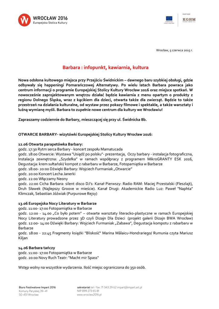 Wrocław, 5 czerwca 2015 r. Barbara : infopunkt, kawiarnia, kultura Nowa odsłona kultowego miejsca przy Przejściu Świdnickim – dawnego baru szybkiej obsługi, gdzie odbywały się happeningi Pomarańczowej Alternatywy. Po wielu latach Barbara powraca jako centrum informacji o programie Europejskiej Stolicy Kultury Wrocław 2016 oraz miejsce spotkań. W nowocześnie zaprojektowanym wnętrzu działać będzie kawiarnia z menu opartym o produkty z regionu Dolnego Śląska, wraz z kącikiem dla dzieci, otwarta także dla zwierząt. Będzie to także przestrzeń na działania kulturalne, od wystaw przez pokazy filmowe i spektakle, a także warsztaty i luźną wymianę myśli. Barbara to zupełnie nowe centrum dla kultury we Wrocławiu! Zapraszamy codziennie do Barbary, mieszczącej się przy ul. Świdnicka 8b. OTWARCIE BARBARY- wizytówki Europejskiej Stolicy Kultury Wrocław 2016: 12.06 Otwarta parapetówka Barbary: godz. 17:30 Rytm serca Barbary - koncert zespołu Mamatucada godz. 18:00 Otwarcie: Wystawa "Usiądź po polsku"- prezentacja, Oczy barbary - instalacja fotograficzna, Instalacja zewnętrzna: „Szydełka” w ramach współpracy z programem MikroGRANTY ESK 2016, Degustacja: krem sułtański/ kompot z rabarbaru w Barbarze, Fotopamiątka w Barbarze godz. 18:00- 20:00 Dźwięki Barbary: Wojciech Furmaniak „Otwarcie” godz. 20:00 Koncert Lecha Janerki godz. 22:00 Włączamy Neony godz. 22:00 Cicha Barbara: silent disco DJ’s: Kanał Pierwszy: Radio RAM: Maciej Przestalski (Fleszlajt), Druh Sławek (Najlepszy Groove w mieście). Kanał Drugi: Akademickie Radio Luz: Paweł "Naphta" Klimczak, Sebastian Jóźwiak (Purpurowe Rejsy) 13.06 Europejska Nocy Literatury w Barbarze godz. 11:00- 17:00 Fotopamiątka w Barbarze godz. 12:00 - 14.00 „Co było potem” – otwarte warsztaty literacko-plastyczne w ramach Europejskiej Nocy Literatury prowadzone przez 3D czyli Dizajn Dla Dzieci (projekt galerii Dizajn BWA Wrocław) godz. 12:00- 14:00 Dźwięki Barbary: Wojciech Furmaniak „Zabawa”, Degustacja kompotu z rabarbaru w Barbarze godz. 18:00 - 22:45 Fragmenty książki "Bliskość" Marina Mălaicu-Hondrariego/ Rumunia czyta Mariusz Kiljan 14.06 Barbara tańczy godz. 11:00- 17:00 Fotopamiątka w Barbarze godz. 20:00 Novy Ruch Teatr: "Macht mir Spass" Wstęp wolny na wszystkie wydarzenia. Ilość miejsc ograniczona do 350 osób. PEŁNA INFORMACJA: 12.06 Otwarta parapetówka Barbary: godz. 17:30 Rytm serca Barbary - koncert zespołu Mamatucada Mamatucada- zespół perkusyjny grający muzykę z zakresu brazylijskiej samby, funk, bossa novy, samby reggae. Ich muzyka wciąga do tańca, do wspólnej zabawy. Nie da się na nią pozostać obojętnym. Mamatucada to pierwsza żeńska bateria (brazylijska orkiestra bębniarska grająca sambę i akompaniująca paradom) w Polsce. Grupa w składzie: Marianna Wasik – REPINIQUE Aleksandra Wasik – CAIXA Anna Krotoska - SURDO Małgorzata Korczak – SURDO Alicja Aksamit - CHOCALHO Agata Owczarek – CHOCALHO Magdalena Jaroszyk - AGOGO Joanna Kaczmarek - TAMBORIM godz. 18:00 Otwarcie: Wystawa "Usiądź po polsku"- prezentacja, Oczy Barbary- instalacja fotograficzna, Instalacja zewnętrza Szydełka w ramach współpracy z projektem Mikrogranty, Degustacja: krem sułtański/ kompot z rabarbaru w Barbarze, Fotopamiątka w Barbarze Usiądź po polsku: Mistrzowskie krzesła i siedziska polskich projektantów i producentów. Kto wie ile polskich krzeseł i siedzisk ma status ikon? jakie polskie krzesła zyskały międzynarodowe uznanie? Projekt „Usiądź po polsku” ma na celu zgromadzenie w jednym miejscu najlepszych przykładów polskiego wzornictwa. Wszystkie obiekty zostały zaprojektowane przez polskich projektantów i wdrożone do produkcji przez polskie firmy w latach1941 - 2014. Co więcej, wiele z nich stało się symbolem swoich czasów i otrzymało liczne międzynarodowe wyróżnienia na czele z nagrodą RED DOT, meblowym Oskarem. Wybór modeli pokazuje przede wszystkim różnorodność polskiego meblarstwa powojennych dekad, zarówno w obszarze eksperymentów, jak i produkcji seryjnych. Zebrana kolekcja obiektów nagrodzonych Red Dot meblowym Oskarem świadczy o wysokiej pozycji polskiego wzornictwa na arenie międzynarodowej (12 nagród tylko w 2014 r.). Na wystawie „Usiądź po polsku” pokazujemy nie tylko te obiekty, które wydają się ważne dzisiaj, bo zostały nagrodzone w polskich i zagranicznych konkursach. Pokazujemy również te, które są istotne, bo obrazują ewolucję polskiego siedziska na przestrzeni ostatnich 20 lat. Prezentujemy również najnowsze modele, które miały premierę na najważniejszych dla branży meblowej targach w Mediolanie. Kolekcja „Usiądź po polsku” będzie dostępna w Barbarze przez cały czas trwania obchodów Europejskiej Stolicy Kultury 2016 we Wrocławiu. Mistrzowskie krzesła i siedziska polskich projektantów i producentów: Tomek Rygalik, Malafor Studio, Reneta Kalarus, Nikodem Szpunar, Dorota Koziara, Anna Vonhausen, Jan Lutyk, Piotr Kuchciński, Teresa Kruszewska, Tomasz Augustyniak, Wanda Telakowska, Roman Modzelewski. Wystawę uzupełnia prezentacja obiektów kolekcjonerskich, krzeseł i siedzisk, które powstały w powojennej Polsce. Wyszukiwane przez pasjonatów, często bezimienne, są perełkami w odkrywanej na nowo przez Polaków historii polskiego meblarstwa. Prezentowane na wystawie krzesła i fotele pochodzą głównie ze zbiorów dr Krystyny Łuczak – Surówki, historyka designu. Oczy Barbary- instalacja fotograficzna: Wielkoformatowe zdjęcia w postaci instalacji, która jest zaproszeniem dla Wrocławian do spotkania się z historią. Wielkoformatowy wydruk: Wypadek samochodowy z udziałem karetki Pogotowia Ratunkowego na trasie W-Z. N/z: świadkowie zdarzenia obracają przewrócony pojazd; naprzeciwko widoczny bar "Barbara", 4 grudnia 1978 r., fot. Zbigniew Nowak. Zdjęcie pochodzi z archiwum Ośrodka Pamięć i Przyszłość. Instalacja zewnętrzna: „Szydełka