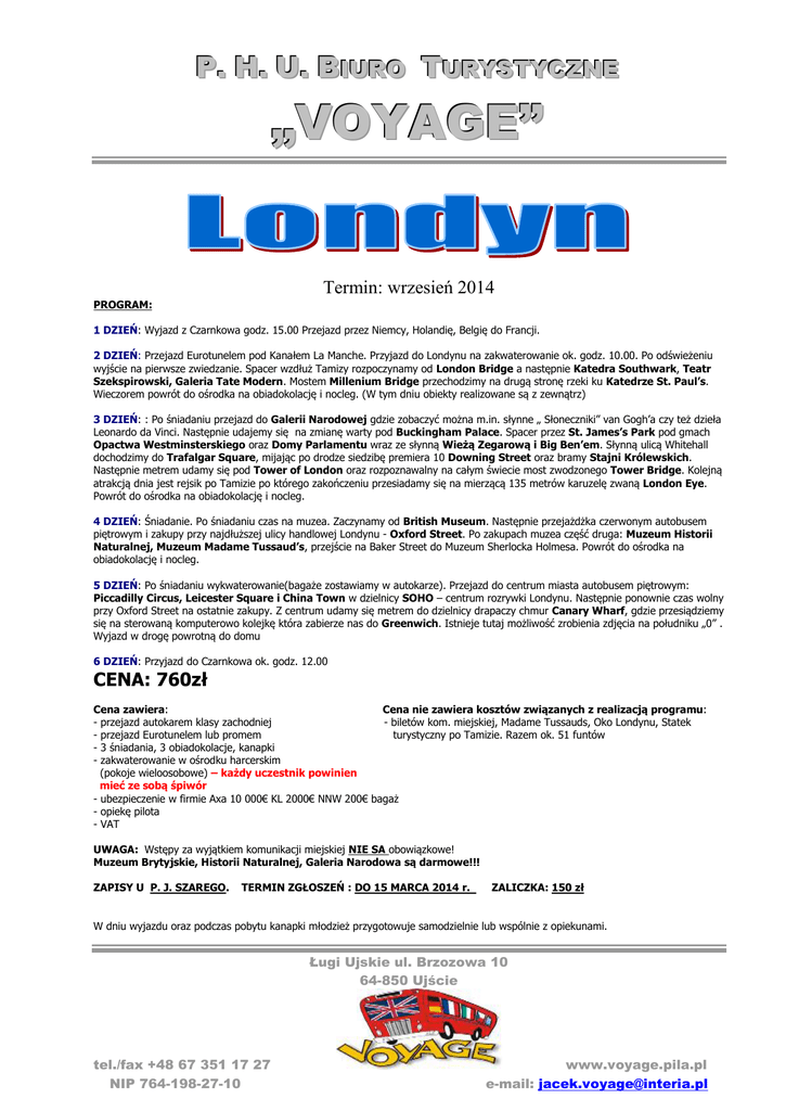 P. H. U. BIIU UR RO O TU UR RY YS ST TY YC CZ ZN NE E „VOYAGE” Termin: wrzesień 2014 PROGRAM: 1 DZIEŃ: Wyjazd z Czarnkowa godz. 15.00 Przejazd przez Niemcy, Holandię, Belgię do Francji. 2 DZIEŃ: Przejazd Eurotunelem pod Kanałem La Manche. Przyjazd do Londynu na zakwaterowanie ok. godz. 10.00. Po odświeżeniu wyjście na pierwsze zwiedzanie. Spacer wzdłuż Tamizy rozpoczynamy od London Bridge a następnie Katedra Southwark, Teatr Szekspirowski, Galeria Tate Modern. Mostem Millenium Bridge przechodzimy na drugą stronę rzeki ku Katedrze St. Paul’s. Wieczorem powrót do ośrodka na obiadokolację i nocleg. (W tym dniu obiekty realizowane są z zewnątrz) 3 DZIEŃ: : Po śniadaniu przejazd do Galerii Narodowej gdzie zobaczyć można m.in. słynne „ Słoneczniki” van Gogh’a czy też dzieła Leonardo da Vinci. Następnie udajemy się na zmianę warty pod Buckingham Palace. Spacer przez St. James’s Park pod gmach Opactwa Westminsterskiego oraz Domy Parlamentu wraz ze słynną Wieżą Zegarową i Big Ben’em. Słynną ulicą Whitehall dochodzimy do Trafalgar Square, mijając po drodze siedzibę premiera 10 Downing Street oraz bramy Stajni Królewskich. Następnie metrem udamy się pod Tower of London oraz rozpoznawalny na całym świecie most zwodzonego Tower Bridge. Kolejną atrakcją dnia jest rejsik po Tamizie po którego zakończeniu przesiadamy się na mierzącą 135 metrów karuzelę zwaną London Eye. Powrót do ośrodka na obiadokolację i nocleg. 4 DZIEŃ: Śniadanie. Po śniadaniu czas na muzea. Zaczynamy od British Museum. Następnie przejażdżka czerwonym autobusem piętrowym i zakupy przy najdłuższej ulicy handlowej Londynu - Oxford Street. Po zakupach muzea część druga: Muzeum Historii Naturalnej, Muzeum Madame Tussaud’s, przejście na Baker Street do Muzeum Sherlocka Holmesa. Powrót do ośrodka na obiadokolację i nocleg. 5 DZIEŃ: Po śniadaniu wykwaterowanie(bagaże zostawiamy w autokarze). Przejazd do centrum miasta autobusem piętrowym: Piccadilly Circus, Leicester Square i China Town w dzielnicy SOHO – centrum rozrywki Londynu. Następnie ponownie czas wolny przy Oxford Street na ostatnie zakupy. Z centrum udamy się metrem do dzielnicy drapaczy chmur Canary Wharf, gdzie przesiądziemy się na sterowaną komputerowo kolejkę która zabierze nas do Greenwich. Istnieje tutaj możliwość zrobienia zdjęcia na południku „0” . Wyjazd w drogę powrotną do domu 6 DZIEŃ: Przyjazd do Czarnkowa ok. godz. 12.00 CENA: 760zł Cena zawiera: Cena nie zawiera kosztów związanych z realizacją programu: - przejazd autokarem klasy zachodniej - biletów kom. miejskiej, Madame Tussauds, Oko Londynu, Statek - przejazd Eurotunelem lub promem turystyczny po Tamizie. Razem ok. 51 funtów - 3 śniadania, 3 obiadokolacje, kanapki - zakwaterowanie w ośrodku harcerskim (pokoje wieloosobowe) – każdy uczestnik powinien mieć ze sobą śpiwór - ubezpieczenie w firmie Axa 10 000€ KL 2000€ NNW 200€ bagaż - opiekę pilota - VAT UWAGA: Wstępy za wyjątkiem komunikacji miejskiej NIE SA obowiązkowe! Muzeum Brytyjskie, Historii Naturalnej, Galeria Narodowa są darmowe!!! ZAPISY U P. J. SZAREGO. TERMIN ZGŁOSZEŃ : DO 15 MARCA 2014 r. ZALICZKA: 150 zł W dniu wyjazdu oraz podczas pobytu kanapki młodzież przygotowuje samodzielnie lub wspólnie z opiekunami. Ługi Ujskie ul. Brzozowa 10 64-850 Ujście tel./fax +48 67 351 17 27 NIP 764-198-27-10 www.voyage.pila.pl e-mail: [email protected]