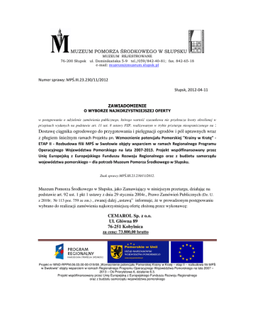 MUZEUM POMORZA ŚRODKOWEGO W SŁUPSKU MUZEUM REJESTROWANE 76-200 Słupsk ul. Dominikańska 5-9 tel./059/842-40-81; fax. 842-65-18 e-mail: [email protected] Numer sprawy: MPŚ.III.23.230/11/2012 Słupsk, 2012-04-11 ZAWIADOMIENIE O WYBORZE NAJKORZYSTNIEJSZEJ OFERTY w postępowaniu o udzielenie zamówienia publicznego, którego wartość szacunkowa nie przekracza kwoty określonej w przepisach wydanych na podstawie art. 11 ust. 8 ustawy PZP, realizowanym w trybie przetargu nieograniczonego na : Dostawę ciągnika ogrodowego do przygotowania i pielęgnacji ogrodów i pól uprawnych wraz z pługiem śnieżnym ramach Projektu pn. Wzmocnienie potencjału Pomorskiej "Krainy w Kratę" - ETAP II - Rozbudowa filii MPŚ w Swołowie objęty wsparciem w ramach Regionalnego Programu Operacyjnego Województwa Pomorskiego na lata 2007-2013. Projekt współfinansowany przez Unię Europejską z Europejskiego Funduszu Rozwoju Regionalnego oraz z budżetu samorządu województwa pomorskiego – dla potrzeb Muzeum Pomorza Środkowego w Słupsku. Znak sprawy:MPŚ.III.23.230/11/2012. Muzeum Pomorza Środkowego w Słupsku, jako Zamawiający w niniejszym przetargu, działając na podstawie art. 92 ust. 1 pkt 1 ustawy z dnia 29 stycznia 2004r., Prawo Zamówień Publicznych (Dz. U. z 2010r; Nr 113 poz. 759 ze zm.) , zwanej dalej „ustawą” informuje, że w prowadzonym postępowaniu wybrano do realizacji zamówienia najkorzystniejszą ofertę złożoną przez wykonawcę: CEMAROL Sp. z o.o. Ul. Główna 89 76-251 Kobylnica za cenę: 73.800,00 brutto Projekt nr WND-RPPM.06.03.00-00-019/08 „Wzmocnienie potencjału Pomorskiej Krainy w Kratę – etap II – rozbudowa filii MPŚ w Swołowie” objęty wsparciem w ramach Regionalnego Programu Operacyjnego Województwa Pomorskiego na lata 2007 – 2013 – Oś Priorytetowa 6, działanie 6.3. Projekt współfinansowany przez Unię Europejską z Europejskiego Funduszu Rozwoju Regionalnego oraz z budżetu samorządu województwa pomorskiego Wybrana oferta uzyskała największą ilość punktów (100%), określonym w SIWZ oraz wzorem: zgodnie z kryterium oceny ofert Cena = cena oferty z najniższą ceną: cena oferty badanej x 100 Wybrany wykonawca obowiązany jest skontaktować się z Zamawiającym w sprawie podpisania umowy w terminie do 17 kwietnia 2012r. Podstawą prawną dokonanego wyboru jest art. 91 ust. 1 Pzp oraz Kodeks cywilny Wyniki streszczenia oceny i porównania złożonych ofert Nr oferty 1 Nazwa i adres Wykonawcy, który Cena oferty Liczba pkt w kryterium cena złożył ofertę CEMAROL Sp. z o.o. Razem punktacja CENA 73.800,00 (brutto) 100% 100% 76-251 Kobylnica Ul. Główna 89 2. Działając na podstawie art. 92 ust. 1 pkt. 2 Prawa zamówień publicznych Zamawiający informuje, że w prowadzonym postępowaniu nie zostały odrzucone żadne oferty. 3. Działając na podstawie art. 92 ust. 1 pkt. 3 Prawa zamówień publicznych Zamawiający informuje, że w prowadzonym postępowaniu nie zostali wykluczeni żadni wykonawcy. 4. Działając na podstawie art. 92 ust. 1 pkt. 4 Prawa zamówień publicznych Zamawiający informuje, że podpisanie umowy z wyłonionym wykonawcą możliwe będzie po dopełnieniu wszelkich formalności w terminie 17.04.2012r. Środki Ochrony prawnej Od niniejszej decyzji zamawiającego, wykonawcy przysługują środki ochrony prawnej ( Odwołanie , Skarga do Sądu) wobec czynności: 1) Wykluczenia wykonawcy z postępowania o udzielenie zamówienia; 2) Odrzucenia oferty wykonawcy W pozostałych przypadkach odwołanie nie przysługuje. Wykonawca może w terminie przewidzianym do wniesienia odwołania poinformować zamawiającego o: 1) niezgodnej z przepisami ustawy czynności podjętej przez zmawiającego w niniejszym postępowaniu, lub 2) zaniechania czynności, do której zamawiający jest zobowiązany na podstawie ustawy, na które nie przysługuje w niniejszym postępowaniu odwołanie. Termin wniesienia odwołania: 5 dni od dnia przesłania niniejszego zawiadomienia faksem lub drogą elektroniczną, lub 10 dni od dnia przesłania niniejszego zawiadomienia, jeżeli zostało ono przesłane pisemnie. Informacje dotyczące środków ochrony prawnej zafajdują się w Specyfikacji istotnych warunków zamówienia oraz w Dziale VI Prawa zamówień publicznych „Środki ochrony prawnej”, art. od 179 do 198g (t.j. Dz. U. z 2010r. Nr 113, poz. 759 z p.zm) ----------------------------------- Kierownik zamawiającego