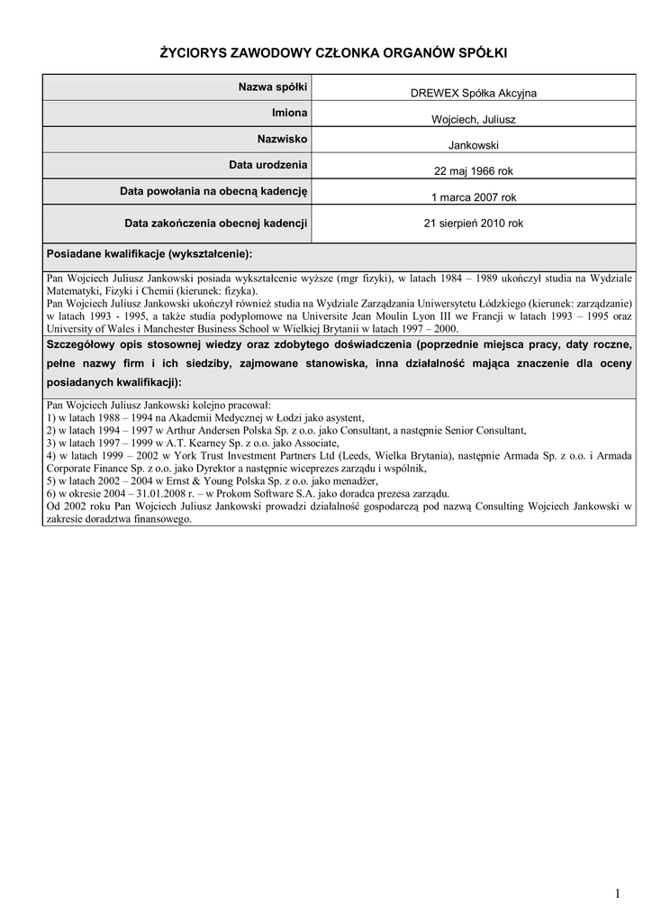 ŻYCIORYS ZAWODOWY CZŁONKA ORGANÓW SPÓŁKI Nazwa spółki Imiona Nazwisko Data urodzenia Data powołania na obecną kadencję Data zakończenia obecnej kadencji DREWEX Spółka Akcyjna Wojciech, Juliusz Jankowski 22 maj 1966 rok 1 marca 2007 rok 21 sierpień 2010 rok Posiadane kwalifikacje (wykształcenie): Pan Wojciech Juliusz Jankowski posiada wykształcenie wyższe (mgr fizyki), w latach 1984 – 1989 ukończył studia na Wydziale Matematyki, Fizyki i Chemii (kierunek: fizyka). Pan Wojciech Juliusz Jankowski ukończył również studia na Wydziale Zarządzania Uniwersytetu Łódzkiego (kierunek: zarządzanie) w latach 1993 - 1995, a także studia podyplomowe na Universite Jean Moulin Lyon III we Francji w latach 1993 – 1995 oraz University of Wales i Manchester Business School w Wielkiej Brytanii w latach 1997 – 2000. Szczegółowy opis stosownej wiedzy oraz zdobytego doświadczenia (poprzednie miejsca pracy, daty roczne, pełne nazwy firm i ich siedziby, zajmowane stanowiska, inna działalność mająca znaczenie dla oceny posiadanych kwalifikacji): Pan Wojciech Juliusz Jankowski kolejno pracował: 1) w latach 1988 – 1994 na Akademii Medycznej w Łodzi jako asystent, 2) w latach 1994 – 1997 w Arthur Andersen Polska Sp. z o.o. jako Consultant, a następnie Senior Consultant, 3) w latach 1997 – 1999 w A.T. Kearney Sp. z o.o. jako Associate, 4) w latach 1999 – 2002 w York Trust Investment Partners Ltd (Leeds, Wielka Brytania), następnie Armada Sp. z o.o. i Armada Corporate Finance Sp. z o.o. jako Dyrektor a następnie wiceprezes zarządu i wspólnik, 5) w latach 2002 – 2004 w Ernst & Young Polska Sp. z o.o. jako menadżer, 6) w okresie 2004 – 31.01.2008 r. – w Prokom Software S.A. jako doradca prezesa zarządu. Od 2002 roku Pan Wojciech Juliusz Jankowski prowadzi działalność gospodarczą pod nazwą Consulting Wojciech Jankowski w zakresie doradztwa finansowego. 1