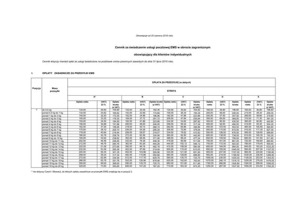 Obowiązuje od 25 czerwca 2016 roku Cennik za świadczenie usługi pocztowej EMS w obrocie zagranicznym obowiązujący dla klientów indywidualnych Cennik dotyczy również opłat za usługi świadczone na podstawie umów pisemnych zawartych do dnia 31 lipca 2015 roku. I. OPŁATY ZASADNICZE ZA PRZESYŁKI EMS OPŁATA ZA PRZESYŁKĘ (w złotych) Pozycja Masa przesyłki STREFA A* 1 do 0,5 kg ponad 0,5 kg do 1 kg ponad 1 kg do 2 kg ponad 2 kg do 3 kg ponad 3 kg do 4 kg ponad 4 kg do 5 kg ponad 5 kg do 6 kg ponad 6 kg do 7 kg ponad 7 kg do 8 kg ponad 8 kg do 9 kg ponad 9 kg do 10 kg ponad 10 kg do 11 kg ponad 11 kg do 12 kg ponad 12 kg do 13 kg ponad 13 kg do 14 kg ponad 14 kg do 15 kg ponad 15 kg do 16 kg ponad 16 kg do 17 kg ponad 17 kg do 18 kg ponad 18 kg do 19 kg ponad 19 kg do 20 kg C B Opłata netto (VAT) 23 % Opłata brutto (z VAT) Opłata netto (VAT) 23 % 130,00 134,00 140,00 145,00 150,00 156,00 162,00 170,00 178,00 186,00 194,00 202,00 212,00 222,00 232,00 245,00 258,00 272,00 286,00 300,00 320,00 29,90 30,82 32,20 33,35 34,50 35,88 37,26 39,10 40,94 42,78 44,62 46,46 48,76 51,06 53,36 56,35 59,34 62,56 65,78 69,00 73,60 159,90 164,82 172,20 178,35 184,50 191,88 199,26 209,10 218,94 228,78 238,62 248,46 260,76 273,06 285,36 301,35 317,34 334,56 351,78 369,00 393,60 132,00 142,00 152,00 164,00 182,00 200,00 218,00 236,00 259,00 272,00 302,00 332,00 362,00 392,00 422,00 452,00 482,00 512,00 552,00 590,00 640,00 30,36 32,66 34,96 37,72 41,86 46,00 50,14 54,28 59,57 62,56 69,46 76,36 83,26 90,16 97,06 103,96 110,86 117,76 126,96 135,70 147,20 * nie dotyczy Czech i Słowacji, do których opłaty zasadnicze za przesyłki EMS znajdują się w pozycji 2. Opłata brutto Opłata netto (z VAT) 162,36 174,66 186,96 201,72 223,86 246,00 268,14 290,28 318,57 334,56 371,46 408,36 445,26 482,16 519,06 555,96 592,86 629,76 678,96 725,70 787,20 134,00 158,00 182,00 208,00 234,00 258,00 282,00 308,00 334,00 360,00 388,00 416,00 444,00 472,00 500,00 530,00 560,00 590,00 620,00 660,00 710,00 E D (VAT) 23 % Opłata brutto (z VAT) Opłata netto (VAT) 23 % Opłata brutto Opłata netto (VAT) 23 % Opłata brutto (z VAT) 30,82 36,34 41,86 47,84 53,82 59,34 64,86 70,84 76,82 82,80 89,24 95,68 102,12 108,56 115,00 121,90 128,80 135,70 142,60 151,80 163,30 164,82 194,34 223,86 255,84 287,82 317,34 346,86 378,84 410,82 442,80 477,24 511,68 546,12 580,56 615,00 651,90 688,80 725,70 762,60 811,80 873,30 160,00 200,00 250,00 300,00 350,00 400,00 450,00 500,00 550,00 600,00 650,00 700,00 750,00 800,00 850,00 900,00 950,00 1000,00 1070,00 1160,00 1250,00 36,80 46,00 57,50 69,00 80,50 92,00 103,50 115,00 126,50 138,00 149,50 161,00 172,50 184,00 195,50 207,00 218,50 230,00 246,10 266,80 287,50 196,80 246,00 307,50 369,00 430,50 492,00 553,50 615,00 676,50 738,00 799,50 861,00 922,50 984,00 1045,50 1107,00 1168,50 1230,00 1316,10 1426,80 1537,50 160,00 210,00 260,00 310,00 360,00 410,00 460,00 510,00 560,00 610,00 660,00 720,00 780,00 840,00 900,00 960,00 1030,00 1100,00 1200,00 1300,00 1450,00 36,80 48,30 59,80 71,30 82,80 94,30 105,80 117,30 128,80 140,30 151,80 165,60 179,40 193,20 207,00 220,80 236,90 253,00 276,00 299,00 333,50 196,80 258,30 319,80 381,30 442,80 504,30 565,80 627,30 688,80 750,30 811,80 885,60 959,40 1033,20 1107,00 1180,80 1266,90 1353,00 1476,00 1599,00 1783,50 Pozycja Masa przesyłki OPŁATA ZA PRZESYŁKĘ (w złotych) Czechy i Słowacja Przesyłki EMS zawierające dokumenty Opłata 2 do 0,5 kg ponad 0,5 kg do 1 kg ponad 1 kg do 2 kg ponad 2 kg do 3 kg ponad 3 kg do 4 kg ponad 4 kg do 5 kg ponad 5 kg do 6 kg ponad 6 kg do 7 kg ponad 7 kg do 8 kg ponad 8 kg do 9 kg ponad 9 kg do 10 kg ponad 10 kg do 11 kg ponad 11 kg do 12 kg ponad 12 kg do 13 kg ponad 13 kg do 14 kg ponad 14 kg do 15 kg ponad 15 kg do 16 kg ponad 16 kg do 17 kg ponad 17 kg do 18 kg ponad 18 kg do 19 kg ponad 19 kg do 20 kg netto 82,00 83,00 85,00 88,00 90,00 92,00 94,00 96,00 98,00 100,00 102,00 104,00 106,00 108,00 110,00 112,00 114,00 116,00 118,00 120,00 123,00 Przesyłki EMS zawierające dokumenty i towary lub tylko towary (VAT) 23 % Opłata brutto (z VAT) Opłata netto (VAT) 23 % Opłata brutto (z VAT) 18,86 19,09 19,55 20,24 20,70 21,16 21,62 22,08 22,54 23,00 23,46 23,92 24,38 24,84 25,30 25,76 26,22 26,68 27,14 27,60 28,29 100,86 102,09 104,55 108,24 110,70 113,16 115,62 118,08 120,54 123,00 125,46 127,92 130,38 132,84 135,30 137,76 140,22 142,68 145,14 147,60 151,29 92,00 93,00 95,00 97,00 99,00 101,00 104,00 106,00 108,00 110,00 112,00 114,00 116,00 118,00 120,00 122,00 124,00 126,00 128,00 130,00 132,00 21,16 21,39 21,85 22,31 22,77 23,23 23,92 24,38 24,84 25,30 25,76 26,22 26,68 27,14 27,60 28,06 28,52 28,98 29,44 29,90 30,36 113,16 114,39 116,85 119,31 121,77 124,23 127,92 130,38 132,84 135,30 137,76 140,22 142,68 145,14 147,60 150,06 152,52 154,98 157,44 159,90 162,36 II. OPŁATY ZA SPECJALNE RODZAJE PRZESYŁEK EMS Pozycja 3 Opłata netto (VAT) 23 % Opłata brutto (z VAT) 100,00 75,00 23,00 17,25 123,00 92,25 120,00 27,60 147,60 80,00 18,40 98,40 85,00 19,55 104,55 Document Pack (przesyłka o masie do 0,5 kg): 1) nadawany do wszystkich krajów, z wyjątkiem Czech i Słowacji 2) nadawany do Czech lub Słowacji** 4 Opłata za przesyłkę (w złotych) Rodzaj przesyłki EMS Kilo Pack (przesyłka o masie do 1 kg): 1) nadawany do wszystkich krajów, z wyjątkiem Czech i Słowacji 2) nadawany do Czech lub Słowacji z zawartością tylko dokumentów** 3) nadawany do Czech lub Słowacji z zawartością dokumentów i towarów lub tylko towarów** UWAGI: 1. Przesyłki ,,Document Pack" i ,,Kilo Pack" przyjmowane są wyłącznie w specjalnych kopertach. 2. Uiszczenie opłaty za koperty ,,Document Pack" i ,,Kilo Pack" jest równoznaczne z opłaceniem usługi. 3. Koperty ,,Document Pack" i ,,Kilo Pack" można nabywać w placówkach pocztowych wytypowanych do przyjmowania przesyłek EMS i u kuriera. ** Klient może skorzystać z obniżonych opłat przy wysyłaniu przesyłek „Document Pack” lub „Kilo Pack” do Czech lub Sł