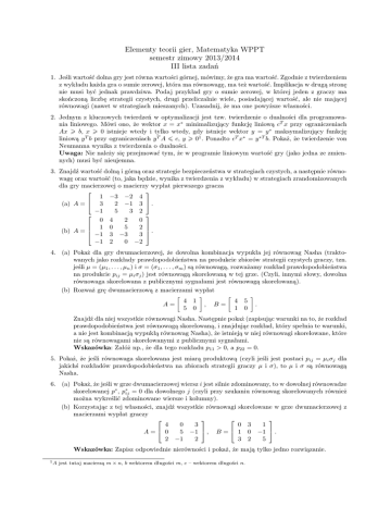 Elementy teorii gier, Matematyka WPPT semestr zimowy 2013/2014