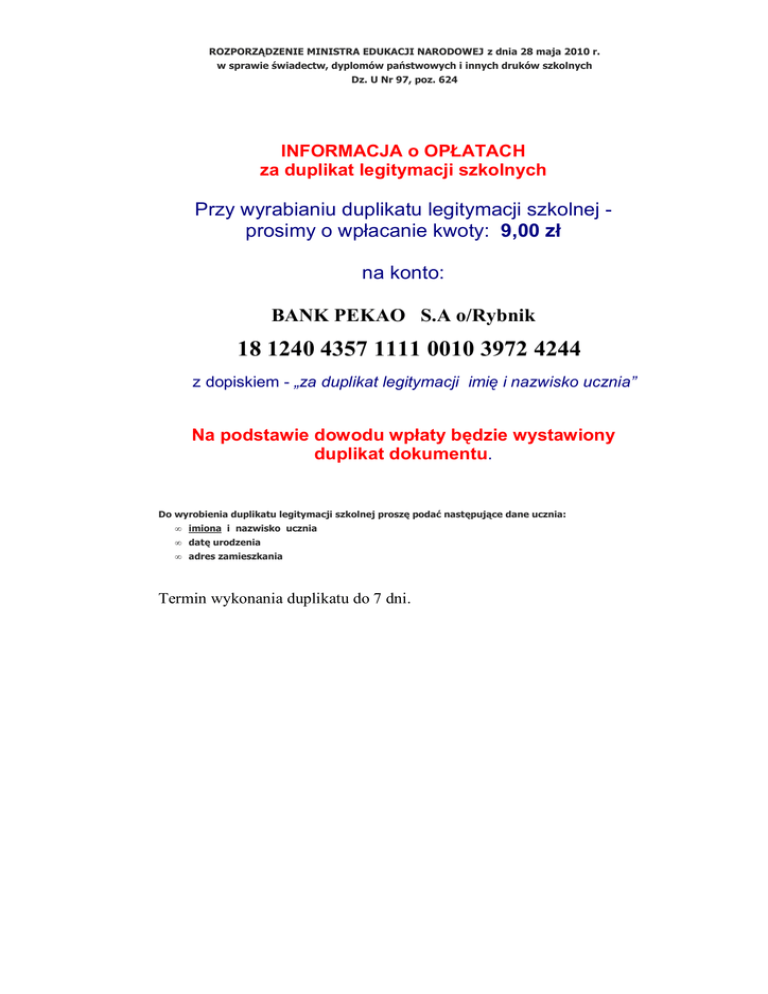 ROZPORZĄDZENIE MINISTRA EDUKACJI NARODOWEJ z dnia 28 maja 2010 r. w sprawie świadectw, dyplomów państwowych i innych druków szkolnych Dz. U Nr 97, poz. 624 INFORMACJA o OPŁATACH za duplikat legitymacji szkolnych Przy wyrabianiu duplikatu legitymacji szkolnej prosimy o wpłacanie kwoty: 9,00 zł na konto: BANK PEKAO S.A o/Rybnik 18 1240 4357 1111 0010 3972 4244 z dopiskiem - „za duplikat legitymacji imię i nazwisko ucznia” Na podstawie dowodu wpłaty będzie wystawiony duplikat dokumentu. Do wyrobienia duplikatu legitymacji szkolnej proszę podać następujące dane ucznia: • imiona i nazwisko ucznia • datę urodzenia • adres zamieszkania Termin wykonania duplikatu do 7 dni. ROZPORZĄDZENIE MINISTRA EDUKACJI NARODOWEJ1) z dnia 28 maja 2010 r. w sprawie świadectw, dyplomów państwowych i innych druków szkolnych Procedura wydawania duplikatów legitymacji szkolnej, karty rowerowej, świadectwa szkolnego i pobierania opłat za te czynności w Szkole Podstawowej Nr 10 im Janusza Korczaka w Wodzisławiu Śl. Podstawa prawna: ROZPORZĄDZENIE MINISTRA EDUKACJI NARODOWEJ1) z dnia 28 maja 2010 r. w sprawie świadectw, dyplomów państwowych i innych druków szkolnych 3. Za wydanie duplikatu świadectwa, odpisu świadectwa dojrzałości, odpisu aneksu do świadectwa dojrzałości, dyplomu, zaświadczenia i indeksu oraz za legalizację dokumentu przeznaczonego do obrotu prawnego z zagranicą pobiera się opłatę w wysokości równej kwocie opłaty skarbowej od legalizacji dokumentu. Za wydanie duplikatu legitymacji szkolnej lub legitymacji przedszkolnej dla dziecka niepełnosprawnego pobiera się opłatę w wysokości równej kwocie opłaty skarbowej od poświadczenia własnoręczności podpisu. Opłatę wnosi się na rachunek bankowy wskazany odpowiednio przez dyrektora przedszkola, szkoły lub komisji okręgowej, kuratora oświaty albo inny organ dokonujący odpowiedniej czynności. I. Zasady wydawania duplikatów legitymacji szkolnej. 1. W przypadku utraty oryginału legitymacji szkolnej rodzice ucznia mogą wystąpić do dyrektora szkoły z pisemnym wnioskiem o wydanie duplikatu legitymacji szkolnej z podaniem przyczyny ubiegania się o duplikat. 2. Do wniosku naleŜy dołączyć podpisane aktualne zdjęcie legitymacyjne (nazwisko i imię, data urodzenia) oraz dowód wpłaty 3. Za wydanie duplikatu legitymacji szkolnej pobiera się opłatę w wysokości równej kwocie opłaty skarbowej od poświadczenia własnoręczności podpisu tj. 9 zł. 4. Termin wykonania duplikatu do 7 dni. II. Zasady wydawania duplikatów karty rowerowej. 1. W przypadku utraty oryginału karty rowerowej rodzice ucznia mogą wystąpić do dyrektora szkoły z pisemnym wnioskiem (podaniem) o wydanie duplikatu karty rowerowej z podaniem przyczyny ubiegania się o duplikat. 2. Do wniosku naleŜy dołączyć podpisane aktualne zdjęcie (nazwisko i imię, data urodzenia). 3. Za wydanie duplikatu karty rowerowej nie pobiera się opłaty. 4. Termin wykonania duplikatu do 7 dni.