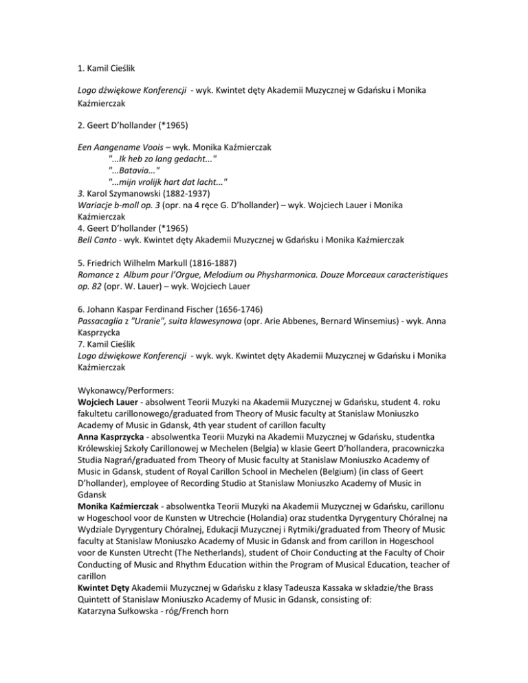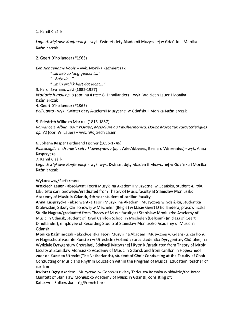 1. Kamil Cieślik Logo dźwiękowe Konferencji - wyk. Kwintet dęty Akademii Muzycznej w Gdańsku i Monika Kaźmierczak 2. Geert D’hollander (*1965) Een Aangename Voois – wyk. Monika Kaźmierczak "...Ik heb zo lang gedacht..." "...Batavia..." "...mijn vrolijk hart dat lacht..." 3. Karol Szymanowski (1882-1937) Wariacje b-moll op. 3 (opr. na 4 ręce G. D’hollander) – wyk. Wojciech Lauer i Monika Kaźmierczak 4. Geert D’hollander (*1965) Bell Canto - wyk. Kwintet dęty Akademii Muzycznej w Gdańsku i Monika Kaźmierczak 5. Friedrich Wilhelm Markull (1816-1887) Romance z Album pour l’Orgue, Melodium ou Physharmonica. Douze Morceaux caracteristiques op. 82 (opr. W. Lauer) – wyk. Wojciech Lauer 6. Johann Kaspar Ferdinand Fischer (1656-1746) Passacaglia z "Uranie", suita klawesynowa (opr. Arie Abbenes, Bernard Winsemius) - wyk. Anna Kasprzycka 7. Kamil Cieślik Logo dźwiękowe Konferencji - wyk. wyk. Kwintet dęty Akademii Muzycznej w Gdańsku i Monika Kaźmierczak Wykonawcy/Performers: Wojciech Lauer - absolwent Teorii Muzyki na Akademii Muzycznej w Gdańsku, student 4. roku fakultetu carillonowego/graduated from Theory of Music faculty at Stanislaw Moniuszko Academy of Music in Gdansk, 4th year student of carillon faculty Anna Kasprzycka - absolwentka Teorii Muzyki na Akademii Muzycznej w Gdańsku, studentka Królewskiej Szkoły Carillonowej w Mechelen (Belgia) w klasie Geert D’hollandera, pracowniczka Studia Nagrań/graduated from Theory of Music faculty at Stanislaw Moniuszko Academy of Music in Gdansk, student of Royal Carillon School in Mechelen (Belgium) (in class of Geert D’hollander), employee of Recording Studio at Stanislaw Moniuszko Academy of Music in Gdansk Monika Kaźmierczak - absolwentka Teorii Muzyki na Akademii Muzycznej w Gdańsku, carillonu w Hogeschool voor de Kunsten w Utrechcie (Holandia) oraz studentka Dyrygentury Chóralnej na Wydziale Dyrygentury Chóralnej, Edukacji Muzycznej i Rytmiki/graduated from Theory of Music faculty at Stanislaw Moniuszko Academy of Music in Gdansk and from carillon in Hogeschool voor de Kunsten Utrecht (The Netherlands), student of Choir Conducting at the Faculty of Choir Conducting of Music and Rhythm Education within the Program of Musical Education, teacher of carillon Kwintet Dęty Akademii Muzycznej w Gdańsku z klasy Tadeusza Kassaka w składzie/the Brass Quintett of Stanislaw Moniuszko Academy of Music in Gdansk, consisting of: Katarzyna Sułkowska - róg/French horn Radosław Gdula - puzon basowy/bass trombone Krzysztof Gudelun - puzon/trombone Kamil Kruczkowski - trąbka/trumpet Emil Miszk - trąbka/trumpet O programie: Pierwszy utwór, autorstwa Kamila Cieślika, to zwycięzca konkursu na logo dźwiękowe konferencji. Kolejny utwór napisał znany belgijski kompozytor i carillonista, Geert D’hollander. Een Aangename Voois, fantazja na carillon solo w trzech częściach, jest zwycięzcą konkursu kompozytorskiego z 2002 roku w Hoorn (Holandia). Oparta jest na XVII-wiecznej niderlandzkiej piosence „Przyjemna podróż” (Podróż do Indii Wschodnich). W programie odnaleźć można również słynne Wariacje b-moll Karola Szymanowskiego w nietypowym opracowaniu na carillon na cztery ręce. Jest to młodzieńczy utwór wielkiego polskiego kompozytora. Bell canto Geerta D’hollandera to utwór napisany z okazji 500-letniej rocznicy powstania carillonu, która miała miejsce w zeszłym roku. Z kolei Friedrich Wilhelm Markull to XIX-wieczny organista i kompozytor z kościoła Mariackiego w Gdańsku, autor wielu kompozycji organowych, także symfonii. Johann Casper Ferdinand Fischer urodził się w Niemczech około 1670. Świetny klawesynista, który wprowadził francuskie elementy do niemieckiej muzyki. Najbardziej znane dzieło Musicalischer Parnassus reprezentuje fuzję stylu francuskiego i niemieckiego. Program notes The first piece of today's concert is composed by a student of composition, Kamil Cieślik, as a sound logo of the Conference. This piece was selected as a winner of the composition competition. Geert D'hollander is a Belgian composer and carillonist, a winner of many composition and interpretation competitions. His Een Aangename Voois is a 3-part fantasia, written for the city of Hoorn (Holland) in 2002, winner of a composition contest. It is based on 17th century Dutch song called "The Pleasant Journey" (A Journey to East India). Karol Szymanowski's Piano Variations in b flat minor is an early work of a famous Polish composer, arranged here for carillon quatre-mains. Bell Canto, again by Geert D'hollander, is a piece written especially for carillon's 500th anniversary widely celebrated last year all over the world. Friedrich Wilhelm Markull was a 19th century organist of St Mary's church in Gdansk. He was also a quite famous composer, an author of many organ pieces and even some symphonies. Johann Casper Ferdinand Fischer was born in Germany around 1670. Obviously a fine harpsichordist, he was responsible for bringing a French influence into German music. Possibly his most outstanding work, the Musicalischer Parnassus represents the fusion of French and German styles. In the form of nine suites, they transform the style of French orchestral dances to the more restricted tonal scale of the harpsichord. Yet Fischer achieved works of a vivacity and piquant pleasure, many that would rival in impact and melodic invention the finest keyboard music of Scarlatti.