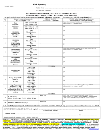 Klub Sportowy ………………………………………………………………………………………. Pieczątka Klubu Adres / kod …………………………………………………………………………………………… Tel./ faks, adres e-mailowy ……………………………………………………………………………….. POTWIERDZENIE UDZIAŁU, ZGŁOSZENIE DO ROZGRYWEK LUBELSKIEGO ZWIĄZKU PIŁKI NOŻNEJ na sezon 2014 / 2015 • w tabelę wpisujemy właściwe słowo: potwierdzamy lub zgłaszamy (zgłaszamy* - dla utworzonej w klubie nowej drużyny). L.p. 1 ŻAK rozgrywki turniejowe ORLIK 2 MŁODZIK Lubelska Liga Młodzików LLMł. MŁODZIK LIGA 3 Wojewódzka MŁODZIKÓW LWMł. 4 TRAMPKARZ Lubelskiej Ligi Trampkarzy LLTr. TRAMPKARZ LIGA 5 WPISAĆ SŁOWO potwierdzamy, zgłaszamy Kategorie wiekowe i oznaczenia wg UEFA, PZPN, LZPN Wojewódzka TRAMPKARZY LWTr. UWAGI: wpisać aktualnego szkoleniowca oraz uprawnienia i posiadaną licencję 2007 - Żak mł. - F 2 2006 - Żak st. - F 1 * Uprawnienie minimum: instruktor sportu - piłka nożna, PZPN C Licencja: PZPN C - wpisać nr licencji 2005 - Orlik mł. - E 2 2004 - Orlik st. - E 1 * j/w 2003 Młodzik młodszy D2 2002 Młodzik starszy D1 2003 Młodzik młodszy D2 2002 Młodzik starszy D1 2001 Trampkarz młodszy C2 2000 Trampkarz starszy C1 2001 Trampkarz młodszy C2 2000 Trampkarz starszy C1 * j/w * j/w * j/w * j/w * Uprawnienie minimum: instruktor sportu - piłka nożna, UEFA B Licencja: PZPN B – wpisać nr licencji * j/w * j/w * j/w 1999 – 1998 * j/w * j/w * j/w * j/w ** Uprawnienie minimum: trener II klasy piłki nożnej, UEFA A Licencja: PZPN A – wpisać nr licencji ** j/w JUNIORZY Junior młodszy 6 7 Lubelska Liga Juniorów II Liga Wojewódzka Juniorów II LWJ 8 I Liga Wojewódzka Juniorów - I LWJ Liga Makroregionalna Juniorów Mł. - LMJ Mł. Centralna Liga Juniorów CLJ St. B2–B1 1997 – 1996 Junior starszy A2–A1 1999-1998 Junior młodszy B1–B2 1997 – 1996 Junior starszy A2–A1 1999 – 1998 Junior młodszy B2–B1 1997 – 1996 Junior starszy A2–A1 SENIORZY 9 I DRUŻYNA Klasa: B, A, O, Liga: IV, III , kobiety III liga 10 DRUŻYNA REZERW, Klasa/Liga Klasa/ Liga III, IV Liga – minimum trener II klasy piłki nożnej, UEFA A Licencja: PZPN A – wpisać nr licencji/pozostałe: : instruktor sportu - piłka nożna, UEFA B. Licencja: PZPN B – wpisać nr licencji Klasa/Liga j/w ** Do wszystkich pozycji rozgrywek młodzieżowych zgłoszenia i uprawnienia zawodników młodszych wg opracowanego druku/zmiana kategorii wiekowej - na s. 2014/15 Z UPOWAŻNIENIA ZARZĄDU KLUBU druk wypełnił ………………………………………………………………………………………………………………. /Nazwisko Imię, funkcja/ podpis Tel. kont / e-mail …………………………………………………………………………………. ………………………………….. data …………………..……… Dodatkowa osoba do kontaktu z LZPN - działacz klubu / tel./ POZYCJA: 2,4,6 DOTYCZY LUBLINA (wg obszaru jak dla kl. okręgowej lubelskiej-10 powiatów). Wszystkie zgłoszenia – potwierdzenia wg REGULAMINU ROZGRYWEK . POTWIERDENIE I ZGŁOSZENIE UZASADNIONE jak w tekście poniżej. Nowe regulaminy na s. 2014/15 w lipcu br. Pozycja 1. – kat. Żak, Orlik - system turniejowy prowadzony przez Lubelski Związek. Turnieje odbywają się w dni wolne od nauki. Organizatorami zawodów są wyznaczone kluby ,,lubelskie’’. TERMIN ZGŁOSZEŃ -III, IV liga, kl. O, ligi wojewódzkie młodzieżowe - do 25.06.br.; pozostałe klasy/ligi 30.06.2014 r. Do lig wojewódzkich potwierdzamy udział drużyn grających już w ligach w s. 2013/14. Awanse z niższych lig/klas do lig wojewódzkich: a) wg regulaminów, b) mistrzów rozgrywek. W ligach woj. LWTr., LWM – preferowany udział pełnych par drużyn klubowych lub odległość w km różnych drużyn i organizacją meczów w jednym miejscu. PROSIMY O TERMINOWE DOSTARCZENIE WYPEŁNIONEGO DRUKU. MOŻNA WYSŁAĆ FAKSEM 81-743 46 40 (CZYNNY CAŁĄ DOBĘ) LUB MAILEM [email protected]