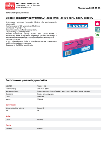 PBS Connect Polska Sp. z o.o. ul. Annopol 3, 03-236 Warszawa www.pbspolska.eu Warszawa, 2017-03-03 Karta katalogowa produktu: Bloczek samoprzylepny DONAU, 38x51mm, 3x100 kart., neon, różowy Uniwersalne kolorowe karteczki, idealne do przekazywania wiadomości Ilość karteczek: 3x100 w rozmiarze 38x51mm Gramatura: 70gsm (+/- 4%) Klej umieszczony wzdłuż dłuższego boku Klej usuwalny za pomocą wody Posiada oznaczenie Zielony Punkt" (Der Grüne Punkt) oznaczający udział w systemie recyklingu systemie recyklingu i odzysku odpadów wynikający z przepisów prawa polskiego i UE Kolor neon różowy 3 szt. zabezpieczone folią z charakterystycznym czerwonym paskiem ułatwiającym otwieranie Opakowanie (3x100 karteczek) w j.s. Podstawowe parametry produktu SKU PBS 7585011-16 Kod kreskowy 5901503675847 Nazwa produktu Bloczek samoprzylepny DONAU, 38x51mm, 3x100 kart., neon, różowy Kategoria Bloczki samoprzylepne Klasa Premium Marka DONAU Certyfikaty Nowy produkt w ofercie Standard Hit Hit Kolor Kolor Różowy Cecha Produkt Bloczek PBS Connect Polska Sp. z o.o. ul. Annopol 3, 03-236 Warszawa www.pbspolska.eu Warszawa, 2017-03-03 Karta katalogowa produktu cd. Bloczek samoprzylepny DONAU, 38x51mm, 3x100 kart., neon, różowy Podstawowe parametry produktu Typ Neon Kształt Prostokąt Materiał Papier W ofercie od 2015-12 Wymiary Gramatura (g/m2) 70 ± 4% Wymiary (mm) 38x51 Ilość Ilość kartek 3x100 Wspólny słownik zamówień CPV 22816300-6 Bloczki samoprzylepnych karteczek na notatki Jednostki logistyczne Opakowanie 1 36 op Opakowanie 2 144 op