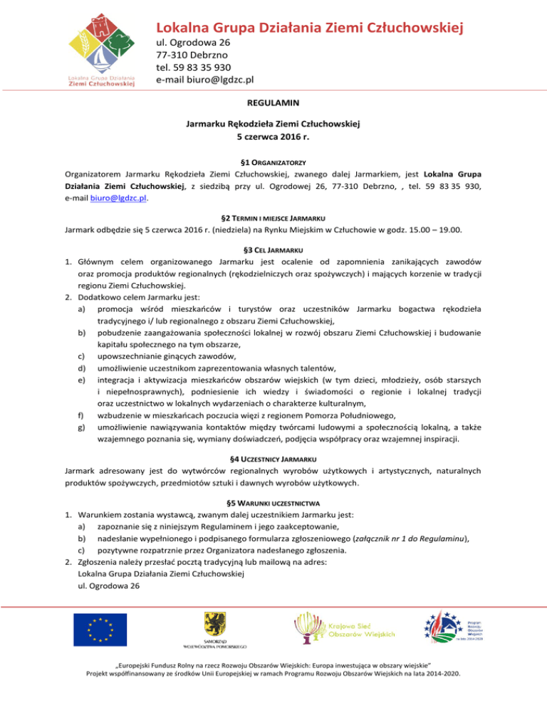 Lokalna Grupa Działania Ziemi Człuchowskiej ul. Ogrodowa 26 77-310 Debrzno tel. 59 83 35 930 e-mail [email protected] REGULAMIN Jarmarku Rękodzieła Ziemi Człuchowskiej 5 czerwca 2016 r. §1 ORGANIZATORZY Organizatorem Jarmarku Rękodzieła Ziemi Człuchowskiej, zwanego dalej Jarmarkiem, jest Lokalna Grupa Działania Ziemi Człuchowskiej, z siedzibą przy ul. Ogrodowej 26, 77-310 Debrzno, , tel. 59 83 35 930, e-mail [email protected]. §2 TERMIN I MIEJSCE JARMARKU Jarmark odbędzie się 5 czerwca 2016 r. (niedziela) na Rynku Miejskim w Człuchowie w godz. 15.00 – 19.00. §3 CEL JARMARKU 1. Głównym celem organizowanego Jarmarku jest ocalenie od zapomnienia zanikających zawodów oraz promocja produktów regionalnych (rękodzielniczych oraz spożywczych) i mających korzenie w tradycji regionu Ziemi Człuchowskiej. 2. Dodatkowo celem Jarmarku jest: a) promocja wśród mieszkańców i turystów oraz uczestników Jarmarku bogactwa rękodzieła tradycyjnego i/ lub regionalnego z obszaru Ziemi Człuchowskiej, b) pobudzenie zaangażowania społeczności lokalnej w rozwój obszaru Ziemi Człuchowskiej i budowanie kapitału społecznego na tym obszarze, c) upowszechnianie ginących zawodów, d) umożliwienie uczestnikom zaprezentowania własnych talentów, e) integracja i aktywizacja mieszkańców obszarów wiejskich (w tym dzieci, młodzieży, osób starszych i niepełnosprawnych), podniesienie ich wiedzy i świadomości o regionie i lokalnej tradycji oraz uczestnictwo w lokalnych wydarzeniach o charakterze kulturalnym, f) wzbudzenie w mieszkańcach poczucia więzi z regionem Pomorza Południowego, g) umożliwienie nawiązywania kontaktów między twórcami ludowymi a społecznością lokalną, a także wzajemnego poznania się, wymiany doświadczeń, podjęcia współpracy oraz wzajemnej inspiracji. §4 UCZESTNICY JARMARKU Jarmark adresowany jest do wytwórców regionalnych wyrobów użytkowych i artystycznych, naturalnych produktów spożywczych, przedmiotów sztuki i dawnych wyrobów użytkowych. §5 WARUNKI UCZESTNICTWA 1. Warunkiem zostania wystawcą, zwanym dalej uczestnikiem Jarmarku jest: a) zapoznanie się z niniejszym Regulaminem i jego zaakceptowanie, b) nadesłanie wypełnionego i podpisanego formularza zgłoszeniowego (załącznik nr 1 do Regulaminu), c) pozytywne rozpatrznie przez Organizatora nadesłanego zgłoszenia. 2. Zgłoszenia należy przesłać pocztą tradycyjną lub mailową na adres: Lokalna Grupa Działania Ziemi Człuchowskiej ul. Ogrodowa 26 „Europejski Fundusz Rolny na rzecz Rozwoju Obszarów Wiejskich: Europa inwestująca w obszary wiejskie” Projekt współfinansowany ze środków Unii Europejskiej w ramach Programu Rozwoju Obszarów Wiejskich na lata 2014-2020. Lokalna Grupa Działania Ziemi Człuchowskiej ul. Ogrodowa 26 77-310 Debrzno tel. 59 83 35 930 e-mail [email protected] 3. 4. 5. 6. 7. 8. 9. 77-310 Debrzno lub [email protected] Termin przesłania zgłoszenia upływa 30 maja 2016 r. (liczy się data wpływu zgłoszenia do Organizatora). Liczba Uczestników jest ograniczona. Podczas Jarmarku przewidziane zostały stoiska dla 20 Uczestników. Istnieje możliwość przyjazdu z osobą towarzyszącą/ wspierającą, w związku z tym na jednym stoisku po stronie Uczestnika mogą przebywać dwie osoby. Organizator zastrzega sobie prawo do wyboru określonego wystawcy ze względu na ograniczony limit miejsc na Jarmarku. Uczestnik Jarmarku może zgłosić Organizatorowi w formie pisemnej rezygnację z uczestnictwa w wydarzeniu do dnia 1 czerwca 2016 r. W przypadku rezygnacji z uczestnictwa zgłoszonej po 1 czerwca 2016 r. lub nie stawienia się w dniu Jarmarku bez wcześniejszego powiadomienia Organizatora, Uczestnik zobowiązany jest do zwrotu wszystkich poniesionych przez Organizatora kosztów, związanych z udziałem Uczestnika w Jarmarku. Organizator do dnia 31 maja 2016 r. dokona wyboru Uczestników, którym udostępnione zostaną miejsca wystawowe. Wybrani Uczestnicy poinformowani zostaną drogą elektroniczną i/ lub telefonicznie na wskazany w formularzu zgłoszeniowym numer telefonu i/ lub adres e-mail. Dane osobowe zawarte w formularzu nie będą przekazywane i służą wyłącznie do celów związanych z działaniami organizacyjnymi Jarmarku. Wykorzystane zostaną do zaproszeń, informacji w materiałach reklamowych, itp. Uczestnik przesyłając formularz zgłoszeniowy, wyraża zgodę na zamieszczanie zdjęć i filmów prezentujących jego wizerunek i stoisko, w związku z relacjami z Jarmarku, na stronach internetowych bez jakichkolwiek zobowiązań wobec Organizatora lub osób trzecich. §6 MIEJSCE WYSTAWOWE 1. Organizator udostępni Uczestnikom stoiska wystawowe, wyposażone w stoły oraz krzesła. 2. Uczestnik we własnym zakresie zapewnia wystrój stoiska oraz inne niż wyminione w pkt. 1 elementy niezbędne do ekspozycji swoich produktów. 3. Ekspozycja stoiska powinna się mieścić w obrębie miejsca wystawowego. 4. Zabrania się destrukcyjnej ingerencji w elementy stoisk (wiercenie, przybijanie). W przypadku stosowania nieodpowiednich materiałów mocujących, Uczestnik zostanie obciążony kosztami naprawy stoiska. 5. Osoby nie będące Uczestnikami, nie posiadające zgody Orgnizatora, a wystawiające swoje produkty, będą usuwane z miejsca Jarmarku przez osoby upoważnione przez Organizatora. 6. Organizator ma prawo do wyłączenia z udziału stoiska/ towaru, który według niego nie jest zgodny z charakterem Jarmarku. 1. 2. 3. 4. §7 WARUNKI TECHNICZNO-ORGANIZACYJNE Uczestnik zorganizuje swoje stoisko w miejscu wyznaczonym i wskazanym przez Organizatora. Uczestnik jest zobowiązany do przybycia na miejsce odbywania się Jarmarku co najmniej na 30 minut przed rozpoczęciem, w celu przygotowania ekspozycji na stoisku. Po przybyciu Uczestnik zgłasza się na stoisko Organizatora. Uczestnik zobowiązany jest do utrzymania stoiska w godzinach 15.00 – 19.00. Ewentualne zmiany dotyczące godzin prowadzenia stoiska muszą być ustalane z