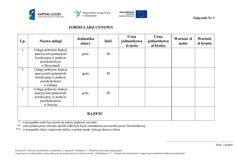 Załącznik Nr 3 FORMULARZ CENOWY Lp. Nazwa usługi 1. Usługa pełnienia funkcji nauczyciela gimnastyki korekcyjnej w punkcie przedszkolnym w Brzezinach Usługa pełnienia funkcji nauczyciela gimnastyki korekcyjnej w punkcie przedszkolnym w Gliniku Usługa pełnienia funkcji nauczyciela gimnastyki korekcyjnej w punkcie przedszkolnym w Nawsiu 2. 3. Jednostka miary ilość godz. 80 godz. 80 godz. 80 Cena jednostkowa zł netto Cena jednostkowa zł brutto Wartość zł netto Wartość zł brutto RAZEM * w przypadku osób fizycznych nie należy podawać cen netto ** cena podana przez oferenta określa całkowity koszt zatrudnienia pracownika przez Zleceniodawcę, *** w przypadku oferty częściowej należy wypełnić punkt, którego dotyczy oferta ……………………………………………. data i podpis Priorytet IX. „Rozwój wykształcenia i kompetencji w regionach”, Działanie 9.1 „Wyrównywanie szans edukacyjnych i zapewnienie wysokiej jakości usług edukacyjnych świadczonych w systemie oświaty”, Poddziałanie 9.1.1. „Zmniejszenie nierówności w stopniu upowszechniania edukacji przedszkolnej”