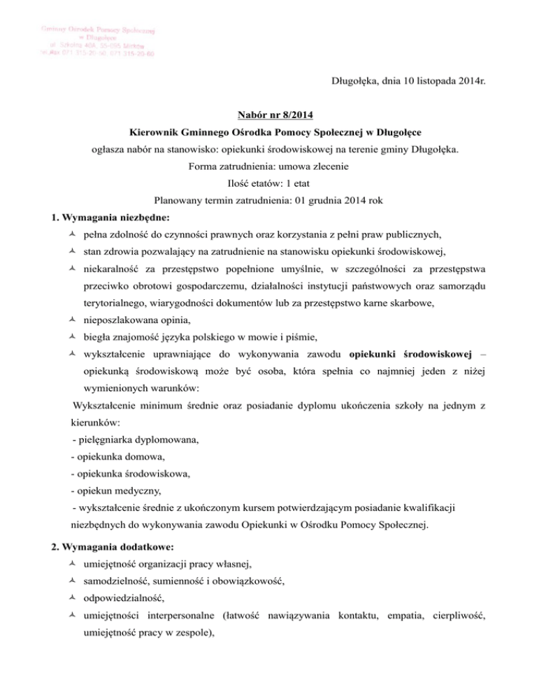 Długołęka, dnia 10 listopada 2014r. Nabór nr 8/2014 Kierownik Gminnego Ośrodka Pomocy Społecznej w Długołęce ogłasza nabór na stanowisko: opiekunki środowiskowej na terenie gminy Długołęka. Forma zatrudnienia: umowa zlecenie Ilość etatów: 1 etat Planowany termin zatrudnienia: 01 grudnia 2014 rok 1. Wymagania niezbędne: pełna zdolność do czynności prawnych oraz korzystania z pełni praw publicznych, stan zdrowia pozwalający na zatrudnienie na stanowisku opiekunki środowiskowej, niekaralność za przestępstwo popełnione umyślnie, w szczególności za przestępstwa przeciwko obrotowi gospodarczemu, działalności instytucji państwowych oraz samorządu terytorialnego, wiarygodności dokumentów lub za przestępstwo karne skarbowe, nieposzlakowana opinia, biegła znajomość języka polskiego w mowie i piśmie, wykształcenie uprawniające do wykonywania zawodu opiekunki środowiskowej – opiekunką środowiskową może być osoba, która spełnia co najmniej jeden z niżej wymienionych warunków: Wykształcenie minimum średnie oraz posiadanie dyplomu ukończenia szkoły na jednym z kierunków: - pielęgniarka dyplomowana, - opiekunka domowa, - opiekunka środowiskowa, - opiekun medyczny, - wykształcenie średnie z ukończonym kursem potwierdzającym posiadanie kwalifikacji niezbędnych do wykonywania zawodu Opiekunki w Ośrodku Pomocy Społecznej. 2. Wymagania dodatkowe: umiejętność organizacji pracy własnej, samodzielność, sumienność i obowiązkowość, odpowiedzialność, umiejętności interpersonalne (łatwość nawiązywania kontaktu, empatia, cierpliwość, umiejętność pracy w zespole), wysoka kultura osobista, odporność na stres, dyspozycyjność – mile widziane prawo jazdy kat. B, własny samochód osobowy. 3. Planowany zakres powierzonych wykonywanych zadań dotyczy w szczególności: Zadania główne: czynności higieniczno – pielęgnacyjne, czynności gospodarcze, czynności opiekuńcze, umiejętność dostosowania diety do stanu zdrowia i przygotowywanie podopiecznemu posiłków, prowadzenie niezbędnej dokumentacji. 4. Szczególne uprawnienia i obowiązki: kierowanie się zasadami etyki zawodowej, poszanowanie godności i prawa osób do samostanowienia, zachowanie tajemnicy służbowej, podnoszenie swoich kwalifikacji zawodowych poprzez udział w szkoleniach i samokształcenie, ochrona prawna przewidziana dla funkcjonariuszy publicznych. 5. Informacje o warunkach pracy na danym stanowisku: praca na umowę zlecenie, praca w środowisku, w miejscu zamieszkania osoby opiekowanej, urząd niedostosowany dla osób poruszających się na wózkach inwalidzkich. 6. Wymagane dokumenty aplikacyjne: 1. list motywacyjny, 2. życiorys – curriculum vitae; 3. kwestionariusz osobowy, 4. kserokopie dyplomów lub świadectw potwierdzających wykształcenie, 5. oświadczenia: a) oświadczenie o pełnej zdolności do czynności prawnych, korzystaniu z pełni praw publicznych, b) oświadczenie, że kandydat nie był skazany za przestępstwa popełnione umyślnie lub umyślne przestępstwa skarbowe, c)oświadczenie kandydata o niekaralności, d) oświadczenie o stanie zdrowia pozwalającym na podjęcie pracy na stanowisku opiekunki środowiskowej, 6. podpisana klauzula „Wyrażam zgodę na przetwarzanie moich danych osobowych zawartych w ofercie pracy dla potrzeb rekrutacji, zgodnie z ustawą z dnia 29.08.1997 r. o ochronie danych osobowych. Dz. U. z 2002 r. Nr 101, poz. 926 ze zm.” 7. Informacja o kontaktowym numerze telefonicznym oraz adresie e-mail. 8. Dokumenty dodatkowe- kserokopie: 1) ewentualnych referencji; 2) świadectw pracy; 3) zaświadczeń o ukończonych kursach i szkoleniach; 4) innych dokumentów potwierdzających przydatność do pracy na danym stanowisku. 9. Termin składania dokumentów aplikacyjnych upływa w dniu 20 listopada 2014 r. do godziny 15:30. 10. Informacje dodatkowe: Wymagane dokumenty aplikacyjne należy składać osobiście w sekretariacie Gminnego Ośrodka Pomocy Społecznej w Długołęce ( pokój nr 11) lub przesłać drogą pocztową w zaklejonych kopertach z dopiskiem: „Dotyczy naboru nr 8/2014 na stanowisko opiekunki środowiskowej w Gminnym Ośrodku Pomocy Społecznej w Długołęce”, adres 55-095 Mirków, ul. Szkolna 40A. Dokumenty aplikacyjne, które wpłyną do Gminnego Ośrodka Pomocy Społecznej w Długołęce po upływie terminu do ich składania nie będą rozpatrywane. Lista kandydatów spełniających wymagania formalne opublikowana zostanie na stronie internetowej Biuletyn Informacji Publicznej Urząd Gminy Długołęka (www.dlugoleka.bip.net.pl) oraz na tablicy informacyjnej Gminnego Ośrodka Pomocy Społecznej w Długołęce, która znajduje się w korytarzu na II piętrze. W przypadku wyłonienia kandydata na w/w stanowisko pracy, kandydat przed zawarciem stosunku pracy winien dostarczyć dokumenty w oryginale poświadczające wykształcenie, nabyte umiejętności oraz świadectwa pracy. Teresa Klimek Kierownik Gminnego Ośrodka Pomocy Społecznej w Długołęce