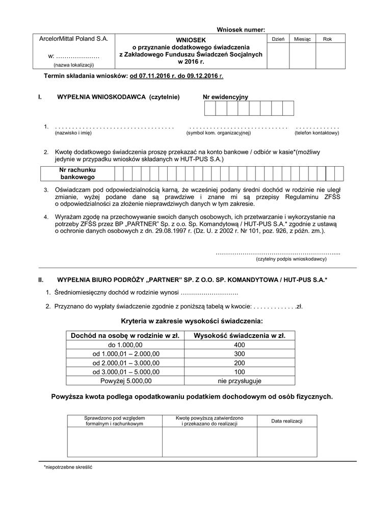 Wniosek numer: ArcelorMittal Poland S.A. w: ………………… (nazwa lokalizacji) WNIOSEK o przyznanie dodatkowego świadczenia z Zakładowego Funduszu Świadczeń Socjalnych w 2016 r. Dzień Miesiąc Rok Termin składania wniosków: od 07.11.2016 r. do 09.12.2016 r. I. WYPEŁNIA WNIOSKODAWCA (czytelnie) 1. ................................... ............................. (nazwisko i imię) 2. Nr ewidencyjny (symbol kom. organizacyjnej) ............. (telefon kontaktowy) Kwotę dodatkowego świadczenia proszę przekazać na konto bankowe / odbiór w kasie*(możliwy jedynie w przypadku wniosków składanych w HUT-PUS S.A.) Nr rachunku bankowego 3. Oświadczam pod odpowiedzialnością karną, że wcześniej podany średni dochód w rodzinie nie uległ zmianie, wyżej podane dane są prawdziwe i znane mi są przepisy Regulaminu ZFŚS o odpowiedzialności za złożenie nieprawdziwych danych w tym zakresie. 4. Wyrażam zgodę na przechowywanie swoich danych osobowych, ich przetwarzanie i wykorzystanie na potrzeby ZFŚS przez BP „PARTNER” Sp. z o.o. Sp. Komandytową / HUT-PUS S.A.* zgodnie z ustawą o ochronie danych osobowych z dn. 29.08.1997 r. (Dz. U. z 2002 r. Nr 101, poz. 926, z późn. zm.). ………………………………………………….... (czytelny podpis wnioskodawcy) II. WYPEŁNIA BIURO PODRÓŻY „PARTNER” SP. Z O.O. SP. KOMANDYTOWA / HUT-PUS S.A.* 1. Średniomiesięczny dochód w rodzinie wynosi ………………………. 2. Przyznano do wypłaty świadczenie zgodnie z poniższą tabelą w kwocie: . . . . . . . . . . . . .zł. Kryteria w zakresie wysokości świadczenia: Dochód na osobę w rodzinie w zł. do 1.000,00 od 1.000,01 – 2.000,00 od 2.000,01 – 3.000,00 od 3.000,01 – 5.000,00 Powyżej 5.000,00 Wysokość świadczenia w zł. 400 300 200 100 nie przysługuje Powyższa kwota podlega opodatkowaniu podatkiem dochodowym od osób fizycznych. Sprawdzono pod względem formalnym i rachunkowym *niepotrzebne skreślić Kwotę powyższą zatwierdzono i przekazano do realizacji Data realizacji