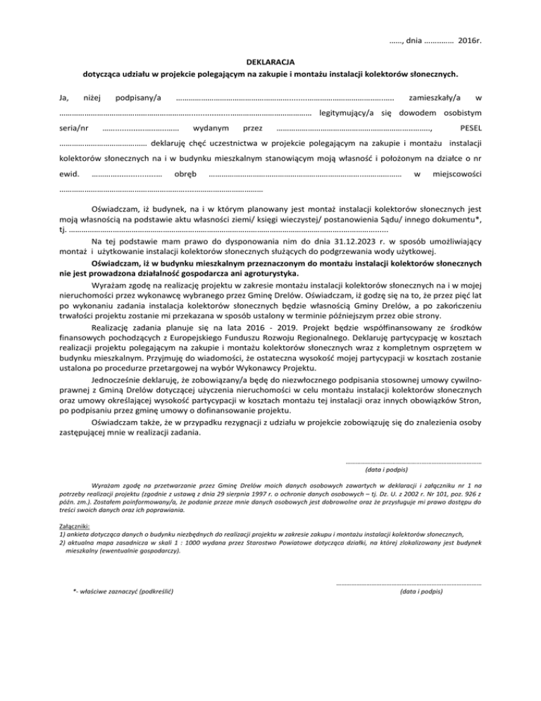 ……, dnia ……..…… 2016r. DEKLARACJA dotycząca udziału w projekcie polegającym na zakupie i montażu instalacji kolektorów słonecznych. Ja, niżej podpisany/a ………………………………………………........…………………………..….….. zamieszkały/a w ……………………………………………………….................………………………………… legitymujący/a się dowodem osobistym seria/nr …….............…..…..…… wydanym przez ………………………………………………………..…….., PESEL …………………………………… deklaruję chęć uczestnictwa w projekcie polegającym na zakupie i montażu instalacji kolektorów słonecznych na i w budynku mieszkalnym stanowiącym moją własność i położonym na działce o nr ewid. ………….................… obręb ………………………………………………………………..……………… w miejscowości ……………………………………………………....…………………………… Oświadczam, iż budynek, na i w którym planowany jest montaż instalacji kolektorów słonecznych jest moją własnością na podstawie aktu własności ziemi/ księgi wieczystej/ postanowienia Sądu/ innego dokumentu*, tj. …………………………………………………………………………………………………………………..……………...... Na tej podstawie mam prawo do dysponowania nim do dnia 31.12.2023 r. w sposób umożliwiający montaż i użytkowanie instalacji kolektorów słonecznych służących do podgrzewania wody użytkowej. Oświadczam, iż w budynku mieszkalnym przeznaczonym do montażu instalacji kolektorów słonecznych nie jest prowadzona działalność gospodarcza ani agroturystyka. Wyrażam zgodę na realizację projektu w zakresie montażu instalacji kolektorów słonecznych na i w mojej nieruchomości przez wykonawcę wybranego przez Gminę Drelów. Oświadczam, iż godzę się na to, że przez pięć lat po wykonaniu zadania instalacja kolektorów słonecznych będzie własnością Gminy Drelów, a po zakończeniu trwałości projektu zostanie mi przekazana w sposób ustalony w terminie późniejszym przez obie strony. Realizację zadania planuje się na lata 2016 - 2019. Projekt będzie współfinansowany ze środków finansowych pochodzących z Europejskiego Funduszu Rozwoju Regionalnego. Deklaruję partycypację w kosztach realizacji projektu polegającym na zakupie i montażu kolektorów słonecznych wraz z kompletnym osprzętem w budynku mieszkalnym. Przyjmuję do wiadomości, że ostateczna wysokość mojej partycypacji w kosztach zostanie ustalona po procedurze przetargowej na wybór Wykonawcy Projektu. Jednocześnie deklaruję, że zobowiązany/a będę do niezwłocznego podpisania stosownej umowy cywilnoprawnej z Gminą Drelów dotyczącej użyczenia nieruchomości w celu montażu instalacji kolektorów słonecznych oraz umowy określającej wysokość partycypacji w kosztach montażu tej instalacji oraz innych obowiązków Stron, po podpisaniu przez gminę umowy o dofinansowanie projektu. Oświadczam także, że w przypadku rezygnacji z udziału w projekcie zobowiązuję się do znalezienia osoby zastępującej mnie w realizacji zadania. ……………………………………...……………………………… (data i podpis) Wyrażam zgodę na przetwarzanie przez Gminę Drelów moich danych osobowych zawartych w deklaracji i załączniku nr 1 na potrzeby realizacji projektu (zgodnie z ustawą z dnia 29 sierpnia 1997 r. o ochronie danych osobowych – tj. Dz. U. z 2002 r. Nr 101, poz. 926 z późn. zm.). Zostałem poinformowany/a, że podanie przeze mnie danych osobowych jest dobrowolne oraz że przysługuje mi prawo dostępu do treści swoich danych oraz ich poprawiania. Załączniki: 1) ankieta dotycząca danych o budynku niezbędnych do realizacji projektu w zakresie zakupu i montażu instalacji kolektorów słonecznych, 2) aktualna mapa zasadnicza w skali 1 : 1000 wydana przez Starostwo Powiatowe dotycząca działki, na której zlokalizowany jest budynek mieszkalny (ewentualnie gospodarczy). *- właściwe zaznaczyć (podkreślić) …………………………………………………………………………… (data i podpis)