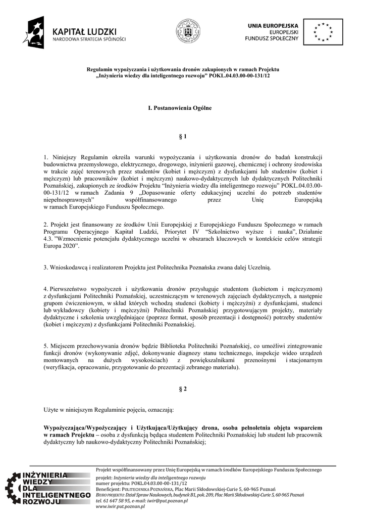 Regulamin wypożyczania i użytkowania dronów zakupionych w ramach Projektu „Inżynieria wiedzy dla inteligentnego rozwoju” POKL.04.03.00-00-131/12 I. Postanowienia Ogólne §1 1. Niniejszy Regulamin określa warunki wypożyczania i użytkowania dronów do badań konstrukcji budownictwa przemysłowego, elektrycznego, drogowego, inżynierii gazowej, chemicznej i ochrony środowiska w trakcie zajęć terenowych przez studentów (kobiet i mężczyzn) z dysfunkcjami lub studentów (kobiet i mężczyzn) lub pracowników (kobiet i mężczyzn) naukowo-dydaktycznych lub dydaktycznych Politechniki Poznańskiej, zakupionych ze środków Projektu “Inżynieria wiedzy dla inteligentnego rozwoju” POKL.04.03.0000-131/12 w ramach Zadania 9 „Dopasowanie oferty edukacyjnej uczelni do potrzeb studentów niepełnosprawnych” współfinansowanego przez Unię Europejską w ramach Europejskiego Funduszu Społecznego. 2. Projekt jest finansowany ze środków Unii Europejskiej z Europejskiego Funduszu Społecznego w ramach Programu Operacyjnego Kapitał Ludzki, Priorytet IV “Szkolnictwo wyższe i nauka”, Działanie 4.3. ”Wzmocnienie potencjału dydaktycznego uczelni w obszarach kluczowych w kontekście celów strategii Europa 2020”. 3. Wnioskodawcą i realizatorem Projektu jest Politechnika Poznańska zwana dalej Uczelnią. 4. Pierwszeństwo wypożyczeń i użytkowania dronów przysługuje studentom (kobietom i mężczyznom) z dysfunkcjami Politechniki Poznańskiej, uczestniczącym w terenowych zajęciach dydaktycznych, a następnie grupom ćwiczeniowym, w skład których wchodzą studenci (kobiety i mężczyźni) z dysfunkcjami, studenci lub wykładowcy (kobiety i mężczyźni) Politechniki Poznańskiej przygotowującym projekty, materiały dydaktyczne i szkolenia uwzględniające (poprzez format, sposób prezentacji i dostępność) potrzeby studentów (kobiet i mężczyzn) z dysfunkcjami Politechniki Poznańskiej. 5. Miejscem przechowywania dronów będzie Biblioteka Politechniki Poznańskiej, co umożliwi zintegrowanie funkcji dronów (wykonywanie zdjęć, dokonywanie diagnozy stanu technicznego, inspekcje wideo urządzeń montowanych na dużych wysokościach) z powiększalnikami przenośnymi i stacjonarnym (weryfikacja, opracowanie, przygotowanie do prezentacji zebranego materiału). §2 Użyte w niniejszym Regulaminie pojęcia, oznaczają: Wypożyczająca/Wypożyczający i Użytkująca/Użytkujący drona, osoba pełnoletnia objęta wsparciem w ramach Projektu – osoba z dysfunkcją będąca studentem Politechniki Poznańskiej lub student lub pracownik dydaktyczny lub naukowo-dydaktyczny Politechniki Poznańskiej; Projekt współfinansowany przez Unię Europejską w ramach środków Europejskiego Funduszu Społecznego projekt: Inżynieria wiedzy dla inteligentnego rozwoju numer projektu: POKL.04.03.00-00-131/12 Beneficjent: POLITECHNIKA POZNAŃSKA, Plac Marii Skłodowskiej-Curie 5, 60-965 Poznań BIURO PROJEKTU: Dział Spraw Naukowych, budynek B1, pok. 209, Plac Marii Skłodowskiej-Curie 5, 60-965 Poznań tel. 61 647 58 95, e-mail: [email protected] www.iwir.put.poznan.pl Instytucja Pośrednicząca – Narodowe Centrum Badań i Rozwoju; Projekt – “Inżynieria wiedzy dla inteligentnego rozwoju” POKL.04.03.00-00-131/12; Biuro Projektu – Politechnika Poznańska, Dział Spraw Naukowych, budynek B1, pokój 209, Plac Marii Skłodowskiej-Curie 5, 60-965 Poznań, tel.: 61-647-58-95, fax: 61-665-36-72, www.iwir.put.poznan.pl. §3 1. Projekt jest realizowany w okresie 01.06.2013 roku – 31.05.2015 roku. 2. Uczestnikami Projektu są kobiety lub mężczyźni, wymienieni w § 2 niniejszego Regulaminu. §4 1. Ogólnym celem Projektu jest rozszerzenie i wzbogacenie oferty edukacyjnej w obszarach kluczowych w kontekście celów Europa 2020 poprzez wdrożenie w okresie od 01.06.2013 do 31.05.2015 programu rozwojowego zakładającego rozbudowę potencjału dydaktycznego Politechniki Poznańskiej. 2. Projekt zakłada w zakresie Zadania 9 Projektu – Dopasowanie oferty edukacyjnej uczelni do potrzeb studentów niepełnosprawnych, wsparcie w postaci możliwości wypożyczenia i użytkowania drona na potrzeby zajęć terenowych. II. Zasady wypożyczenia i użytkowania drona §5 1. Studentka lub student z dysfunkcją, którzy chcą wypożyczyć i użytkować drona na terenowych zajęciach dydaktycznych są zobowiązani do poinformowania poprzez e-mail o tym fakcie wyznaczonego pracownika Politechniki Poznańskiej najpóźniej na 14 dni roboczych przed planowanym wypożyczeniem i użytkowaniem drona, w celu uzyskania od tego pracownika zgody na wskazany termin wypożyczenia i użytkowania drona. Wyznaczony pracownik Politechniki Poznańskiej informuje poprzez e-mail o wyrażeniu lub o nie wyrażeniu zgody ze względów organizacyjnych na wskazany termin wypożyczenia i użytkowania drona w ciągu 2 dni roboczych licząc od następnego dnia roboczego po otrzymaniu e-maila z prośbą o wyrażenie zgody na proponowany termin wypożyczenia i użytkowania drona. 2. W przypadku wypożyczeń i użytkowania drona przez studentkę lub studenta z dysfunkcją, zgłoszenia użytkowania drona do Polskiej Agencji Żeglugi Powietrznej lub innego podmiotu odpowiedzialnego w celu uzyskania zgody na użytkowanie drona na terenowych zajęciach dydaktycznych na warunkach zawartych w zgłoszeniu zaakceptowanym przez Polską Agencję Żeglugi Powietrznej lub inny podmiot odpowiedzialny, dokonuje wyznaczony pracownik Politechniki Poznańskiej i informuje niezwłocznie zainteresowanych poprzez Projekt współfinansowany przez Unię Europejską w ramach środków Europejskiego Funduszu Społecznego projekt: Inżynieria wiedzy dla inteligentnego rozwoju numer projektu: POKL.04.03.00-00-131/12 Beneficjent: POLITECHNIKA POZNAŃSKA, Plac Marii Skłodowskiej-Curie 5, 60-965 Poznań BIURO PROJEKTU: Dział Spraw Naukowych, budynek B1, pok. 209, Plac Marii Skłodowskiej-Curie 5, 60-965 Poznań tel. 61 647 58 95, e-mail: [email prote