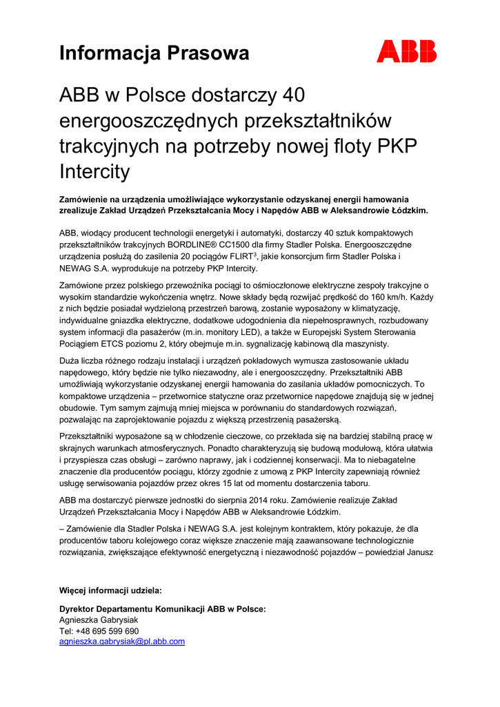 Informacja Prasowa ABB w Polsce dostarczy 40 energooszczędnych przekształtników trakcyjnych na potrzeby nowej floty PKP Intercity Zamówienie na urządzenia umożliwiające wykorzystanie odzyskanej energii hamowania zrealizuje Zakład Urządzeń Przekształcania Mocy i Napędów ABB w Aleksandrowie Łódzkim. ABB, wiodący producent technologii energetyki i automatyki, dostarczy 40 sztuk kompaktowych przekształtników trakcyjnych BORDLINE® CC1500 dla firmy Stadler Polska. Energooszczędne urządzenia posłużą do zasilenia 20 pociągów FLIRT 3, jakie konsorcjum firm Stadler Polska i NEWAG S.A. wyprodukuje na potrzeby PKP Intercity. Zamówione przez polskiego przewoźnika pociągi to ośmioczłonowe elektryczne zespoły trakcyjne o wysokim standardzie wykończenia wnętrz. Nowe składy będą rozwijać prędkość do 160 km/h. Każdy z nich będzie posiadał wydzieloną przestrzeń barową, zostanie wyposażony w klimatyzację, indywidualne gniazdka elektryczne, dodatkowe udogodnienia dla niepełnosprawnych, rozbudowany system informacji dla pasażerów (m.in. monitory LED), a także w Europejski System Sterowania Pociągiem ETCS poziomu 2, który obejmuje m.in. sygnalizację kabinową dla maszynisty. Duża liczba różnego rodzaju instalacji i urządzeń pokładowych wymusza zastosowanie układu napędowego, który będzie nie tylko niezawodny, ale i energooszczędny. Przekształtniki ABB umożliwiają wykorzystanie odzyskanej energii hamowania do zasilania układów pomocniczych. To kompaktowe urządzenia – przetwornice statyczne oraz przetwornice napędowe znajdują się w jednej obudowie. Tym samym zajmują mniej miejsca w porównaniu do standardowych rozwiązań, pozwalając na zaprojektowanie pojazdu z większą przestrzenią pasażerską. Przekształtniki wyposażone są w chłodzenie cieczowe, co przekłada się na bardziej stabilną pracę w skrajnych warunkach atmosferycznych. Ponadto charakteryzują się budową modułową, która ułatwia i przyspiesza czas obsługi – zarówno naprawy, jak i codziennej konserwacji. Ma to niebagatelne znaczenie dla producentów pociągu, którzy zgodnie z umową z PKP Intercity zapewniają również usługę serwisowania pojazdów przez okres 15 lat od momentu dostarczenia taboru. ABB ma dostarczyć pierwsze jednostki do sierpnia 2014 roku. Zamówienie realizuje Zakład Urządzeń Przekształcania Mocy i Napędów ABB w Aleksandrowie Łódzkim. – Zamówienie dla Stadler Polska i NEWAG S.A. jest kolejnym kontraktem, który pokazuje, że dla producentów taboru kolejowego coraz większe znaczenie mają zaawansowane technologicznie rozwiązania, zwiększające efektywność energetyczną i niezawodność pojazdów – powiedział Janusz Więcej informacji udziela: Dyrektor Departamentu Komunikacji ABB w Polsce: Agnieszka Gabrysiak Tel: +48 695 599 690 [email protected] Informacja Prasowa Petrykowski, wiceprezes ABB Sp. z o.o. – Cieszymy się, że ABB we współpracy ze Stadler Polska i NEWAG S.A. bierze czynny udział w rozwoju polskiej kolei. Dla ABB w Polsce to już kolejny kontrakt obejmujący przekształtniki trakcyjne BORDLINE®, po zeszłorocznym zamówieniu na 40 sztuk tych urządzeń (model CC750) dla Stadler Polska. CC750 zostały zainstalowane w pociągach FLIRT wyprodukowanych dla Łódzkiej Kolei Aglomeracyjnej. Firma Stadler Polska wyprodukowała już dla łódzkiego przewoźnika pierwszych sześć zamówionych pojazdów. W kwietniu odbyła się uroczysta prezentacja taboru, który od 15 czerwca jeździ na trasie Łódź – Sieradz. Pod koniec października zostanie przekazanych 10 kolejnych pociągów. Ostatnie pojazdy ŁKA otrzyma w lutym przyszłego roku. – Zamówione pociągi to mercedesy wśród taboru kolejowego – powiedział Witold Stępień, marszałek województwa łódzkiego. Stadler Polska to polska spółka należąca do Grupy Stadler Rail, wiodącego światowego producenta pojazdów szynowych. W ramach zamówienia dla PKP Intercity firma dostarczy pudła i wózki kołowe, a także zmontuje skrajne człony pociągów w swoim zakładzie produkcyjnym w Siedlcach. NEWAG S.A., drugi co do wielkości producent taboru szynowego w Polsce, zmontuje człony środkowe, w sumie 120 sztuk, zespoli i uruchomi całe pojazdy. Nowe składy mają zostać dostarczone PKP Intercity pod koniec 2015 roku. Będą obsługiwać pasażerów na liniach: Gdynia – Katowice, Kraków – Szczecin, Olsztyn – Kraków oraz Warszawa – Bydgoszcz. ABB od lat dostarcza wyposażenie energetyczne dla trakcji i taboru kolejowego, przyczyniając się do modernizacji krajowej sieci kolejowej. W najbliższym czasie firma zaprezentuje swoje rozwiązania podczas IV Kongresu Kolejowego w Łodzi (9 października), jak również targów InnoTrans 2014 w Berlinie (23-26 września). ABB (www.abb.com) jest liderem w technologiach dla energetyki i automatyki, które pozwalają klientom przemysłowym oraz zakładom energetycznym zwiększać swoją efektywność, jednocześnie minimalizując negatywny wpływ na środowisko naturalne. Grupa ABB zatrudnia 150 000 pracowników w ponad 100 krajach świata. Więcej informacji udziela: Dyrektor Departamentu Komunikacji ABB w Polsce: Agnieszka Gabrysiak Tel: +48 695 599 690 [email protected]