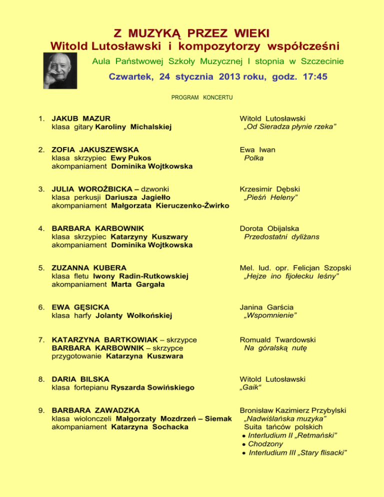 Z MUZYKĄ PRZEZ WIEKI Witold Lutosławski i kompozytorzy współcześni Aula Państwowej Szkoły Muzycznej I stopnia w Szczecinie Czwartek, 24 stycznia 2013 roku, godz. 17:45 PROGRAM KONCERTU 1. JAKUB MAZUR klasa gitary Karoliny Michalskiej Witold Lutosławski „Od Sieradza płynie rzeka” 2. ZOFIA JAKUSZEWSKA klasa skrzypiec Ewy Pukos akompaniament Dominika Wojtkowska Ewa Iwan Polka 3. JULIA WOROŻBICKA – dzwonki klasa perkusji Dariusza Jagiełło akompaniament Małgorzata Kieruczenko-Żwirko Krzesimir Dębski „Pieśń Heleny” 4. BARBARA KARBOWNIK klasa skrzypiec Katarzyny Kuszwary akompaniament Dominika Wojtkowska Dorota Obijalska Przedostatni dyliżans 5. ZUZANNA KUBERA klasa fletu Iwony Radin-Rutkowskiej akompaniament Marta Gargała Mel. lud. opr. Felicjan Szopski „Hejze ino fijołecku leśny” 6. EWA GĘSICKA klasa harfy Jolanty Wołkońskiej Janina Garścia „Wspomnienie” 7. KATARZYNA BARTKOWIAK – skrzypce BARBARA KARBOWNIK – skrzypce przygotowanie Katarzyna Kuszwara Romuald Twardowski Na góralską nutę 8. DARIA BILSKA klasa fortepianu Ryszarda Sowińskiego Witold Lutosławski „Gaik“ 9. BARBARA ZAWADZKA klasa wiolonczeli Małgorzaty Mozdrzeń – Siemak akompaniament Katarzyna Sochacka Bronisław Kazimierz Przybylski „Nadwiślańska muzyka” Suita tańców polskich Interludium II „Retmański” Chodzony Interludium III „Stary flisacki” 10. MARIA BIELENINIK – skrzypce MIESZKO ZABŁOCKI – skrzypce JUSTYNA SOWAŁA – altówka JOWITA PAUL – wiolonczela przygotowanie Dorota Jasińska Henryk Mikołaj Górecki oprac. Dorota Jasińska „Amen” op. 35 11. NADIA ŁOWICZ klasa harfy Jolanty Wołkońskiej Bernard Andrès Akwarela nr 1 12. RAFAŁ OPIELA - gitara PRZEMYSŁAW BIELEC - gitara klasa gitary Przemysława Bielca Przemysław Bielec Danza del fuego 13. IGNACY GOŁĄB – fagot WIKTOR KOMOROWSKI – fagot ANTONINA BEDNARA – fagot przygotowanie Edyta Moroz Piotr Moss „Historyjki na 3 fagoty” historia pierwsza pt „Zegarek” 14. OSKAR KOSIAK klasa harfy Jolanty Wołkońskiej Bernard Andrès Papryka z cyklu „Przyprawy” 15. MACIEJ SZOPA klasa trąbki Michała Koniarskiego akompaniament Monika Chodkowska Czesław Grudziński Kołysanka 16. PRZEMYSŁAW BIELEC – gitara Przemysław Bielec Recuerdo 17. PATRYK KAŹMIERCZAK – flet MACIEJ MARUSZCZAK – perkusja przygotowanie Tomasz Andrzejewski Tomasz Andrzejewski Muzyka na flet i perkusję 18. KAROL DZIADOSZ klasa akordeonu Janusza Pszeniczki Andrzej Tuchowski Jazz – toccata 19. CHÓR SZKOLNY, CHÓR „CON FORZA” przygotowanie i prowadzenie Agata Pawłowska Piotr Jańczak Kyrie Emily Cocker Gloria Alleluja Prowadzenie koncertu: Urszula Piter-Zawadka Prelegent: Wojciech Jankowski Organizatorzy: Grażyna Wójcik-Sowińska, Ryszard Sowiński