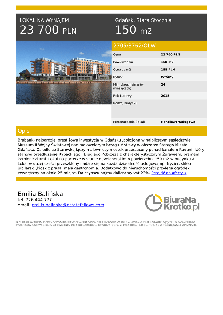 LOKAL NA WYNAJEM Gdańsk, Stara Stocznia 23 700 150 PLN m2 2705/3762/OLW Cena 23 700 PLN Powierzchnia 150 m2 Cena za m2 158 PLN Rynek Wtórny Min. okres najmu (w miesiącach) 24 Rok budowy 2015 Rodzaj budynku Przeznaczenie (lokal) Handlowo/Usługowe Opis Brabank- najbardziej prestiżowa inwestycja w Gdańsku ,położona w najbliższym sąsiedztwie Muzeum II Wojny Światowej nad malowniczym brzegu Motławy w obszarze Starego Miasta Gdańska. Osiedle ze Starówką łączy malowniczy mostek przerzucony ponad kanałem Raduni, który stanowi przedłużenie Rybackiego i Długiego Pobrzeża z charakterystycznym Żurawiem, bramami i kamieniczkami. Lokal na parterze w stanie developerskim o powierzchni 150 m2 w budynku A. Lokal w dużej części przeszklony nadaje się na każdą działalność usługową np. fryzjer, sklep jubilerski ,kiosk z prasą, mała gastronomia. Dodatkowo do nieruchomości przylega ogródek zewnętrzny na około 25 miejsc. Do czynszu najmu doliczamy vat 23%. Przejdź do oferty » Emilia Balińska tel. 726 444 777 email: [email protected] NINIEJSZE WARUNKI MAJĄ CHARAKTER INFORMACYJNY ORAZ NIE STANOWIĄ OFERTY ZAWARCIA JAKIEJKOLWIEK UMOWY W ROZUMIENIU PRZEPISÓW USTAW Z DNIA 23 KWIETNIA 1964 ROKU KODEKS CYWILNY (DZ.U. Z 1964 ROKU, NR 16, POZ. 93 Z PÓŹNIEJSZYMI ZMIANAMI. Powered by TCPDF (www.tcpdf.org)