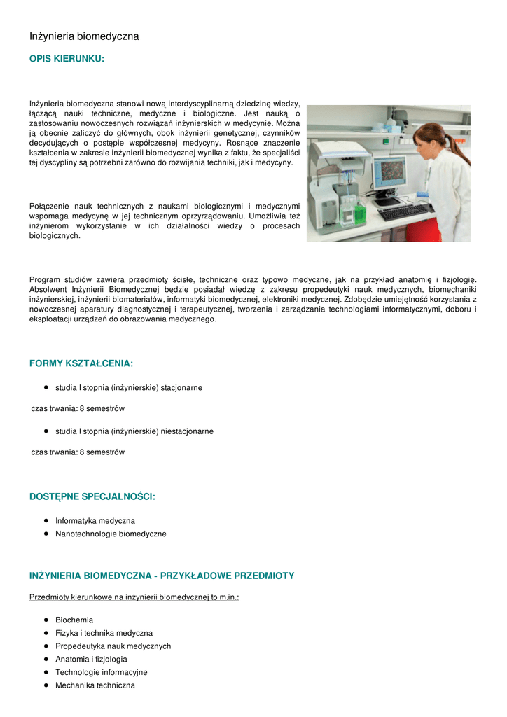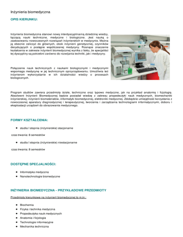 Inżynieria biomedyczna OPIS KIERUNKU: Inżynieria biomedyczna stanowi nową interdyscyplinarną dziedzinę wiedzy, łączącą nauki techniczne, medyczne i biologiczne. Jest nauką o zastosowaniu nowoczesnych rozwiązań inżynierskich w medycynie. Można ją obecnie zaliczyć do głównych, obok inżynierii genetycznej, czynników decydujących o postępie współczesnej medycyny. Rosnące znaczenie kształcenia w zakresie inżynierii biomedycznej wynika z faktu, że specjaliści tej dyscypliny są potrzebni zarówno do rozwijania techniki, jak i medycyny. Połączenie nauk technicznych z naukami biologicznymi i medycznymi wspomaga medycynę w jej technicznym oprzyrządowaniu. Umożliwia też inżynierom wykorzystanie w ich działalności wiedzy o procesach biologicznych. Program studiów zawiera przedmioty ścisłe, techniczne oraz typowo medyczne, jak na przykład anatomię i fizjologię. Absolwent Inżynierii Biomedycznej będzie posiadał wiedzę z zakresu propedeutyki nauk medycznych, biomechaniki inżynierskiej, inżynierii biomateriałów, informatyki biomedycznej, elektroniki medycznej. Zdobędzie umiejętność korzystania z nowoczesnej aparatury diagnostycznej i terapeutycznej, tworzenia i zarządzania technologiami informatycznymi, doboru i eksploatacji urządzeń do obrazowania medycznego. FORMY KSZTAŁCENIA: studia I stopnia (inżynierskie) stacjonarne czas trwania: 8 semestrów studia I stopnia (inżynierskie) niestacjonarne czas trwania: 8 semestrów DOSTĘPNE SPECJALNOŚCI: Informatyka medyczna Nanotechnologie biomedyczne INŻYNIERIA BIOMEDYCZNA - PRZYKŁADOWE PRZEDMIOTY Przedmioty kierunkowe na inżynierii biomedycznej to m.in.: Biochemia Fizyka i technika medyczna Propedeutyka nauk medycznych Anatomia i fizjologia Technologie informacyjne Mechanika techniczna Wytrzymałość materiałów Podstawy biomechaniki Elementy i układy elektroniczne Technika cyfrowa i mikroprocesorowa Obrazowanie medyczne Biomateriały Implanty i sztuczne narządy Prawne i etyczne aspekty inżynierii biomedycznej EFEKTY KSZTAŁCENIA - studia I stopnia - >>> POBIERZ <<< PROGRAM STUDIÓW: >>> POBIERZ <<< 2013 - 2014 >>> POBIERZ <<< 2014 - 2015 >>> POBIERZ <<< 2015 - 2016 >>> POBIERZ <<< 2012 - 2013 PRACA PO STUDIACH Absolwent kierunku Inżynieria Biomedyczna to inżynier przygotowany do współpracy z lekarzami medycyny w zakresie obsługi systemów diagnostycznych i terapeutycznych, integracji, eksploatacji, obsługi i konserwacji aparatury medycznej oraz doboru i klasyfikacji bioprotez, materiałów implantacyjnych i instrumentarium medycznego. Absolwenci mogą znaleźć zatrudnienie w: szpitalach, klinikach, ambulatoriach i poradniach, jednostkach badawczo-rozwojowych zajmujących się badaniami w obszarze inżynierii biomedycznej, przedsiębiorstwach produkujących aparaturę medyczną i sprzęt rehabilitacyjny.