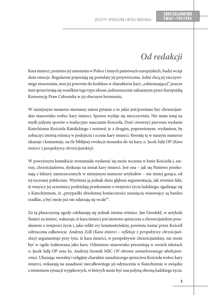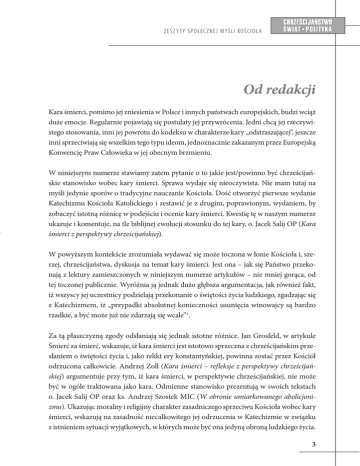 Z ES Z Y T Y S P O ŁEC Z NEJ MYŚLI KO ŚC I O Ł A Od redakcji Kara śmierci, pomimo jej zniesienia w Polsce i innych państwach europejskich, budzi wciąż duże emocje. Regularnie pojawiają się postulaty jej przywrócenia. Jedni chcą jej rzeczywistego stosowania, inni jej powrotu do kodeksu w charakterze kary „odstraszającej”, jeszcze inni sprzeciwiają się wszelkim tego typu ideom, jednoznacznie zakazanym przez Europejską Konwencję Praw Człowieka w jej obecnym brzmieniu. W niniejszym numerze stawiamy zatem pytanie o to jakie jest/powinno być chrześcijańskie stanowisko wobec kary śmierci. Sprawa wydaje się nieoczywista. Nie mam tutaj na myśli jedynie sporów o tradycyjne nauczanie Kościoła. Dość otworzyć pierwsze wydanie Katechizmu Kościoła Katolickiego i zestawić je z drugim, poprawionym, wydaniem, by zobaczyć istotną różnicę w podejściu i ocenie kary śmierci. Kwestię tę w naszym numerze ukazuje i komentuje, na tle biblijnej ewolucji stosunku do tej kary, o. Jacek Salij OP (Kara śmierci z perspektywy chrześcijańskiej). W powyższym kontekście zrozumiała wydawać się może toczona w łonie Kościoła i, szerzej, chrześcijaństwa, dyskusja na temat kary śmierci. Jest ona – jak się Państwo przekonają z lektury zamieszczonych w niniejszym numerze artykułów – nie mniej gorąca, od tej toczonej publicznie. Wyróżnia ją jednak dużo głębsza argumentacja, jak również fakt, iż wszyscy jej uczestnicy podzielają przekonanie o świętości życia ludzkiego, zgadzając się z Katechizmem, iż „przypadki absolutnej konieczności usunięcia winowajcy są bardzo rzadkie, a być może już nie zdarzają się wcale”1. Za tą płaszczyzną zgody odsłaniają się jednak istotne różnice. Jan Grosfeld, w artykule Śmierć za śmierć, wskazuje, iż kara śmierci jest istotowo sprzeczna z chrześcijańskim przesłaniem o świętości życia i, jako relikt ery konstantyńskiej, powinna zostać przez Kościół odrzucona całkowicie. Andrzej Zoll (Kara śmierci – refleksje z perspektywy chrześcijańskiej) argumentuje przy tym, iż kara śmierci, w perspektywie chrześcijańskiej, nie może być w ogóle traktowana jako kara. Odmienne stanowisko prezentują w swoich tekstach o. Jacek Salij OP oraz ks. Andrzej Szostek MIC (W obronie umiarkowanego abolicjonizmu). Ukazując moralny i religijny charakter zasadniczego sprzeciwu Kościoła wobec kary śmierci, wskazują na zasadność niecałkowitego jej odrzucenia w Katechizmie w związku z istnieniem sytuacji wyjątkowych, w których może być ona jedyną obroną ludzkiego życia. 3 ZESZ Y T Y S P O ŁEC Z NEJ MYŚ L I KO Ś C IO ŁA Z innej, filozoficzno-antropologicznej, strony kwestii kary śmierci przygląda się Zbigniew Stawrowski (Dylematy kary śmierci na antropologicznym tle). W swoim artykule nie tylko ukazuje on antropologiczny wymiar różnych ujęć kary śmierci, ale również konsekwencje, jakie dla regulacji kary śmierci może mieć – zdaniem autora konieczna – próba uwzględnienia w prawodawstwie wymogów nie tylko chrześcijańskiego, ale i kantowskiego rozumienia godności, a zatem, ostatecznie, dwóch odmiennych antropologii. Na koniec, podkreślić warto eklezjalny kontekst toczonej na naszych łamach dyskusji. W ostatnich latach w nauczaniu Papieży odnotować można tendencję do wzmacniania czy ujednoznaczniania stanowiska Kościoła w sprawie kary śmierci. Benedykt XVI popierał publicznie działania na rzecz wyeliminowania kary śmierci2, nazywając ją – w jednym ze swych listów – „obrazą ludzkiej godności”3. Również Papież Franciszek wezwał wszystkich chrześcijan i ludzi dobrej woli do działań na rzecz zakazania kary śmierci4. Warto mieć w pamięci stanowisko Papieży, gdyż – w toku ożywionej dyskusji publicznej – ginąć niekiedy zdaje się świadomość, iż „zbożna uległość woli i rozumu” w sprawach wiary i obyczajów przynależy „urzędowi nauczycielskiemu Biskupa Rzymskiego nawet wtedy, gdy nie przemawia on ex catedra”, zwłaszcza wobec częstego podawania tej samej nauki5. Jednocześnie, w tradycji Kościoła wiara domaga się zrozumienia. Uległość rozumu domaga się zatem jego wysiłku, a nie zwolnienia z obowiązków. W tej perspektywie właśnie zapraszamy do wspólnego myślenia i dyskusji o chrześcijańskim podejściu do kary śmierci. Michał Gierycz 1 Katechizm Kościoła Katolickiego, wydanie II, par. 2267, Pallottinum, Warszawa 2009, s.525 2 http://ekai.pl/wydarzenia/watykan/x48716/benedykt-xvi-apeluje-o-zniesienie-kary-smierci/ 3 Benedykt XVI, Przesłanie na III Światowy Kongres Przeciw Karze Śmierci, http://ekai.pl/wydarzenia/ x11959/benedykt-xvi-kara-smierci-obraza-godnosci-czlowieka 4 Franciszek, Address of Pope Francis to the Delegates of the International Association of Penal Law, 23.10.2014, http://w2.vatican.va/content/francesco/en/speeches/2014/october/documents/papa-francesco_20141023_associazione-internazionale-diritto-penale.html W przemówieniu tym pojawił się nawet wątek utożsamienia kary śmierci i dożywocia . Papież stwierdził mianowicie, iż „a life sentence is just a death penalty in disguise”. Zauważyć trzeba, iż w tym punkcie nauczanie Papieża Franciszka zmieniałoby w istotnym punkcie nauczanie Kościoła, który dotychczas właśnie w dożywotnim więzieniu widział sposób na skuteczne zabezpieczenie społeczeństwa przed zbrodniarzami. Znaczące wydaje się jednak, iż Papież nie powtórzył tezy w swoich kolejnych wystąpieniach na temat kary śmierci, np. podczas specjalnej audiencji dla delegacji Międzynarodowej Komisji Przeciwko Karze Śmierci 20.03.2015 roku, http://pl.radiovaticana.va/news/2015/03/20/papie%C5%BC_o_karze_%C5%9Bmierci_jest_pora%C5%BCk%C4%85_pa%C5%84stwa_prawa/1130908 5 Paweł VI razem z Ojcami Świętego Soboru, Konstytucja dogmatyczna o Kościele, par.25, w: Sobór Watykański II, Konstytucje, Dekrety, Deklaracje, Pallottinum, Poznań brw