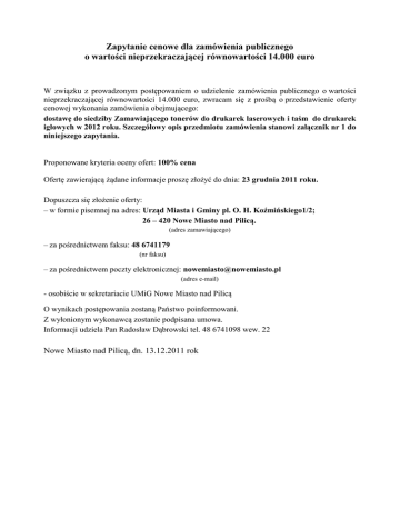 Zapytanie cenowe dla zamówienia publicznego o wartości nieprzekraczającej równowartości 14.000 euro W związku z prowadzonym postępowaniem o udzielenie zamówienia publicznego o wartości nieprzekraczającej równowartości 14.000 euro, zwracam się z prośbą o przedstawienie oferty cenowej wykonania zamówienia obejmującego: dostawę do siedziby Zamawiającego tonerów do drukarek laserowych i taśm do drukarek igłowych w 2012 roku. Szczegółowy opis przedmiotu zamówienia stanowi załącznik nr 1 do niniejszego zapytania. Proponowane kryteria oceny ofert: 100% cena Ofertę zawierającą żądane informacje proszę złożyć do dnia: 23 grudnia 2011 roku. Dopuszcza się złożenie oferty: – w formie pisemnej na adres: Urząd Miasta i Gminy pl. O. H. Koźmińskiego1/2; 26 – 420 Nowe Miasto nad Pilicą. (adres zamawiającego) – za pośrednictwem faksu: 48 6741179 (nr faksu) – za pośrednictwem poczty elektronicznej: [email protected] (adres e-mail) - osobiście w sekretariacie UMiG Nowe Miasto nad Pilicą O wynikach postępowania zostaną Państwo poinformowani. Z wyłonionym wykonawcą zostanie podpisana umowa. Informacji udziela Pan Radosław Dąbrowski tel. 48 6741098 wew. 22 Nowe Miasto nad Pilicą, dn. 13.12.2011 rok Załącznik nr 1 Do zapytania cenowego dla zamówienia publicznego o wartości nieprzekraczającej równowartości 14.000 euro na dostawę do siedziby Zamawiającego (Urząd Miasta i Gminy Nowe Miasto nad Pilicą) tonerów do drukarek laserowych i taśm do drukarek igłowych w 2012 roku. Szczegółowy opis przedmiotu zamówienia Lp. Wyszczególnienie HP Lj 1012/1018/1020 - (Q2612A) HP Lj 1000 - (C7115A) HP Lj P2055 - (CE505X) HP Lj P1005 - (CB435A) HP Lj P1566 HP - (CE278A) Canon LBP 810/HP 1100 - (C4092A) Canon ir 3025 (C-EXV 11) Canon ir 3235n (C-EXV 12) Taśma OKI 3321/3390 Samsung SCX -4300 Samsung SCX-4521F XEROX Phaser 3010 Szacunkowa Jednostkowa ilość cena brutto sztuk/rok 20 5 3 2 2 3 1 3 20 3 2 2 Ogólna wartość brutto Akceptujemy podpisanie umowy z Zamawiającym zawierającej następujące istotne punkty: 1. Zamówienie obejmuje dostawę łącznie 46 sztuk tonerów (z możliwością zmiany ilości w granicach +-20%). Tonery muszą być fabrycznie nowe (nieregenerowane), dopuszczalne są zamienniki. 2. Podane w ofercie ceny jednostkowe na poszczególne tonery i taśmy są cenami stałymi na cały okres obowiązywania umowy – 2012 rok. 3. Wykonawca zobowiązuje się do bezpłatnego odebrania i utylizacji zużytych tonerów. 4. Dostawa towaru następować będzie partiami w terminie 3 dni roboczych od daty złożenia zamówienia, na koszt Wykonawcy. Wielkość każdej partii wynikać będzie z jednostronnych dyspozycji zamawiającego zgłoszonych ustnie, telefonicznie lub na piśmie przez upoważnionego pracownika Urzędu Miasta i Gminy Nowe Miasto nad Pilicą. 5. Płatność za poszczególne dostawy nastąpi przelewem w ciągu 14 dni od daty otrzymania faktury. Podpisanie faktury przez upoważnionego przedstawiciela Zamawiającego stanowi poświadczenie prawidłowości dostawy pod względem ilościowym. Za dzień zapłaty uznaje się dzień złożenia zlecenia przelewu w banku Zamawiającego. 6. Zamawiający zastrzega sobie prawo udzielenia wybranemu Oferentowi zamówień dodatkowych (innych materiałów eksploatacyjnych niż wymienione) w wysokości do 20 % zamówienia podstawowego bez konieczności przeprowadzania kolejnego postępowania, o ile podyktowane to będzie bieżącą potrzebą Zamawiającego i uzasadnione rachunkiem ekonomicznym. 7. Wykonawca udzieli gwarancji jakości na dostarczone materiały na okres, co najmniej 12 miesięcy licząc od dnia dostawy.