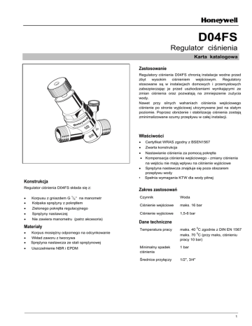 D04FS Regulator ciśnienia Karta katalogowa Zastosowanie Regulatory ciśnienia D04FS chronią instalacje wodne przed zbyt wysokim ciśnieniem wejściowym. Regulatory stosowane są w instalacjach domowych i przemysłowych zabezpieczając je przed uszkodzeniami wynikającymi ze zmian ciśnienia oraz pozwalają na zmniejszenie zużycia wody. Nawet przy silnych wahaniach ciśnienia wejściowego ciśnienie po stronie wyjściowej utrzymywane jest na stałym poziomie. Poprzez obniżenie i stabilizację ciśnienia zostają zminimalizowane szumy przepływu w całej instalacji. Właściwości Konstrukcja Regulator ciśnienia D04FS składa się z: Korpusu z gniazdem G 1/4” na manometr Kołpaka sprężyny z pokrętłem Zielonego pokrętła regulacyjnego Sprężyny nastawczej Nie zawiera manometru (patrz akcesoria) Materiały Korpus mosiężny odpornego na odcynkowanie Wkład zaworu z tworzywa Sprężyna nastawcza ze stali sprężynowej Uszczelnienie NBR i EPDM Certyfikat WRAS zgodny z BSEN1567 Zwarta konstrukcja Nastawianie ciśnienia za pomocą pokrętła Kompensacja ciśnienia wejściowego - zmiany ciśnienia na wejściu nie mają wpływu na ciśnienie wyjściowe Sprężyna nastawcza znajduje się poza obszarem przepływu wody • Spełnia wymagania KTW dla wody pitnej Zakres zastosowań Czynnik Woda Ciśnienie wejściowe maks. 16 bar Ciśnienie wyjściowe 1,5-6 bar Dane techniczne Temperatura pracy maks. 40 0C zgodnie z DIN EN 1567 maks. 70 0C (przy maks, ciśnieniu pracy 10 bar) Minimalny spadek ciśnienia 1 bar Średnice przyłączy 1/2", 3/4" 1 D04FS Regulator ciśnienia Zasada działania Regulator ciśnienia działa na zasadzie równowagi sił działających na membranę: z jednej strony wynikającej z napięcia sprężyny, a z drugiej strony sił parcia od ciśnienia po redukcji. W przypadku występowania zmiennego ciśnienia wejściowego ruchomy wkład zaworu ustawia się w nowe położenie równowagi dla danej nastawy ciśnienia i ilości odbieranej wody (kompensacja ciśnienia wejściowego). W przypadku ustania poboru wody - zawór całkowicie się domyka. Oznaczenie D04FS-... A = Wykonanie standardowe z gwintami zewnętrznymi Wielkość przyłączy Ri 1/2" Ra 3 /4 " 1" Wielkość nominalna DN 15 20 Waga kg 0,29 0,33 Wymiary (mm) L 84 88 h 82,7 82,7 H 106 106 m3/h 2,7 2,9 Wartość kvs 3/4" Akcesoria M38K Części zamienne Manometr Obudowa 50 mm, przyłącze dolne gwintowane G1/4". Zakresy: 0 - 4, 0 - 10, 0 - 16 lub 0 - 25 bar. Przy zamówieniu należy podać zakres Nr Opis Wielkość Nr części 1 Wkład zaworu, kompletny 1/2” – 3/4” D04FSA-1/2 2 Korek R1/4” z O-ringiem S06K-1/4 Honeywell Sp. z o.o. ul. Domaniewska 39B 02-672 Warszawa tel.: 22 606 09 00; faks: 22 606 09 83 www.honeywell.com.pl/automatyka_domow 2 D04FS-k-pl01rMW1113