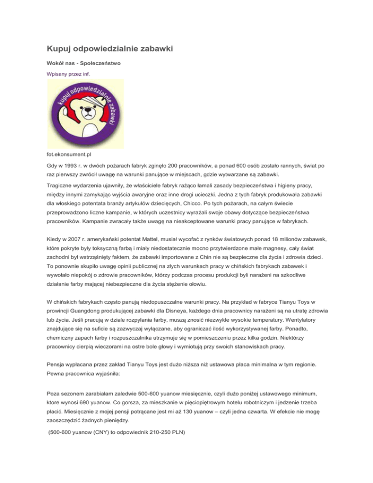 Kupuj odpowiedzialnie zabawki Wokół nas - Społeczeństwo Wpisany przez inf. fot.ekonsument.pl Gdy w 1993 r. w dwóch pożarach fabryk zginęło 200 pracowników, a ponad 600 osób zostało rannych, świat po raz pierwszy zwrócił uwagę na warunki panujące w miejscach, gdzie wytwarzane są zabawki. Tragiczne wydarzenia ujawniły, że właściciele fabryk rażąco łamali zasady bezpieczeństwa i higieny pracy, między innymi zamykając wyjścia awaryjne oraz inne drogi ucieczki. Jedna z tych fabryk produkowała zabawki dla włoskiego potentata branży artykułów dziecięcych, Chicco. Po tych pożarach, na całym świecie przeprowadzono liczne kampanie, w których uczestnicy wyrażali swoje obawy dotyczące bezpieczeństwa pracowników. Kampanie zwracały także uwagę na nieakceptowane warunki pracy panujące w fabrykach. Kiedy w 2007 r. amerykański potentat Mattel, musiał wycofać z rynków światowych ponad 18 milionów zabawek, które pokryte były toksyczną farbą i miały niedostatecznie mocno przytwierdzone małe magnesy, cały świat zachodni był wstrząśnięty faktem, że zabawki importowane z Chin nie są bezpieczne dla życia i zdrowia dzieci. To ponownie skupiło uwagę opinii publicznej na złych warunkach pracy w chińskich fabrykach zabawek i wywołało niepokój o zdrowie pracowników, którzy podczas procesu produkcji byli narażeni na szkodliwe działanie farby mającej niebezpieczne dla życia stężenie ołowiu. W chińskich fabrykach często panują niedopuszczalne warunki pracy. Na przykład w fabryce Tianyu Toys w prowincji Guangdong produkującej zabawki dla Disneya, każdego dnia pracownicy narażeni są na utratę zdrowia lub życia. Jeśli pracują w dziale rozpylania farby, muszą znosić niezwykle wysokie temperatury. Wentylatory znajdujące się na suficie są zazwyczaj wyłączane, aby ograniczać ilość wykorzystywanej farby. Ponadto, chemiczny zapach farby i rozpuszczalnika utrzymuje się w pomieszczeniu przez kilka godzin. Niektórzy pracownicy cierpią wieczorami na ostre bole głowy i wymiotują przy swoich stanowiskach pracy. Pensja wypłacana przez zakład Tianyu Toys jest dużo niższa niż ustawowa płaca minimalna w tym regionie. Pewna pracownica wyjaśniła: Poza sezonem zarabiałam zaledwie 500-600 yuanow miesięcznie, czyli dużo poniżej ustawowego minimum, ktore wynosi 690 yuanow. Co gorsza, za mieszkanie w pięciopiętrowym hotelu robotniczym i jedzenie trzeba płacić. Miesięcznie z mojej pensji potrącane jest mi aż 130 yuanow – czyli jedna czwarta. W efekcie nie mogę zaoszczędzić żadnych pieniędzy. (500-600 yuanow (CNY) to odpowiednik 210-250 PLN) fot.ekonsument.pl W Tianyu Toys obowiązuje 12-15 godzinny dzień pracy. Robotnicy pracują 28 dni w miesiącu zaczynając pracę o 8 rano i kończąc nierzadko o północy. „Jestem zbyt zmęczona, by zwracać uwagę na szczegóły i wygląd zabawek w moich rękach”, powiedziała młoda pracownica. W sezonie pracownicy nie mają dni wolnych i pracują ponad 400 godzin miesięcznie. Europejska kampania „Stop Toying Around!” zwraca uwagę na warunki pracy panujące w chińskich fabrykach zabawek. Kampania ta jest wspólnym przedsięwzięciem organizacji pozarządowych z Austrii, Republiki Czeskiej, Francji, Polski oraz Rumunii, a jej zadaniem jest informowanie ludzi i mediów, angażowanie w działania polityków oraz prowadzenie dialogu z producentami zabawek, w celu poprawy warunków pracy chińskich pracowników branży zabawkarskiej. Projekt „Kupuj odpowiedzialnie zabawki” jest częścią europejskiej kampanii „Stop toying around!”, która ma zwrócić uwagę na nadużycia w przemyśle zabawkarskim, a zwłaszcza wykorzystywanie mieszkańców krajów azjatyckich, w których produkowana jest większość zabawek dostępnych w naszych sklepach. Europa stanowi drugi po USA rynek zbytu zabawek, a kampania skierowana jest do wszystkich europejskich konsumentów – razem możemy wywrzeć wystarczającą presję W Polsce projekt realizowany jest przez Polską Zieloną Sieć w ramach kampanii „Kupuj odpowiedzialnie”, która konsekwentnie i na rożne sposoby poddaje refleksji nawyki konsumenckie polskiego społeczeństwa. Warto rozważnie kupować zabawki dla swoich dzieci, aby były bezpiecznie oraz etyczne. Źródło: Polska Zielona Sieć, przewodnik dla aktywistów „Kupuj odpowiedzialnie zabawki” Więcej o akcji: www.ekonsument.pl/zabawki Przewodnik dla aktywistów:www.ekonsument.pl/materialy/publ_137_aktywisci_pojedyncze_net.pdf
