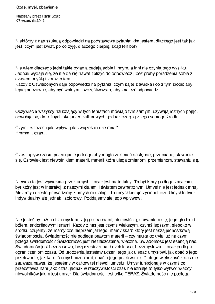 Czas, myśl, zbawienie Napisany przez Rafał Szulc 07 września 2012 Niektórzy z nas szukają odpowiedzi na podstawowe pytania: kim jestem, dlaczego jest tak jak jest, czym jest świat, po co żyję, dlaczego cierpię, skąd ten ból? Nie wiem dlaczego jedni takie pytania zadają sobie i innym, a inni nie czynią tego wysiłku. Jednak wydaje się, że nie da się nawet zbliżyć do odpowiedzi, bez próby poradzenia sobie z czasem, myślą i zbawieniem. Każdy z Oświeconych daje odpowiedzi na pytania, czym są te zjawiska i co z tym zrobić aby lepiej odczuwać, aby być wolnym i szczęśliwszym, aby znaleźć odpowiedź. Oczywiście wszyscy nauczający w tych tematach mówią o tym samym, używają różnych pojęć, odwołują się do różnych skojarzeń kulturowych, jednak czerpią z tego samego źródła. Czym jest czas i jaki wpływ, jaki związek ma ze mną? Hmmm... czas... Czas, upływ czasu, przemijanie jednego aby mogło zaistnieć następne, przemiana, stawanie się. Człowiek jest niewolnikiem materii, materii która ulega zmianom, przemianom, stawaniu się. Niewola ta jest wywołana przez umysł. Umysł jest materialny. To byt który podlega zmysłom, byt który jest w interakcji z naszymi ciałami i światem zewnętrznym. Umysł nie jest jednak mną. Możemy i często prowadzimy z umysłem dialogi. To umysł kieruje życiem ludzi. Umysł to twór indywidualny ale jednak i zbiorowy. Poddajemy się jego wpływowi. Nie jesteśmy tożsami z umysłem, z jego strachami, nienawiścią, stawaniem się, jego głodem i bólem, endorfinowymi snami. Każdy z nas jest czymś większym, czymś lepszym, głęboko w środku czujemy, że mamy cos nieprzemijalnego, mamy skarb który jest naszą jednostkową świadomością. Świadomość nie podlega prawom materii – czy nauka odkryła już na czym polega świadomość? Świadomość jest niezniszczalna, wieczna. Świadomość jest esencją nas. Świadomość jest bezczasowa, bezprzestrzenna, bezcielesna, bezzmysłowa. Umysł podlega ograniczeniom czasu. Od urodzenia jesteśmy uczeni tego jak ulegać umysłowi, jak dbać o jego przetrwanie, jak karmić umysł uczuciami, dbać o jego przetrwanie. Dlatego większość z nas nie zauważa nawet, że jesteśmy w całkowitej niewoli umysłu. Umysł funkcjonuje w czymś co przedstawia nam jako czas, jednak w rzeczywistości czas nie istnieje to tylko wytwór władcy niewolników jakim jest umysł. Dla świadomości jest tylko TERAZ. Świadomość nie podlega 1/2 Czas, myśl, zbawienie Napisany przez Rafał Szulc 07 września 2012 wpływom tego co było ani nie obawia się tego co będzie. Świadomość jest czystym trwaniem, byciem, istnieniem, bezczasowym odczuciem istnienia. Uwolnić się z czarnego więzienia to uwolnić od czasu. Jakiś czas temu coś było, co ma wpływ na ciebie – to absurdalne irracjonalne – to co było nie istnieje, istnieje tylko to co TERAZ. Robisz coś z uwagi na to co będzie, wyobrażasz sobie przyszłość – ona jednak nie istnieje i nigdy nie zaistnieje w sposób w jaki sobie wyobrazisz. Niech nie kształtuje ciebie to co było lub będzie, to nie istnieje. Ty istniejesz, świadomość którą jesteś jest istnieniem. Czas nie istnieje – czas jest przyjacielem umysłu, czas to więzienie, czarne żelazne więzienie. Umysł jest zbiorem myśli. Umysł to myśli. Myśli, wspomnienia, historie które znasz, nawyki, plany na przyszłość itd. Te myśli w dużej mierze są myślami zbiorowości, która cię kształtuje, w której wychowałeś się ty i twoi przodkowie. Myśli te to cały bagaż kultury, sztuki, zwyczajów. Myślę więc jestem – to słowa umysłu. Czy ty jesteś myślami, czy myśl jest tożsama z tobą? Ty jesteś świadomością. Świadomość to uważne istnienie, świadomość to medytacja samego bycia. Świadomość nie żyje wspomnieniami i planami. Świadomość nie odróżnia narodów, historii, nie kieruje się zwyczajem i wyniesionymi od rodziców nawykami. Strach to myśl. Myślisz że jesteś nieszczęśliwy. Ból jest myślą. Obawa przed przyszłością też jest myślą. Myśl to narzędzie umysłu do niewolenia ciebie. Myśl spisana, wypowiedziana, ukazana w obrazie to narzędzie do niewolenia zbiorowości, to karma dla umysłu zbiorowego. Przecież możesz obserwować swoje myśli, możesz je analizować, dziwić się im, odrzucać je lub akceptować, toczyć spór ze swoimi myślami. Myśl jest poza tobą, poza tym czym jesteś, myśl jest spoza świadomości. Czarne żelazne więzienie ma kraty zrobione z myśli. Jesteś niewolnikiem umysłu, który uwięził cię w czasie za pomocą myśli. Twoja wiecznotrwała, niezniszczalna świadomość jest opanowana przez umysł, zamknięta w więzieniu. Ta niewola pod władzą umysłu jest przyczyną twojego cierpienia, bólu, bycia nieszczęśliwym. Wolność jest zbawieniem. Zbawienie jest odczuwaniem swojej wolnej czystej świadomości. Zbawienie jest odczuwaniem swojego istnienia jest pewnością trwania. Zbawienie jest poza czarnym, żelaznym więzieniem, poza umysłem. Zbawienie jest brakiem cierpienia, bólu, nieszczęścia. Droga do zbawienia jest wąska i pełna wybojów. Wyjść z więzienia jest trudno. Początkiem jest uświadomienie sobie, że w tym więzieniu się znajdujesz. Początkiem jest uświadomienie sobie swojej własnej świadomości oddzielnej od umysłu. Uwolnij swą świadomość z niewoli umysłu! 2/2