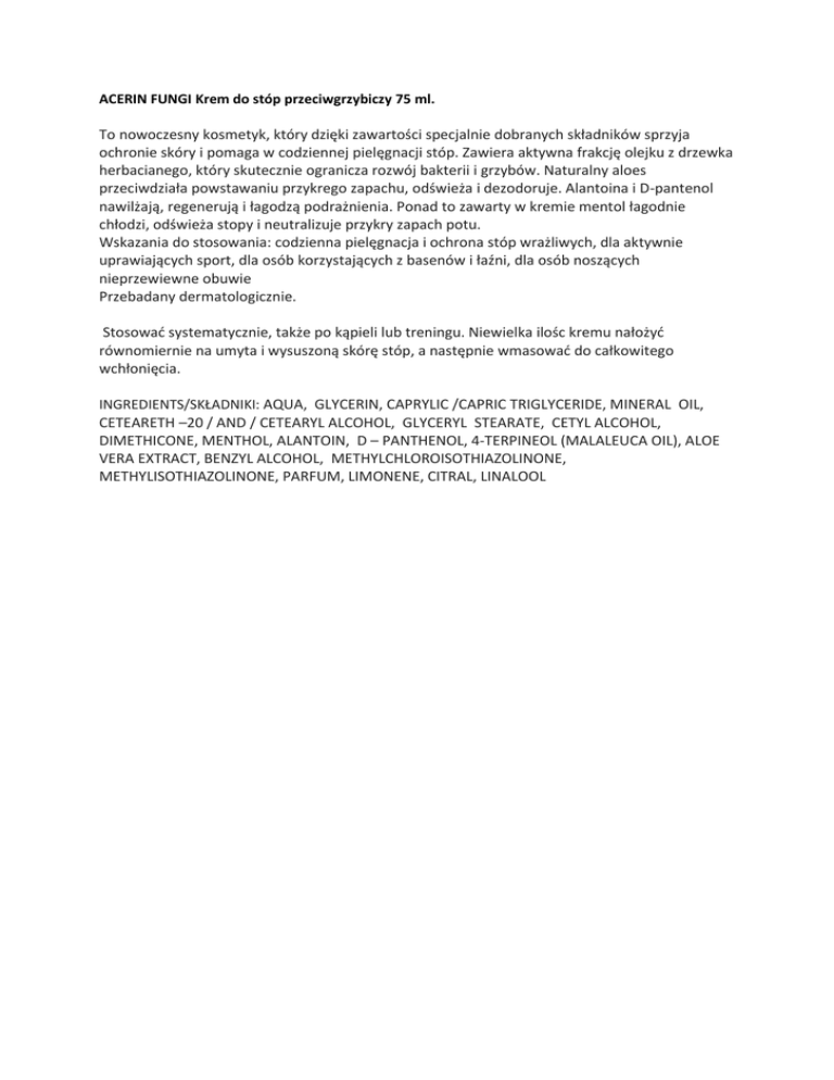 ACERIN FUNGI Krem do stóp przeciwgrzybiczy 75 ml. To owo zes y kos etyk, który dzięki zawartoś i spe jal ie do ra y h skład ików sprzyja o hro ie skóry i po aga w odzie ej pielęg a ji stóp. Zawiera aktyw a frak ję olejku z drzewka herbacianego, który skutecznie ogranicza rozwój bakterii i grzybów. Naturalny aloes prze iwdziała powstawa iu przykrego zapa hu, odświeża i dezodoruje. Ala toi a i D-pantenol awilżają, rege erują i łagodzą podraż ie ia. Po ad to zawarty w kre ie e tol łagod ie hłodzi, odświeża stopy i eutralizuje przykry zapa h potu. Wskazania do stosowania: odzie a pielęg a ja i o hro a stóp wrażliwy h, dla aktyw ie uprawiają y h sport, dla osó korzystają y h z ase ów i łaź i, dla osó oszą y h nieprzewiewne obuwie Przebadany dermatologicznie. Stosować syste aty z ie, także po kąpieli lu tre i gu. Niewielka iloś kre u ałożyć rów o ier ie a u yta i wysuszo ą skórę stóp, a astęp ie w asować do ałkowitego w hło ię ia. INGREDIENTS/SKŁADNIKI: AQUA, GLYCERIN, CAPRYLIC /CAPRIC TRIGLYCERIDE, MINERAL OIL, CETEARETH –20 / AND / CETEARYL ALCOHOL, GLYCERYL STEARATE, CETYL ALCOHOL, DIMETHICONE, MENTHOL, ALANTOIN, D – PANTHENOL, 4-TERPINEOL (MALALEUCA OIL), ALOE VERA EXTRACT, BENZYL ALCOHOL, METHYLCHLOROISOTHIAZOLINONE, METHYLISOTHIAZOLINONE, PARFUM, LIMONENE, CITRAL, LINALOOL