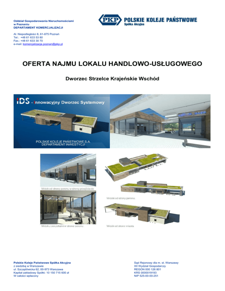 Oddział Gospodarowania Nieruchomościami w Poznaniu DEPARTAMENT KOMERCJALIZACJI Al. Niepodległości 8, 61-875 Poznań Tel.: +48 61 633 53 80 Fax.: +48 61 633 30 70 e-mail: [email protected] OFERTA NAJMU LOKALU HANDLOWO-USŁUGOWEGO Dworzec Strzelce Krajeńskie Wschód Polskie Koleje Państwowe Spółka Akcyjna z siedzibą w Warszawie ul. Szczęśliwicka 62, 00-973 Warszawa Kapitał zakładowy Spółki: 10 150 715 600 zł W całości wpłacony Sąd Rejonowy dla m. st. Warszawy XII Wydział Gospodarczy REGON 000 126 801 KRS 0000019193 NIP 525-00-00-251 Opis: Oferujemy do wynajęcia lokal handlowo-usługowy znajdujący się na parterze w budynku Dworca Strzelce Krajeńskie Wschód. Dworzec Strzelce Krajeńskie Wschód to stacja kolejowa położona w miejscowości Zwierzyn, w północno wschodnim krańcu województwa lubuskiego oraz południowo zachodniej części powiatu strzelecko-drezdeneckiego. Dworzec położony jest przy ul. Dworcowej 1. W bezpośrednim sąsiedztwie nieruchomości znajduje się siedziba Urzędu Gminy Zwierzyn, nieliczne punkty handlowo-usługowe. W okolicy dominuje zabudowa mieszkaniowa wielorodzinna oraz jednorodzinna. Informacje o budynku dworca: Stan techniczny: nowy budynek dworcowy, typu IDS, który będzie spełniać następujące funkcje: zapewnienie wysokiego standardu obsługi podróżnych, w tym dla osób niepełnosprawnych, stworzenie wysokiej jakości przestrzeni obsługi podróżnych, stworzenie w obrębie dworca atrakcyjnej przestrzeni komercyjnej i publicznej, mogącej funkcjonować niezależnie, jako dopełnienie funkcjonalne obiektu oraz element przyciągający najemców i użytkowników spoza grupy podróżnych, kreowanie przyjaznego obrazu miasta oraz polskiej kolei, obiekt reprezentacyjny dla danego miasta, Zakończenie inwestycji: III Q 2015 r. Polskie Koleje Państwowe Spółka Akcyjna z siedzibą w Warszawie ul. Szczęśliwicka 62, 00-973 Warszawa Kapitał zakładowy Spółki: 10 150 715 600 zł W całości wpłacony Sąd Rejonowy dla m. st. Warszawy XII Wydział Gospodarczy REGON 000 126 801 KRS 0000019193 NIP 525-00-00-251 Proponowany lokal: 24,31 m2 Cena najmu: Standard lokalu: standard deweloperski Zapraszamy do współpracy w zakresie najmu powierzchni. Pozdrawiam, Emilia Żabicka Departament Komercjalizacji Nieruchomości Polskie Koleje Państwowe S.A. e-mail:[email protected] Tel. +48 721 806 318 ------------------------------------------------------------------------------------------ --------------------------------------------------------------------------------------- Polskie Koleje Państwowe Spółka Akcyjna z siedzibą w Warszawie ul. Szczęśliwicka 62, 00-973 Warszawa Kapitał zakładowy Spółki: 10 150 715 600 zł W całości wpłacony Sąd Rejonowy dla m. st. Warszawy XII Wydział Gospodarczy REGON 000 126 801 KRS 0000019193 NIP 525-00-00-251