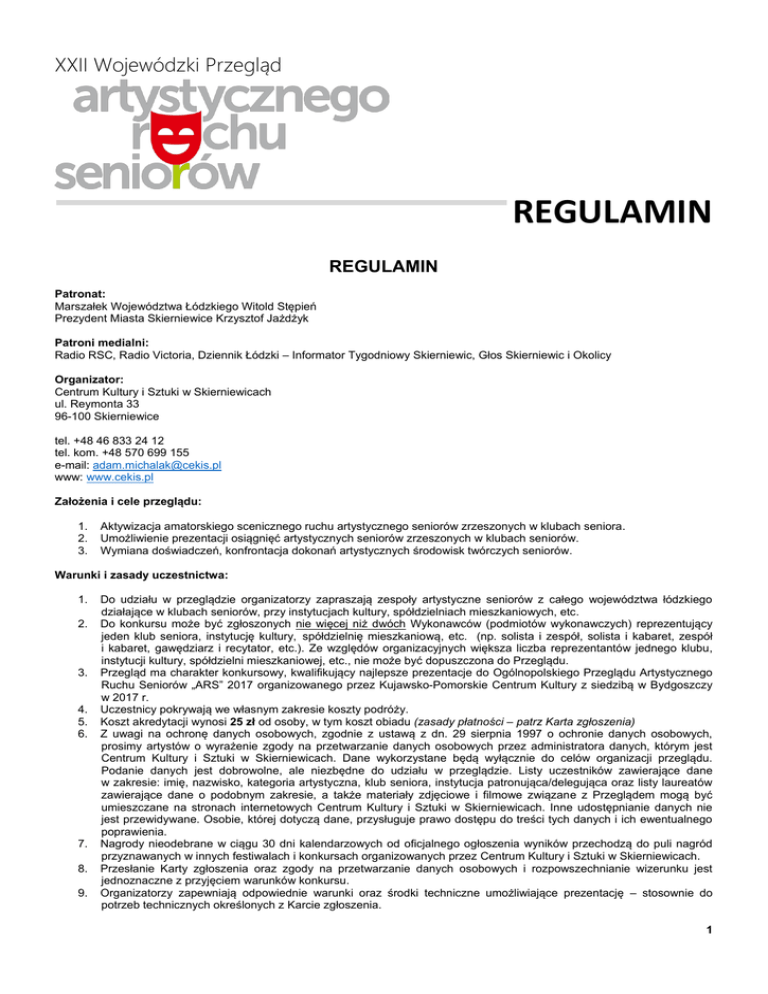 XXII Wojewódzki Przegląd REGULAMIN REGULAMIN Patronat: Marszałek Województwa Łódzkiego Witold Stępień Prezydent Miasta Skierniewice Krzysztof Jażdżyk Patroni medialni: Radio RSC, Radio Victoria, Dziennik Łódzki – Informator Tygodniowy Skierniewic, Głos Skierniewic i Okolicy Organizator: Centrum Kultury i Sztuki w Skierniewicach ul. Reymonta 33 96-100 Skierniewice tel. +48 46 833 24 12 tel. kom. +48 570 699 155 e-mail: [email protected] www: www.cekis.pl Założenia i cele przeglądu: 1. 2. 3. Aktywizacja amatorskiego scenicznego ruchu artystycznego seniorów zrzeszonych w klubach seniora. Umożliwienie prezentacji osiągnięć artystycznych seniorów zrzeszonych w klubach seniorów. Wymiana doświadczeń, konfrontacja dokonań artystycznych środowisk twórczych seniorów. Warunki i zasady uczestnictwa: 1. 2. 3. 4. 5. 6. 7. 8. 9. Do udziału w przeglądzie organizatorzy zapraszają zespoły artystyczne seniorów z całego województwa łódzkiego działające w klubach seniorów, przy instytucjach kultury, spółdzielniach mieszkaniowych, etc. Do konkursu może być zgłoszonych nie więcej niż dwóch Wykonawców (podmiotów wykonawczych) reprezentujący jeden klub seniora, instytucję kultury, spółdzielnię mieszkaniową, etc. (np. solista i zespół, solista i kabaret, zespół i kabaret, gawędziarz i recytator, etc.). Ze względów organizacyjnych większa liczba reprezentantów jednego klubu, instytucji kultury, spółdzielni mieszkaniowej, etc., nie może być dopuszczona do Przeglądu. Przegląd ma charakter konkursowy, kwalifikujący najlepsze prezentacje do Ogólnopolskiego Przeglądu Artystycznego Ruchu Seniorów „ARS” 2017 organizowanego przez Kujawsko-Pomorskie Centrum Kultury z siedzibą w Bydgoszczy w 2017 r. Uczestnicy pokrywają we własnym zakresie koszty podróży. Koszt akredytacji wynosi 25 zł od osoby, w tym koszt obiadu (zasady płatności – patrz Karta zgłoszenia) Z uwagi na ochronę danych osobowych, zgodnie z ustawą z dn. 29 sierpnia 1997 o ochronie danych osobowych, prosimy artystów o wyrażenie zgody na przetwarzanie danych osobowych przez administratora danych, którym jest Centrum Kultury i Sztuki w Skierniewicach. Dane wykorzystane będą wyłącznie do celów organizacji przeglądu. Podanie danych jest dobrowolne, ale niezbędne do udziału w przeglądzie. Listy uczestników zawierające dane w zakresie: imię, nazwisko, kategoria artystyczna, klub seniora, instytucja patronująca/delegująca oraz listy laureatów zawierające dane o podobnym zakresie, a także materiały zdjęciowe i filmowe związane z Przeglądem mogą być umieszczane na stronach internetowych Centrum Kultury i Sztuki w Skierniewicach. Inne udostępnianie danych nie jest przewidywane. Osobie, której dotyczą dane, przysługuje prawo dostępu do treści tych danych i ich ewentualnego poprawienia. Nagrody nieodebrane w ciągu 30 dni kalendarzowych od oficjalnego ogłoszenia wyników przechodzą do puli nagród przyznawanych w innych festiwalach i konkursach organizowanych przez Centrum Kultury i Sztuki w Skierniewicach. Przesłanie Karty zgłoszenia oraz zgody na przetwarzanie danych osobowych i rozpowszechnianie wizerunku jest jednoznaczne z przyjęciem warunków konkursu. Organizatorzy zapewniają odpowiednie warunki oraz środki techniczne umożliwiające prezentację – stosownie do potrzeb technicznych określonych z Karcie zgłoszenia. 1 10. Regulamin konkursu oraz Karta zgłoszenia wraz z deklarację dotyczącą zgody na przetwarzanie danych osobowych dostępne są na stronie internetowej www.cekis.pl Terminy i miejsce imprezy: 1. Nieprzekraczalny termin dostarczenia Kart zgłoszenia: 17 listopada 2016 r. (Decyduje data wpłynięcia do Organizatora). 2. Karty zgłoszenia mogą być dostarczane: drogą pocztową na adres: Centrum Kultury i Sztuki w Skierniewicach, ul. Reymonta 33, 96-100 Skierniewice drogą elektroniczną na adres: [email protected] 3. Termin imprezy: sobota 26 listopada 2016 r. – rozpoczęcie o godzinie 9:30 4. Miejsce imprezy: Centrum Kultury i Sztuki w Skierniewicach, Kinoteatr „Polonez”, ul. Wita Stwosza 2/4, 96-100 Skierniewice Kategorie artystyczne przeglądu: zespoły wokalne, instrumentalne i wokalno-instrumentalne (np. chóry, kapele podwórkowe, etc.) soliści (wokaliści i instrumentaliści) kabarety teatry dramatyczne, obrzędowe i jednego aktora zespoły folklorystyczne gawędziarze (posługujący się gwarą regionu, przy czym teksty powinny opierać się na przekazach, legendach i baśniach ludowych) recytatorzy tancerze (soliści i zespoły taneczne) Czas: Wykonawcy mogą przygotować repertuar o dowolnej tematyce, nie może być on jednak powieleniem materiału z ubiegłorocznego i poprzednich edycji Przeglądu. Dla poszczególnych kategorii artystycznych czas prezentacji nie może przekraczać: zespoły wokalne, instrumentalne i wokalno-instrumentalne – do 10 minut soliści – do 5 minut kabarety – do 20 minut teatry dramatyczne i obrzędowe – do 20 minut teatr jednego aktora (monodram) – do 5 minut zespoły folklorystyczne – do 20 minut gawędziarze – do 5 minut recytatorzy– do 5 minut tancerze (soliści i zespoły taneczne) – do 5 minut Wykonawcy, którzy przedłużą regulaminowy czas prezentacji mogą zostać zdyskwalifikowani i nie będą podlegać ocenie jury, a ich występ może zostać przerwany. Decyzję w tej sprawie podejmuje jury i ma ona charakter ostateczny. Ocena: Repertuar prezentowany przez uczestników przeglądu będzie oceniany pod względem: doboru repertuaru do możliwości wykonawczych uczestników oryginalność występu kultury muzycznej kultury słowa kultury scenicznej i reżyserii ogólnego wyrazu artystycznego doboru stroju ludowego zgodnie z prezentowanym regionem (dotyczy zespołów folklorystycznych) Nagrody: Dla najlepszych wykonawców w poszczególnych kategoriach przewidziano nagrody pieniężne. Jury zastrzega sobie prawo nieprzyznawania nagród w danej kategor