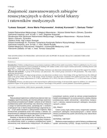 © Borgis Znajomość zaawansowanych zabiegów resuscytacyjnych u dzieci wśród lekarzy i ratowników medycznych *Łukasz Szarpak1, Anna Maria Patynowska2, Andrzej Kurowski1, 3, Dariusz Timler4 Instytut Ratownictwa Medycznego, Collegium Masoviense – Wyższa Szkoła Nauk o Zdrowiu, Żyrardów Kierownik Instytutu: prof. dr hab. n. med. Zbigniew Kopański 2 Studenckie Koło Naukowe Ratownictwa Medycznego, Collegium Masoviense – Wyższa Szkoła Nauk o Zdrowiu, Żyrardów Opiekun Koła: mgr Łukasz Szarpak 3 Instytut Kardiologii im. Prymasa Tysiąclecia Kardynała Stefana Wyszyńskiego, Warszawa Kierownik Instytutu: prof. dr hab. n. med. Witold Rużyłło 4 Zakład Medycyny Ratunkowej i Katastrof, Uniwersytet Medyczny, Łódź Kierownik Zakładu: dr hab. n. med. Tomasz Gaszyński 1 The knowledge on pediatric advanced life support in basic health caredoctors and paramedics Summary Introduction. Children cardiopulmonary resuscitation-respiratory different from adult resuscitation. Which is published every five years the European Resuscitation Council standards for dealing with sudden cardiac arrest require medical personnel, including doctors and paramedics – continuous updating of knowledge. Aim. The aim of this study was to assess the knowledge of primary care physicians and paramedics in advanced life support for children. Material and methods. A group of 80 primary care physicians. The control group consisted of 100 paramedics. The study used a authoring questionnaire. Results. Overall, across all subject groups primary care physicians accidents worse. Knowledge of the age limit between the child and adult in the group LPOZ was 37%, in the group. Group of primary care physicians compared with medical rescuers knew very little following issues: energy defibrillation (8 vs 98%), adrenaline (10 vs 99%), the dose of amiodarone (7.5 vs 95%) and a dose of fluids (10 vs 79%). Conclusions. Primary care physicians in the material had in sufficient knowledge of advanced life support in children. It is advisable to popularize higher in the group of primary care doctors’ knowledge of the patient’s current pediatric resuscitation guidelines. Key words: resuscitation, child, doctor, paramedic, treatment Wstęp Resuscytacja krążeniowo-oddechowa stanowi stan wymagający ogromnej wiedzy, jak również pełnego opanowania podczas prowadzonych działań. Lekarze (w tym lekarze podstawowej opieki zdrowotnej) oraz ratownicy medyczni z uwagi na wykonywaną pracę „spotykają się” z osobami znajdującymi się w stanie bezpośredniego zagrożenia życia – w tym także osobami z zatrzymaniem krążenia. Stąd konieczność posiadania przez nich wiedzy z zakresu zaawansowanych zabiegów resuscytacyjnych prowadzonych zarówno wśród osób dorosłych, jak i dzieci (1-4). Niestety w literaturze fachowej nie spotyka się doniesień zajmujących się problemem resuscytacji krążeniowo-oddechowej dzieci w praktyce podstawowej opieki zdrowotnej oraz ratowników medycznych. W związku z Nowa Pediatria 2/2013 powyższym autorzy uznali za celowe przeprowadzenie badań pozwalających na ocenę poziomu wiedzy lekarzy podstawowej opieki zdrowotnej i ratowników medycznych z zakresu zaawansowanych zabiegów resuscytacyjnych u dzieci. Cel pracy Celem pracy była próba oceny znajomości zaawansowanych zabiegów resuscytacyjnych u dzieci wśród lekarzy podstawowej opieki zdrowotnej oraz ratowników medycznych. Materiał i metody Badania przeprowadzono wśród lekarzy podstawowej opieki zdrowotnej (LPOZ). Grupę kontrolną stanowili 59 Łukasz Szarpak i wsp. ratownicy medyczni pracujący w ramach systemu państwowego ratownictwa medycznego (RM). Badania przeprowadzono na terenie województw mazowieckiego, łódzkiego oraz zachodniopomorskiego. Narzędziem badawczym był autorski kwestionariusz ankiety, oceniający wiedzę z zakresu zaawansowanych zabiegów resuscytacyjnych u dzieci. Test został opracowany w oparciu o wytyczne Europejskiej Rady Resuscytacji z 2010 roku. Pytania dotyczyły m.in. granicy wiekowej między dorosłym a dzieckiem, znajomości sekwencji postępowania podczas RKO u dziecka, defibrylacji oraz farmakoterapii w resuscytacji pacjenta pediatrycznego. Analizę statystyczną materiału badawczego przeprowadzono przy wykorzystaniu pakietu statystycznego STATISTICA 8.0. W ocenie różnic pomiędzy grupami zastosowano test nieparametryczny. Różnice istotne statystycznie pomiędzy grupami wyliczono testem nieparametrycznym dla dwóch prób niezależnych – test Kołmogorowa-Smirnowa. Wyniki uznawano za istotne statystycznie przy p < 0,05. Wyniki Kwestionariuszem ankiety objęto 180 osób: 80 lekarzy POZ oraz 100 ratowników medycznych (RM). W przeprowadzonych badaniach dominowały kobiety, stanowiąc 52,(2)% wszystkich respondentów, przy czym w grupie LPOZ stanowiły 70%, w grupie RM – 38%. Najliczniejszą grupę stanowiły osoby w przedziale wiekowym 31-35 lat. Ankietowanych poproszono o samoocenę w skali 1-5 (przy czym „1” – brak wiedzy, „5” – wiedza profesjonalna) wiedzy z zakresu zaawansowanych zabiegów resuscytacyjnych u dzieci. Średni poziom samooceny w całej grupie badawczej wynosił 3,95 ± 0,73 pkt i był pół punktu wyższy dla grupy LPOZ (Chi2 = 18,04419; p = 0,0000) (ryc. 1). W pytaniu pierwszym poproszono respondentów o wskazanie w oparciu o wytyczne ERC 2010 granicy wiekowej pomiędzy dorosłym. W grupie LPOZ odsetek poprawnych odpowiedzi wynosił 37% i był znacznie niższy aniżeli w grupie RM (94%). Pytanie 2: „Wskaż moment, w którym udasz się po pomoc podczas prowadzenia RKO dziecka (jesteś przygodnym świadkiem zdarzenia, nie wykonujesz w tym momencie czynności służbowych)”. Wiedzę, iż dopiero po 1 minucie prowadzenia resuscytacji krążeniowo-oddechowej należy udać się po pomoc w przypadku pacjenta pediatrycznego, posiadało 57,(2)% respondentów (LPOZ – 17,5%, RM – 89%). Różnice w udzielanych odpowiedziach w poszczególnych grupa