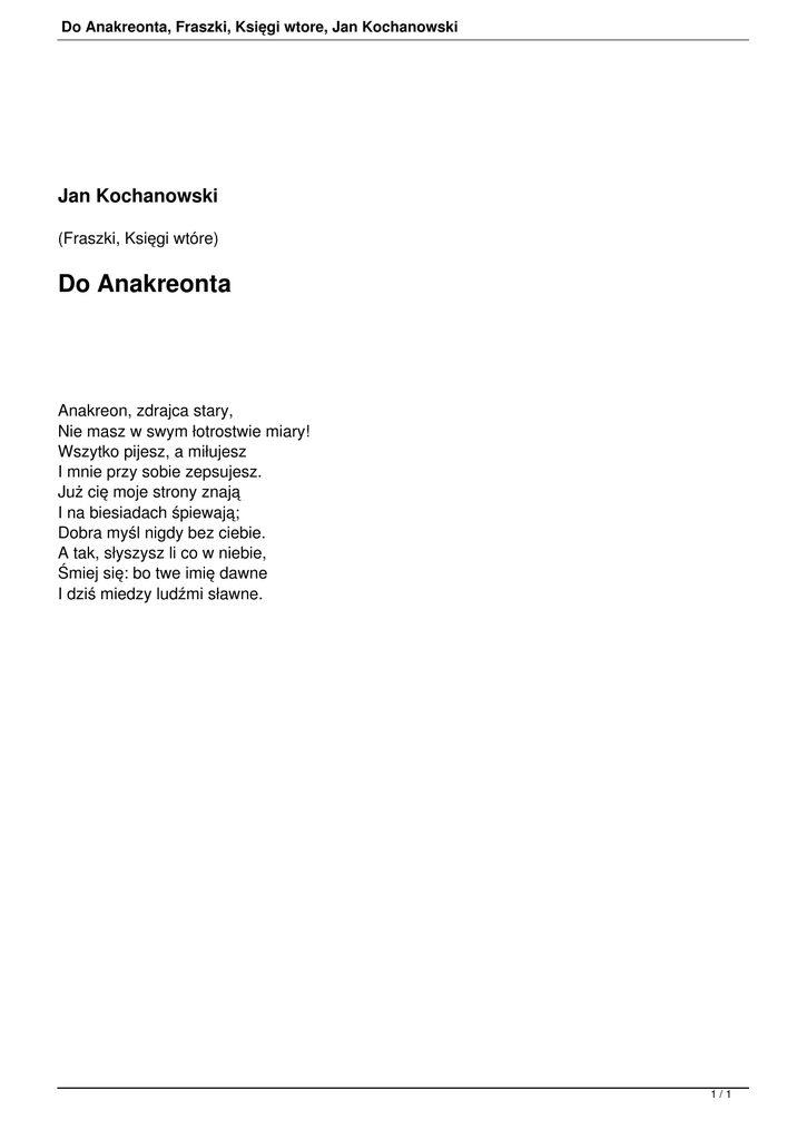 Do Anakreonta, Fraszki, Księgi wtore, Jan Kochanowski Jan Kochanowski (Fraszki, Księgi wtóre) Do Anakreonta Anakreon, zdrajca stary, Nie masz w swym łotrostwie miary! Wszytko pijesz, a miłujesz I mnie przy sobie zepsujesz. Już cię moje strony znają I na biesiadach śpiewają; Dobra myśl nigdy bez ciebie. A tak, słyszysz li co w niebie, Śmiej się: bo twe imię dawne I dziś miedzy ludźmi sławne. 1/1