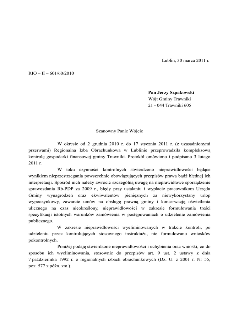 Lublin, 30 marca 2011 r. RIO – II – 601/60/2010 Pan Jerzy Szpakowski Wójt Gminy Trawniki 21 - 044 Trawniki 605 Szanowny Panie Wójcie W okresie od 2 grudnia 2010 r. do 17 stycznia 2011 r. (z uzasadnionymi przerwami) Regionalna Izba Obrachunkowa w Lublinie przeprowadziła kompleksową kontrolę gospodarki finansowej gminy Trawniki. Protokół omówiono i podpisano 3 lutego 2011 r. W toku czynności kontrolnych stwierdzono nieprawidłowości będące wynikiem nieprzestrzegania powszechnie obowiązujących przepisów prawa bądź błędnej ich interpretacji. Spośród nich należy zwrócić szczególną uwagę na nieprawidłowe sporządzenie sprawozdania Rb-PDP za 2009 r., błędy przy ustalaniu i wypłacie pracownikom Urzędu Gminy wynagrodzeń oraz ekwiwalentów pieniężnych za niewykorzystany urlop wypoczynkowy, zawarcie umów na obsługę prawną gminy i konserwację oświetlenia ulicznego na czas nieokreślony, nieprawidłowości w zakresie formułowania treści specyfikacji istotnych warunków zamówienia w postępowaniach o udzielenie zamówienia publicznego. W zakresie nieprawidłowości wyeliminowanych w trakcie kontroli, po udzieleniu przez kontrolujących stosownego instruktażu, nie formułowano wniosków pokontrolnych. Poniżej podaję stwierdzone nieprawidłowości i uchybienia oraz wnioski, co do sposobu ich wyeliminowania, stosownie do przepisów art. 9 ust. 2 ustawy z dnia 7 października 1992 r. o regionalnych izbach obrachunkowych (Dz. U. z 2001 r. Nr 55, poz. 577 z późn. zm.). 2 W załączniku do wystąpienia pokontrolnego wskazuję osoby odpowiedzialne za stwierdzone nieprawidłowości. 1. W zakresie rachunkowości i sprawozdawczości: 1.1. Przyjęcie w zakładowym planie kont Urzędu Gminy zasady funkcjonowania konta 130 „Rachunek bieżący jednostki” jako konta ewidencyjnego, na którym dokonuje się wyłącznie zapisów wtórnych do konta 133 „Rachunek budżetu”, mimo prowadzenia odrębnego rachunku bankowego Urzędu Gminy, za pomocą którego realizowane są wydatki majątkowe jednostki oraz nieujęcie w nim konta 223 „Rozliczenie wydatków budżetowych”, służącego do rozliczenia tych wydatków. Ustalić – w zakładowym planie kont Urzędu Gminy – faktycznie stosowane zasady klasyfikacji zdarzeń na koncie 130 „Rachunek bieżący jednostki ” oraz ująć w nim konto 223 „Rozliczenie wydatków budżetowych”, służące do rozliczenia wydatków ponoszonych przez Urząd Gminy z odrębnego rachunku inwestycyjnego, stosownie do przepisów art. 10 ust. 1 pkt 3 lit a ustawy z dnia 29 września 1994 r. o rachunkowości (Dz. U. z 2009 r. Nr 152, poz. 1223 z późn. zm.) oraz § 15 ust. 1 pkt 1 rozporządzenia Ministra Finansów z dnia 5 lipca 2010 r. w sprawie szczególnych zasad rachunkowości oraz planów kont dla budżetu państwa, budżetów jednostek samorządu terytorialnego, jednostek budżetowych, samorządowych zakładów budżetowych, państwowych funduszy celowych oraz państwowych jednostek budżetowych mających siedzibę poza granicami Rzeczypospolitej Polskiej (Dz. U. Nr 128, poz.861), zwanego w dalszej części tego wystąpienia „rozporządzeniem Ministra Finansów z dnia 5 lipca 2010 r.”. Aktualizowanie dokumentacji opisującej przyjęte zasady (politykę) rachunkowości należy do obowiązków kierownika jednostki, zgodnie z przepisami art. 10 ust. 2 powołanej ustawy – str. 5 - 7 protokołu. 1.2. Zamknięcie na koniec 2008 r. konta 201 „Rozrachunki z odbiorcami i dostawcami” (w dzienniku częściowym „Inwestycje”) tzw. „per saldem”, a w konsekwencji wykazanie w bilansie Urzędu Gminy sporządzonym na dzień 31 grudnia 2008 r. zaniżonych należności i zobowiązań krótkoterminowych z tytułu dostaw i usług – o kwotę 11.122,44 zł (do bilansu otwarcia 2009 r. wprowadzono prawidłowe salda należności i zobowiązań tego konta). Na kontach księgi głównej wykazywać rzeczywiste stany aktywów i pasywów, nie dokonując kompensaty należności i zobowiązań, w związku z przepisami art. 7 ust. 3 ustawy o rachunkowości i zasadami funkcjonowania konta 201 „Rozrachunki z odbiorcami i dostawcami”, określonymi w załączniku Nr 3 do rozporządzenia 3 Ministra Finansów z dnia 5 lipca 2010 r.; bilans jednostki budżetowej sporządzać na podstawie danych wynikających z prawidłowo prowadzonych ksiąg rachunkowych, w związku z przepisami art. 4 ust. 2 wymienionej ustawy. Wykazane w księgach rachunkowych na dzień ich zamknięcia stany aktywów i pasywów ujmować w tej samej wysokości, w otwartych na następny rok obrotowy księgach rachunkowych, stosownie do przepisów art. 5 ust. 1 ustawy o rachunkowości – str. 7 - 8 protokołu. 1.3. Niezachowanie zasady ewidencjonowania operacji gospodarczych w porządku systematycznym. Zapisów operacji gospodarczych dokonywać w porządku systematycznym, w związku z przepisami art. 15 ust. 1 ustawy o rachunkowości, w szczególności: a) dokonywanie wydatków inwestycyjnych ze środków znajdujących się na wyodrębnionym rachunku inwestycyjnym Urzędu Gminy, ujmować: * w księdze głównej budżetu gminy: - przekazanie środków z budżetu na rachunek bankowy inwestycji: Wn 223 „Rozliczenie wydatków budżetowych”, Ma 133 „Rachunek budżetu”, * w księdze głównej Urzędu Gminy - wpływ środków na rachunek bankowy jednostki budżetowej służący finansowaniu wydatków inwestycyjnych (na podstawie wyciągu bankowego do tego rachunku): Wn 130 „Rachunek bieżący jednostki” (inwestycje), Ma 223 „Rozliczenie wydatków budżetowych”, - wynagrodzenie wykonawcy (na podstawie wystawionej faktury): Wn 080 „Inwestycje (środki trwałe w budowie)”, Ma 201 „Rozrachunki z odbiorcami i dostawcami”, - zapłata wynagrodzenia: Wn 201 „Rozrachunki z odbiorcami i dostawcami”, Ma 130 „Rachunek bieżący jednostki” (inwestycje) oraz zapis równoległy: Wn 810 „Dotacje budżetowe, płatności z budżetu środków europejskich oraz śr