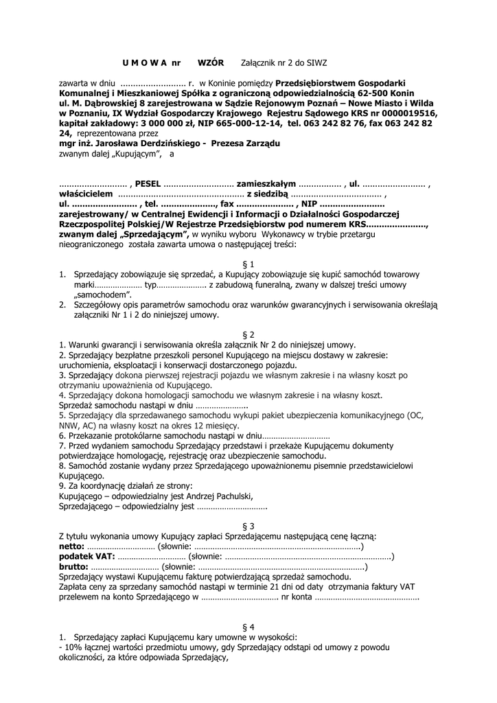 U M O W A nr WZÓR Załącznik nr 2 do SIWZ zawarta w dniu .......................... r. w Koninie pomiędzy Przedsiębiorstwem Gospodarki Komunalnej i Mieszkaniowej Spółka z ograniczoną odpowiedzialnością 62-500 Konin ul. M. Dąbrowskiej 8 zarejestrowana w Sądzie Rejonowym Poznań – Nowe Miasto i Wilda w Poznaniu, IX Wydział Gospodarczy Krajowego Rejestru Sądowego KRS nr 0000019516, kapitał zakładowy: 3 000 000 zł, NIP 665-000-12-14, tel. 063 242 82 76, fax 063 242 82 24, reprezentowana przez mgr inŜ. Jarosława Derdzińskiego - Prezesa Zarządu zwanym dalej „Kupującym”, a ........................... , PESEL ............................ zamieszkałym ................. , ul. ......................... , właścicielem .................................................. z siedzibą .................................... , ul. ......................... , tel. ....................., fax ...................... , NIP ......................... zarejestrowany/ w Centralnej Ewidencji i Informacji o Działalności Gospodarczej Rzeczpospolitej Polskiej/W Rejestrze Przedsiębiorstw pod numerem KRS......................., zwanym dalej „Sprzedającym”, w wyniku wyboru Wykonawcy w trybie przetargu nieograniczonego została zawarta umowa o następującej treści: §1 1. Sprzedający zobowiązuje się sprzedać, a Kupujący zobowiązuje się kupić samochód towarowy marki………………… typ…………………. z zabudową funeralną, zwany w dalszej treści umowy „samochodem”. 2. Szczegółowy opis parametrów samochodu oraz warunków gwarancyjnych i serwisowania określają załączniki Nr 1 i 2 do niniejszej umowy. §2 1. Warunki gwarancji i serwisowania określa załącznik Nr 2 do niniejszej umowy. 2. Sprzedający bezpłatne przeszkoli personel Kupującego na miejscu dostawy w zakresie: uruchomienia, eksploatacji i konserwacji dostarczonego pojazdu. 3. Sprzedający dokona pierwszej rejestracji pojazdu we własnym zakresie i na własny koszt po otrzymaniu upowaŜnienia od Kupującego. 4. Sprzedający dokona homologacji samochodu we własnym zakresie i na własny koszt. SprzedaŜ samochodu nastąpi w dniu ………………….. 5. Sprzedający dla sprzedawanego samochodu wykupi pakiet ubezpieczenia komunikacyjnego (OC, NNW, AC) na własny koszt na okres 12 miesięcy. 6. Przekazanie protokólarne samochodu nastąpi w dniu………………………… 7. Przed wydaniem samochodu Sprzedający przedstawi i przekaŜe Kupującemu dokumenty potwierdzające homologację, rejestrację oraz ubezpieczenie samochodu. 8. Samochód zostanie wydany przez Sprzedającego upowaŜnionemu pisemnie przedstawicielowi Kupującego. 9. Za koordynację działań ze strony: Kupującego – odpowiedzialny jest Andrzej Pachulski, Sprzedającego – odpowiedzialny jest …………………………. §3 Z tytułu wykonania umowy Kupujący zapłaci Sprzedającemu następującą cenę łączną: netto: ………………………… (słownie: ……………………………………………………………….) podatek VAT: ………………………… (słownie: ……………………………………………………………….) brutto: ………………………… (słownie: ……………………………………………………………….) Sprzedający wystawi Kupującemu fakturę potwierdzającą sprzedaŜ samochodu. Zapłata ceny za sprzedany samochód nastąpi w terminie 21 dni od daty otrzymania faktury VAT przelewem na konto Sprzedającego w ……………………………. nr konta ………………………………………. §4 1. Sprzedający zapłaci Kupującemu kary umowne w wysokości: - 10% łącznej wartości przedmiotu umowy, gdy Sprzedający odstąpi od umowy z powodu okoliczności, za które odpowiada Sprzedający, - 0,5% ceny nie dostarczonego przedmiotu umowy – za kaŜdy dzień zwłoki, licząc od wymaganego w myśl § 2 umowy terminu dostawy. 2. Postanowienia ust. 1 nie wyłączają prawa Kupującego do dochodzenia od Sprzedającego odszkodowania uzupełniającego na zasadach ogólnych, jeŜeli wartość powstałej szkody przekroczy wysokość kar umownych. §5 1. Zmiany niniejszej umowy wymagają dla swej waŜności formy pisemnej pod rygorem niewaŜności. 2. Zakazuje się zmian postanowień zawartej umowy w stosunku do treści oferty, na podstawie której dokonano wyboru Sprzedającego, chyba Ŝe konieczność wprowadzenia takich zmian wynika z okoliczności, których nie moŜna było przewidzieć w chwili zawarcia umowy lub zmiany te są korzystne dla Kupującego. §6 W razie zaistnienia istotnej zmiany okoliczności powodującej, Ŝe wykonanie umowy nie leŜy w interesie publicznym, czego nie moŜna było przewidzieć w chwili zawarcia umowy, Kupujący moŜe odstąpić od umowy w terminie 30 dni od powzięcia wiadomości o tych okolicznościach. W takim przypadku Sprzedający moŜe Ŝądać wyłącznie wynagrodzenia naleŜnego z tytułu wykonania części umowy. Odstąpienie od umowy, o którym mowa w ust. 1, powinno nastąpić w formie pisemnej i zawierać uzasadnienie pod rygorem niewaŜności takiego oświadczenia. §7 1. W przypadku wystąpienia trudności z interpretacją umowy Kupujący i Sprzedający będą się posiłkować postanowieniami oferty i specyfikacji istotnych warunków zamówienia. 2. Spory powstałe na tle realizacji niniejszej umowy będą rozstrzygane przez sąd powszechny właściwy dla siedziby Kupującego. §8 Zabrania się cesji wierzytelności wynikających z niniejszej umowy na osoby trzecie bez pisemnej zgody Kupującego. §9 W sprawach nieuregulowanych niniejszą umową mają zastosowanie właściwe przepisy ustawy z dnia 29 stycznia 2004 r. Prawo zamówieniach publicznych oraz Kodeksu cywilnego. § 10 Umowę sporządzono w 2 jednobrzmiących egzemplarzach, po 1 egz. dla kaŜdej ze stron. KUPUJĄCY _______________________ SPRZEDAJĄCY ________________________ Załącznik Nr 1 do umowy Szczegółowy opis parame
