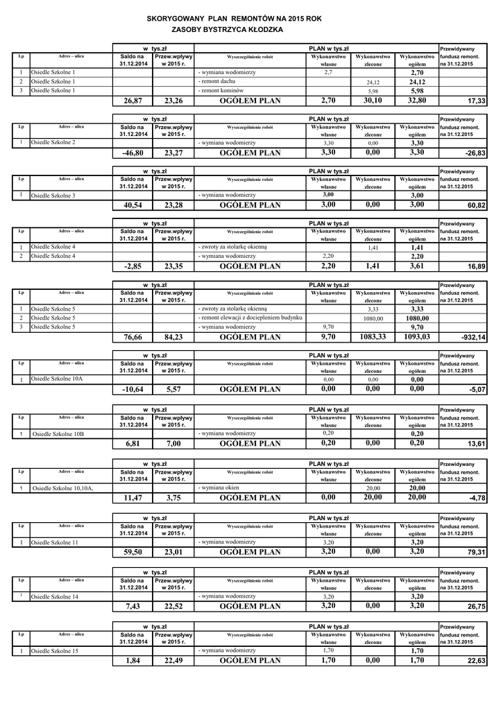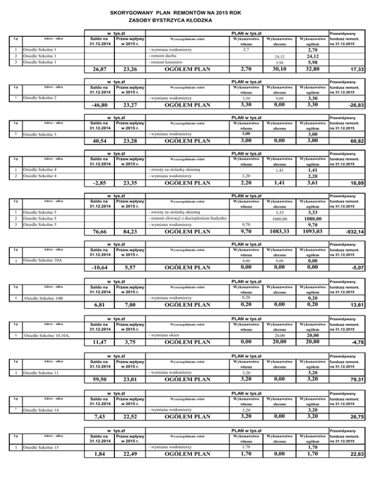 SKORYGOWANY PLAN REMONTÓW NA 2015 ROK ZASOBY BYSTRZYCA KŁODZKA w tys.zł Lp Adres – ulica Saldo na 31.12.2014 Przew.wpływy w 2015 r. PLAN w tys.zł Wyszczególnienie robót 1 Osiedle Szkolne 1 - wymiana wodomierzy 2 3 Osiedle Szkolne 1 Osiedle Szkolne 1 - remont dachu 23,26 OGÓŁEM PLAN w tys.zł 1 Adres – ulica Saldo na 31.12.2014 Przew.wpływy w 2015 r. Osiedle Szkolne 2 23,27 OGÓŁEM PLAN w tys.zł Lp 1 Adres – ulica Saldo na 31.12.2014 Przew.wpływy w 2015 r. 40,54 23,28 OGÓŁEM PLAN w tys.zł Lp 1 2 Adres – ulica Saldo na 31.12.2014 Przew.wpływy w 2015 r. 23,35 OGÓŁEM PLAN w tys.zł 1 2 3 Adres – ulica Saldo na 31.12.2014 Przew.wpływy w 2015 r. OGÓŁEM PLAN w tys.zł Adres – ulica 1 Osiedle Szkolne 10A 1 Adres – ulica 1 1 1 Wykonawstwo zlecone Wykonawstwo ogółem 1,41 1,41 2,20 1,41 3,61 Wykonawstwo zlecone Wykonawstwo ogółem 3,33 1080,00 3,33 1080,00 9,70 1083,33 1093,03 Wykonawstwo zlecone Wykonawstwo ogółem Wykonawstwo własne Wykonawstwo własne 0,00 0,00 0,00 Wykonawstwo zlecone Wykonawstwo ogółem 0,00 0,20 Wykonawstwo własne Wykonawstwo zlecone Wykonawstwo ogółem 20,00 20,00 0,00 20,00 20,00 Wykonawstwo zlecone Wykonawstwo ogółem 0,00 3,20 Wykonawstwo zlecone Wykonawstwo ogółem 0,00 3,20 Wykonawstwo zlecone Wykonawstwo ogółem 0,00 1,70 Przew.wpływy w 2015 r. PLAN w tys.zł Wyszczególnienie robót - wymiana wodomierzy 7,00 OGÓŁEM PLAN Saldo na 31.12.2014 Przew.wpływy w 2015 r. 11,47 3,75 Wykonawstwo własne - wymiana okien OGÓŁEM PLAN Saldo na 31.12.2014 Przew.wpływy w 2015 r. 59,50 23,01 - wymiana wodomierzy OGÓŁEM PLAN Saldo na 31.12.2014 Przew.wpływy w 2015 r. 7,43 22,52 OGÓŁEM PLAN Przew.wpływy w 2015 r. 1,84 22,49 OGÓŁEM PLAN Wykonawstwo własne 13,61 fundusz remont. na 31.12.2015 -4,78 fundusz remont. na 31.12.2015 79,31 fundusz remont. na 31.12.2015 26,75 Przewidywany 1,70 1,70 fundusz remont. na 31.12.2015 3,20 3,20 3,20 -5,07 Przewidywany PLAN w tys.zł Wyszczególnienie robót - wymiana wodomierzy Osiedle Szkolne 15 Wykonawstwo własne fundusz remont. na 31.12.2015 3,20 3,20 3,20 -932,14 Przewidywany PLAN w tys.zł Wyszczególnienie robót - wymiana wodomierzy Saldo na 31.12.2014 Wykonawstwo własne fundusz remont. na 31.12.2015 Przewidywany PLAN w tys.zł Wyszczególnienie robót 16,89 0,20 PLAN w tys.zł Wyszczególnienie robót fundusz remont. na 31.12.2015 Przewidywany 0,20 0,20 60,82 Przewidywany 0,00 Saldo na 31.12.2014 fundusz remont. na 31.12.2015 Przewidywany 9,70 9,70 -26,83 Przewidywany 2,20 2,20 fundusz remont. na 31.12.2015 3,00 0,00 Osiedle Szkolne 14 Adres – ulica 3,00 0,00 w tys.zł Lp 0,00 3,00 3,00 17,33 Przewidywany OGÓŁEM PLAN Osiedle Szkolne 11 Adres – ulica Wykonawstwo ogółem 5,57 w tys.zł Lp Wykonawstwo zlecone -10,64 Osiedle Szkolne 10,10A, Adres – ulica 3,30 3,30 Wykonawstwo własne w tys.zł Lp 0,00 0,00 PLAN w tys.zł w tys.zł 1 3,30 Wykonawstwo własne fundusz remont. na 31.12.2015 Przewidywany Wyszczególnienie robót Osiedle Szkolne 10B Adres – ulica Wykonawstwo ogółem Przew.wpływy w 2015 r. 6,81 Lp Wykonawstwo zlecone Saldo na 31.12.2014 w tys.zł Lp 32,80 PLAN w tys.zł Wyszczególnienie robót - wymiana wodomierzy 84,23 30,10 3,30 - remont elewacji z dociepleniem budynku 76,66 Lp Wykonawstwo własne - zwroty za stolarkę okienną Osiedle Szkolne 5 Osiedle Szkolne 5 Osiedle Szkolne 5 5,98 2,70 24,12 5,98 PLAN w tys.zł Wyszczególnienie robót - wymiana wodomierzy -2,85 Lp 2,70 - zwroty za stolarkę okienną Osiedle Szkolne 4 Osiedle Szkolne 4 24,12 PLAN w tys.zł Wyszczególnienie robót - wymiana wodomierzy Osiedle Szkolne 3 Wykonawstwo ogółem PLAN w tys.zł Wyszczególnienie robót - wymiana wodomierzy -46,80 Przewidywany Wykonawstwo zlecone 2,7 - remont kominów 26,87 Lp Wykonawstwo własne fundusz remont. na 31.12.2015 1,70 22,63 w tys.zł Adres – ulica Lp 1 Saldo na 31.12.2014 Przew.wpływy w 2015 r. 3,23 9,90 PLAN w tys.zł Wyszczególnienie robót - wymiana wodomierzy 1000-lecia PP 4 OGÓŁEM PLAN w tys.zł Adres – ulica Lp 1 Saldo na 31.12.2014 Przew.wpływy w 2015 r. -0,66 10,01 OGÓŁEM PLAN w tys.zł Adres – ulica Lp Saldo na 31.12.2014 Przew.wpływy w 2015 r. Konopnickiej 2 - zwroty za stolarkę okienną 2 Konopnickiej 2 - remont elewacji z dociepleniem budynku 3 Konopnickiej 2 - remont kominów 4 Konopnickiej 2 - wykonanie odwodnienia ściany bocznej 5 Konopnickiej 2 - wymiana wodomierzy 89,84 OGÓŁEM PLAN Adres – ulica 1 Wojska Polskiego 27 Wojska Polskiego 27 Wojska Polskiego 27 2 3 Saldo na 31.12.2014 Przew.wpływy w 2015 r. 1 Saldo na 31.12.2014 Przew.wpływy w 2015 r. 64,40 8,69 Wykonawstwo własne 1,20 Wykonawstwo zlecone Wykonawstwo ogółem 0,46 0,46 1200,00 33,50 13,80 9,40 13,80 Wykonawstwo własne Wykonawstwo zlecone Wykonawstwo ogółem 2,2 1,12 3,32 3,00 3,00 2,20 4,12 6,32 Wykonawstwo własne Wykonawstwo zlecone Wykonawstwo ogółem 5,00 5,00 OGÓŁEM PLAN 0,00 5,00 5,00 OGÓŁEM PLAN ROK Okres Wykonawstwo własne Plan 457,27 394,49 2015 43,40 -946,36 fundusz remont. na 31.12.2015 21,73 Przewidywany PLAN w tys.zł Przew.wpływy w 2015 r. fundusz remont. na 31.12.2015 Przewidywany PLAN w tys.zł Wyszczególnienie robót 8,15 Przewidywany 9,40 9,40 fundusz remont. na 31.12.2015 1,20 33,50 Saldo na 31.12.2014 Zasoby Bystrzyca Kł. 0,00 11,73 Przewidywany 1200,00 w tys.zł Fund. remont. Wykonawstwo ogółem 1,2 1,20 - remont oświetlenia Garaże Wykonawstwo zlecone fundusz remont. na 31.12.2015 1,40 PLAN w tys.zł Wyszczególnienie robót w tys.zł Adres – ulica Lp Wykonawstwo własne - wymiana wodomierzy - poszerzenie wjazdu na parking 18,07 1,40 1257,16 - zwroty za stolarkę okienną 9,98 0,00 1,40 1,40 1247,76 w tys.zł Lp Wykonawstwo ogółem PLAN w tys.zł Wyszczególnienie robót 1 220,96 Przewidywany Wykonawstwo zlecone PLAN w tys.zł Wyszczególnienie robót - wymiana wodomierzy 1000-lecia PP 8 Wykonawstwo własne fundusz remont. na 31.12.2015 68,09 Pozostały Wykonawstwo Wykonawstwo fundusz remont. na 31.12.2015 zlecon