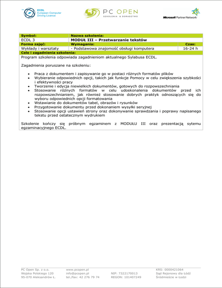 Symbol: Nazwa szkolenia: ECDL 3 MODUŁ III – Przetwarzanie tekstów Forma zajęć: Wymagania: Wykłady i warsztaty - Podstawowa znajomość obsługi komputera Czas: 16-24 h Cele i zagadnienia szkolenia: Program szkolenia odpowiada zagadnieniom aktualnego Sylabusa ECDL. Zagadnienia poruszane na szkoleniu: Praca z dokumentem i zapisywanie go w postaci różnych formatów plików Wybieranie odpowiednich opcji, takich jak funkcje Pomocy w celu zwiększenia szybkości i efektywności pracy Tworzenie i edycja niewielkich dokumentów, gotowych do rozpowszechniania Stosowanie różnych formatów w celu udoskonalenia dokumentów przed ich rozpowszechnianiem, jak również stosowanie dobrych praktyk odnoszących się do wyboru odpowiednich opcji formatowania Wstawianie do dokumentów tabel, obrazów i rysunków Przygotowanie dokumentu przed dokonaniem wysyłki seryjnej Stosowanie opcji ustawień strony oraz dokonywanie sprawdzania i poprawy napisanego tekstu przed ostatecznym wydrukiem Szkolenie kończy się próbnym egzaminacyjnego ECDL. PC Open Sp. z o.o. Wojska Polskiego 120 95-070 Aleksandrów Ł. egzaminem www.pcopen.pl [email protected] tel./fax: 42 276 79 74 z MODUŁU III NIP: 7322170013 REGON: 101407249 oraz prezentacją sytemu KRS: 0000421064 Sąd Rejonowy dla Łódź Śródmieście w Łodzi