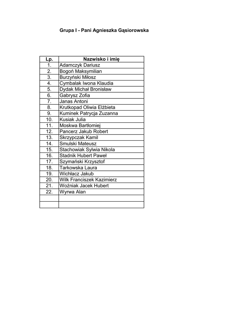 Grupa I - Pani Agnieszka Gąsiorowska Lp. Nazwisko i imię 1