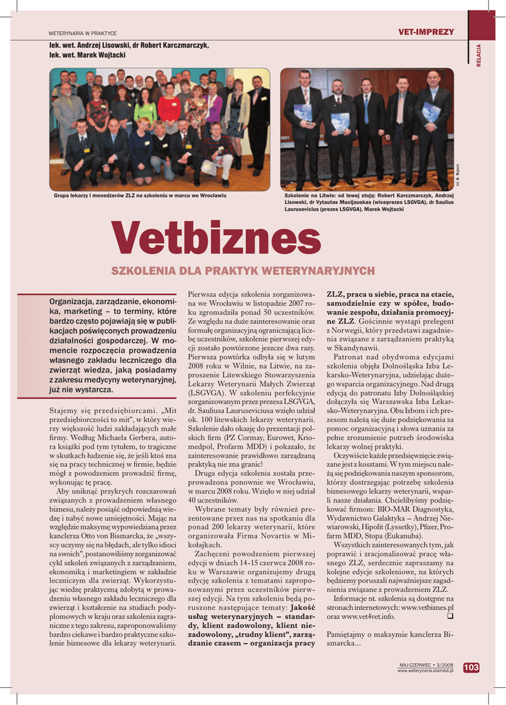 VET-IMPREZY WETERYNARIA W PRAKTYCE fot. M. Wojtacki RELACJA lek. wet. Andrzej Lisowski, dr Robert Karczmarczyk, lek. wet. Marek Wojtacki Grupa lekarzy i menedżerów ZLZ na szkoleniu w marcu we Wrocławiu Szkolenie na Litwie: od lewej stoją: Robert Karczmarczyk, Andrzej Lisowski, dr Vytautas Macijauskas (wiceprezes LSGVGA), dr Saulius Laurusevicius (prezes LSGVGA), Marek Wojtacki Vetbiznes SZKOLENIA DLA PRAKTYK WETERYNARYJNYCH Organizacja, zarządzanie, ekonomika, marketing – to terminy, które bardzo często pojawiają się w publikacjach poświęconych prowadzeniu działalności gospodarczej. W momencie rozpoczęcia prowadzenia własnego zakładu leczniczego dla zwierząt wiedza, jaką posiadamy z zakresu medycyny weterynaryjnej, już nie wystarcza. Stajemy się przedsiębiorcami. „Mit przedsiębiorczości to mit”, w który wierzy większość ludzi zakładających małe firmy. Według Michaela Gerbera, autora książki pod tym tytułem, to tragiczne w skutkach łudzenie się, że jeśli ktoś zna się na pracy technicznej w firmie, będzie mógł z powodzeniem prowadzić firmę, wykonując tę pracę. Aby uniknąć przykrych rozczarowań związanych z prowadzeniem własnego biznesu, należy posiąść odpowiednią wiedzę i nabyć nowe umiejętności. Mając na względzie maksymę wypowiedzianą przez kanclerza Otto von Bismarcka, że „wszyscy uczymy się na błędach, ale tylko idioci na swoich”, postanowiliśmy zorganizować cykl szkoleń związanych z zarządzaniem, ekonomiką i marketingiem w zakładzie leczniczym dla zwierząt. Wykorzystując wiedzę praktyczną zdobytą w prowadzeniu własnego zakładu leczniczego dla zwierząt i kształcenie na studiach podyplomowych w kraju oraz szkolenia zagraniczne z tego zakresu, zaproponowaliśmy bardzo ciekawe i bardzo praktyczne szkolenie biznesowe dla lekarzy weterynarii. Pierwsza edycja szkolenia zorganizowana we Wrocławiu w listopadzie 2007 roku zgromadziła ponad 50 uczestników. Ze względu na duże zainteresowanie oraz formułę organizacyjną ograniczającą liczbę uczestników, szkolenie pierwszej edycji zostało powtórzone jeszcze dwa razy. Pierwsza powtórka odbyła się w lutym 2008 roku w Wilnie, na Litwie, na zaproszenie Litewskiego Stowarzyszenia Lekarzy Weterynarii Małych Zwierząt (LSGVGA). W szkoleniu perfekcyjnie zorganizowanym przez prezesa LSGVGA, dr. Sauliusa Lauruseviciusa wzięło udział ok. 100 litewskich lekarzy weterynarii. Szkolenie dało okazję do prezentacji polskich firm (PZ Cormay, Eurowet, Kriomedpol, Profarm MDD) i pokazało, że zainteresowanie prawidłowo zarządzaną praktyką nie zna granic! Druga edycja szkolenia została przeprowadzona ponownie we Wrocławiu, w marcu 2008 roku. Wzięło w niej udział 40 uczestników. Wybrane tematy były również prezentowane przez nas na spotkaniu dla ponad 200 lekarzy weterynarii, które organizowała Firma Novartis w Mikołajkach. Zachęceni powodzeniem pierwszej edycji w dniach 14-15 czerwca 2008 roku w Warszawie organizujemy drugą edycję szkolenia z tematami zaproponowanymi przez uczestników pierwszej edycji. Na tym szkoleniu będą poruszone następujące tematy: Jakość usług weterynaryjnych – standardy, klient zadowolony, klient niezadowolony, „trudny klient”, zarządzanie czasem – organizacja pracy ZLZ, praca u siebie, praca na etacie, samodzielnie czy w spółce, budowanie zespołu, działania promocyjne ZLZ. Gościnnie wystąpi prelegent z Norwegii, który przedstawi zagadnienia związane z zarządzaniem praktyką w Skandynawii. Patronat nad obydwoma edycjami szkolenia objęła Dolnośląska Izba Lekarsko-Weterynaryjna, udzielając dużego wsparcia organizacyjnego. Nad drugą edycją do patronatu Izby Dolnośląskiej dołączyła się Warszawska Izba Lekarsko-Weterynaryjna. Obu Izbom i ich prezesom należą się duże podziękowania za pomoc organizacyjną i słowa uznania za pełne zrozumienie potrzeb środowiska lekarzy wolnej praktyki. Oczywiście każde przedsięwzięcie związane jest z kosztami. W tym miejscu należą się podziękowania naszym sponsorom, którzy dostrzegając potrzebę szkolenia biznesowego lekarzy weterynarii, wsparli nasze działania. Chcielibyśmy podziękować firmom: BIO-MAR Diagnostyka, Wydawnictwo Galaktyka – Andrzej Niewiarowski, Hipolit (Lyssetky), Pfizer, Profarm MDD, Stopa (Eukanuba). Wszystkich zainteresowanych tym, jak poprawić i zracjonalizować pracę własnego ZLZ, serdecznie zapraszamy na kolejne edycje szkoleniowe, na których będziemy poruszali najważniejsze zagadnienia związane z prowadzeniem ZLZ. Informacje nt. szkolenia są dostępne na stronach internetowych: www.vetbiznes.pl oraz www.vet4vet.info. Pamiętajmy o maksymie kanclerza Bismarcka… MAJ-CZERWIEC • 3/2008 www.weterynaria.elamed.pl 103