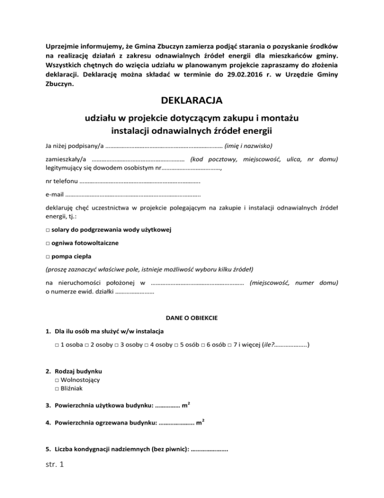 Uprzejmie informujemy, że Gmina Zbuczyn zamierza podjąć starania o pozyskanie środków na realizację działań z zakresu odnawialnych źródeł energii dla mieszkańców gminy. Wszystkich chętnych do wzięcia udziału w planowanym projekcie zapraszamy do złożenia deklaracji. Deklarację można składać w terminie do 29.02.2016 r. w Urzędzie Gminy Zbuczyn. DEKLARACJA udziału w projekcie dotyczącym zakupu i montażu instalacji odnawialnych źródeł energii Ja niżej podpisany/a ……………………………………………………………… (imię i nazwisko) zamieszkały/a ………………………………………………… (kod pocztowy, miejscowość, ulica, nr domu) legitymujący się dowodem osobistym nr………………………………, nr telefonu ……………………………………………………………….. e-mail ……………………………………………………………………….. deklaruję chęć uczestnictwa w projekcie polegającym na zakupie i instalacji odnawialnych źródeł energii, tj.: □ solary do podgrzewania wody użytkowej □ ogniwa fotowoltaiczne □ pompa ciepła (proszę zaznaczyć właściwe pole, istnieje możliwość wyboru kilku źródeł) na nieruchomości położonej w ………………………………………………… (miejscowość, numer domu) o numerze ewid. działki …………………… DANE O OBIEKCIE 1. Dla ilu osób ma służyć w/w instalacja □ 1 osoba □ 2 osoby □ 3 osoby □ 4 osoby □ 5 osób □ 6 osób □ 7 i więcej (ile?………………..) 2. Rodzaj budynku □ Wolnostojący □ Bliźniak 3. Powierzchnia użytkowa budynku: …………… m2 4. Powierzchnia ogrzewana budynku: ………………... m2 5. Liczba kondygnacji nadziemnych (bez piwnic): …………………. str. 1 6. Zacienienie dachu budynku □ Tak występuje (wysokie zadrzewienie, przesłonięcie innym budynkiem, itp.) od strony: □ południowej □ północnej □ wschodniej □ zachodniej □ południowo – wschodniej □ południowo - zachodniej □ północno – wschodniej □ północno – zachodniej □ Nie występuje 7. Zacienienie budynku □ Tak występuje (wysokie zadrzewienie, przesłonięcie innym budynkiem, itp.) od strony: □ południowej □ północnej □ wschodniej □ zachodniej □ południowo – wschodniej □ południowo - zachodniej □ północno – wschodniej □ północno – zachodniej □ Nie występuje 8. Rodzaj dachu. □ jednospadowy □ dwuspadowy □ płaski (nachylenie do 10%) □ wielospadowy 9. Kierunki, w które zwrócone są połacie dachu? □ południowy □ północny □ wschodni □ zachodni □ południowo – wschodni □ południowo - zachodni □ północno – wschodni □ północno – zachodni 10. Rodzaj pokrycia dachowego: □ blacha płaska □ blacho dachówka □ dachówka □ płyty azbestowo – cementowe (eternit) □ inne (jakie? ………………………………………) UWAGA! W przypadku pokrycia dachu eternitem nie ma możliwości instalacji urządzeń (solary, fotowoltaika) na dachu 11. Orientacyjna powierzchnia dachu dla instalacji wykorzystującej energię słoneczną (solary, fotowoltaika)1: □ od strony południowej ………………………. m2 □ od strony południowo – wschodniej ………………………. m2 □ od strony południowo – zachodniej ………………………. m2 12. Powierzchnia ściany budynku dla instalacji wykorzystującej energię słoneczną 2 (solary, fotowoltaika): □ od strony południowej ………………………. m2 □ od strony południowo – wschodniej ………………………. m2 □ od strony południowo – zachodniej ………………………. m2 13. Powierzchnia gruntu dla instalacji wykorzystującej energię słoneczną3 (solary, fotowoltaika): ………………… m2 w odległości od budynku ………………………. m. 14. Czy posiadacie Państwo instalację ciepłej wody użytkowej? □ tak □ nie 1 Wypełniamy w przypadku lokalizacji instalacji na dachu Wypełniamy w przypadku lokalizacji instalacji na ścianie 3 Wypełniamy w przypadku lokalizacji instalacji na gruncie 2 str. 2 15. Sposób przygotowania ciepłej wody użytkowej (proszę zaznaczyć wszystkie, które są wykorzystywane) □ kotłownia gazowa □ kotłownia olejowa □ kotłownia węglowa □ kotłownia na drewno □ bojler elektryczny □ ogrzewacz przepływowy □ instalacja solarna □ inny, jaki? ……………………………………………………………….. 16. Czy posiadacie już Państwo jakieś instalacje odnawialnych źródeł energii? □ nie □ tak Jakie? □ solary □ ogniwa fotowoltaiczne □ pompa ciepła □ Inne, jakie? …………………………. Moc instalacji [kW]:………………………….. 17. Proszę określić miesięczne zużycie wody w Państwa domu ………………… m 3 18. Proszę podać umowną (przyłączeniową) moc na energię elektryczną ……………. kW (z faktury za energię). 19. Jakie było roczne zużycie energii elektrycznej na podstawie rachunków za energię za 2015 r.? ………….. KWh Oświadczam, że: 1) Posiadam tytuł prawa własności do nieruchomości zabudowanej budynkiem mieszkalnym, oznaczonej jako działka geodezyjna nr …………………………. w miejscowości …………………………….. 2) W budynku przeznaczonym do instalacji odnawialnych źródeł energii jest / nie jest4 prowadzona działalność gospodarcza w rozumieniu ustawy z dnia 2 lipca 2004 r. o swobodzie działalności gospodarczej (Dz. U. 2015.584 ze zm.). 3) Świadomy, iż projekt realizowany będzie przez Gminę Zbuczyn wyrażam zgodę na jego realizację (montaż instalacji odnawialnych źródeł energii) na wskazanej nieruchomości przez wykonawcę wybranego przez gminę Zbuczyn. 4) Oświadczam, że w przypadku pozytywnej weryfikacji terenowej jestem gotów/a do podpisania umowy z Gminą Zbuczyn dot. montażu odnawialnych 