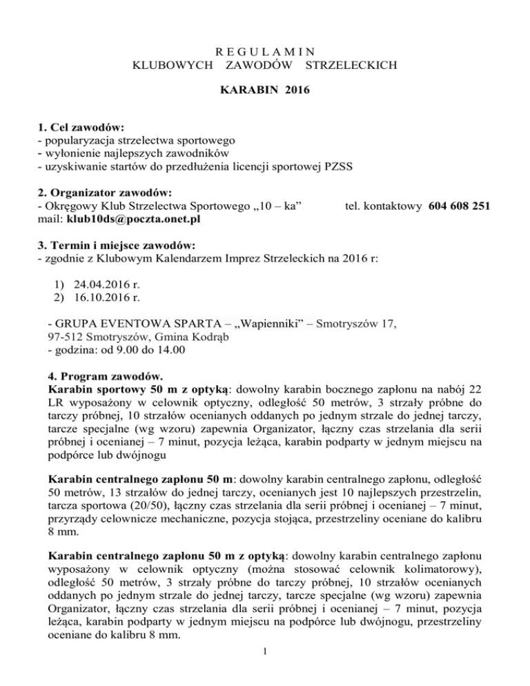 REGULAMIN KLUBOWYCH ZAWODÓW STRZELECKICH KARABIN 2016 1. Cel zawodów: - popularyzacja strzelectwa sportowego - wyłonienie najlepszych zawodników - uzyskiwanie startów do przedłużenia licencji sportowej PZSS 2. Organizator zawodów: - Okręgowy Klub Strzelectwa Sportowego „10 – ka” mail: [email protected] tel. kontaktowy 604 608 251 3. Termin i miejsce zawodów: - zgodnie z Klubowym Kalendarzem Imprez Strzeleckich na 2016 r: 1) 24.04.2016 r. 2) 16.10.2016 r. - GRUPA EVENTOWA SPARTA – „Wapienniki” – Smotryszów 17, 97-512 Smotryszów, Gmina Kodrąb - godzina: od 9.00 do 14.00 4. Program zawodów. Karabin sportowy 50 m z optyką: dowolny karabin bocznego zapłonu na nabój 22 LR wyposażony w celownik optyczny, odległość 50 metrów, 3 strzały próbne do tarczy próbnej, 10 strzałów ocenianych oddanych po jednym strzale do jednej tarczy, tarcze specjalne (wg wzoru) zapewnia Organizator, łączny czas strzelania dla serii próbnej i ocenianej – 7 minut, pozycja leżąca, karabin podparty w jednym miejscu na podpórce lub dwójnogu Karabin centralnego zapłonu 50 m: dowolny karabin centralnego zapłonu, odległość 50 metrów, 13 strzałów do jednej tarczy, ocenianych jest 10 najlepszych przestrzelin, tarcza sportowa (20/50), łączny czas strzelania dla serii próbnej i ocenianej – 7 minut, przyrządy celownicze mechaniczne, pozycja stojąca, przestrzeliny oceniane do kalibru 8 mm. Karabin centralnego zapłonu 50 m z optyką: dowolny karabin centralnego zapłonu wyposażony w celownik optyczny (można stosować celownik kolimatorowy), odległość 50 metrów, 3 strzały próbne do tarczy próbnej, 10 strzałów ocenianych oddanych po jednym strzale do jednej tarczy, tarcze specjalne (wg wzoru) zapewnia Organizator, łączny czas strzelania dla serii próbnej i ocenianej – 7 minut, pozycja leżąca, karabin podparty w jednym miejscu na podpórce lub dwójnogu, przestrzeliny oceniane do kalibru 8 mm. 1 Strzelba gładkolufowa: dowolna strzelba w kalibrze 12 z ręcznym przeładowaniem bez kolimatora, strzelby półautomatyczne są zabronione. Ilość potrzebnej amunicji - 9 szt. Opis konkurencji. Zadaniem zawodnika jest ostrzelanie, z zachowaniem ustalonej kolejności, celów metalowych (popperów) oraz rzutków wyrzucanych przez trafiony, upadający popper. Strzela się z jednego stanowiska. Przebieg konkurencji. 1. Zajęcie stanowiska strzeleckiego – zgłoszenie gotowości. 2. Po sygnale startowym taimera załadowanie strzelby i ostrzelanie celów w następującej kolejności (licząc od strony lewej): - popper nr 1 + rzutek - popper nr 5 + rzutek - popper nr 2 + rzutek - popper nr 4 + rzutek - popper nr 3 – bez rzutka 3. Dla strzelby bez magazynka (łamanej) należy ładować każdorazowo po 2 naboje (z wyłączeniem ostatniej serii – tylko jeden nabój). 4. Dla strzelby z magazynkiem należy w pierwszej kolejności załadować 4 naboje a następnie 5 nabojów. 5. Zacięcia strzelby usuwa zawodnik na stanowisku w asyście osoby funkcyjnej. Po usunięciu zacięcia zawodnik kontynuuje strzelanie. Czas na usunięcie zacięcia wliczany jest do obliczenia wyniku. 6. Zabrania się stosowania szybkoładowaczy. Punktacja. - każdy przewrócony popper – 5,0 pkt. każdy trafiony rzutek – 10,0 pkt. każdy popper nieprzewrócony – doliczony 1 pkt. straty do sumy punktów każdy nietrafiony rzutek – doliczone 2 pkt. straty do sumy punktów Bezpieczeństwo. Obowiązuje używanie okularów ochronnych. Za wykroczenie niestanowiące zagrożenia dla bezpieczeństwa – doliczenie 3 pkt. straty (np. niezachowanie kolejności strzelania do celów, opuszczenie stanowiska). Za przekroczenie warunków bezpieczeństwa (niezachowanie bezpiecznych kątów, strzał niekontrolowany, upuszczenie broni lub amunicji) – dyskwalifikacja. Klasyfikacja – zgodnie z wyliczonym współczynnikiem: punkty/czas. 2 5. Uczestnictwo: - członkowie Okręgowego Klubu Strzelectwa Sportowego „10-ka” posiadający licencję sportową PZSS 6. Klasyfikacja: - klasyfikacja indywidualna w każdej konkurencji 7. Nagrody: - puchary (lub inne trofea) oraz dyplomy dla 3 najlepszych zawodników w poszczególnych konkurencjach 8. Zgłoszenia: - zapisy wyłącznie przed zawodami drogą internetową na stronie: www.10-strzel.org 9. Koszty uczestnictwa: - opłata startowa 25,00 zł za konkurencję Karabin sportowy 50 m z optyką - opłata startowa 35,00 zł za konkurencję Karabin centralnego zapłonu 50 m - opłata startowa 35,00 zł za konkurencję Karabin centralnego zapłonu 50 m z optyką - opłata startowa 30,00 zł za konkurencję Strzelba gładkolufowa - opłata startowa 20,00 zł w przypadku strzelania z własnej broni i amunicji 10. Sprawy różne: - każdy zawodnik zobowiązany jest do zapoznania się z niniejszym regulaminem oraz z przepisami bezpieczeństwa obowiązującymi w strzelectwie sportowym – znajomość powyższych przepisów potwierdzana jest podpisem na liście startowej - dla wszystkich konkurencji obowiązuje 5 minutowy czas na przygotowanie do strzelania - obowiązuje stosowanie wskaźników bezpieczeństwa (rozładowania broni) - zawodnicy zobowiązani są do stosowania okularów ochronnych oraz ochronników słuchu - dozwolone strzelanie z broni własnej posiadanej wyłącznie do celów sportowych - na stanowisku strzeleckim zawodnik powinien posiadać właściwą dla danej konkurencji ilość amunicji - w zawodach zezwala się na kilkakrotny start w każdej konkurencji (tylko w przypadku wystarczającej ilości czasu pozostałego do zakończenia zawodów) – do klasyfikacji zalicza się najwyższy wynik - przygotowanie techniczne i organizacyjne zawodów (strzelań) według ustaleń Organizatora - sędziowie prowadzący zawody oraz inne osoby funkcyjne mogą uczestniczyć w zawodach - w sprawach nieuregulowanych niniejszym regulaminem obowiązują przepisy PZSS - Organizator zastrzega sobie prawo do zmian w niniejszym regulaminie - interpretacja niniejszego regulamin
