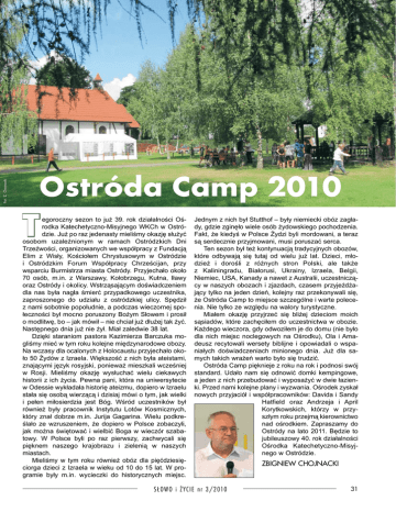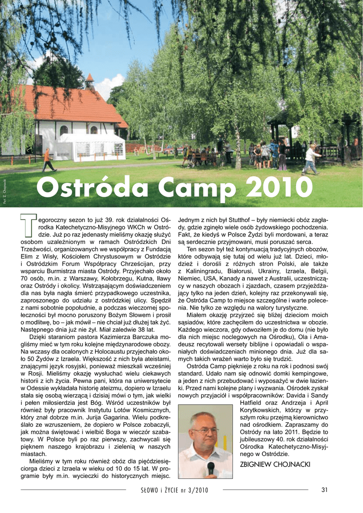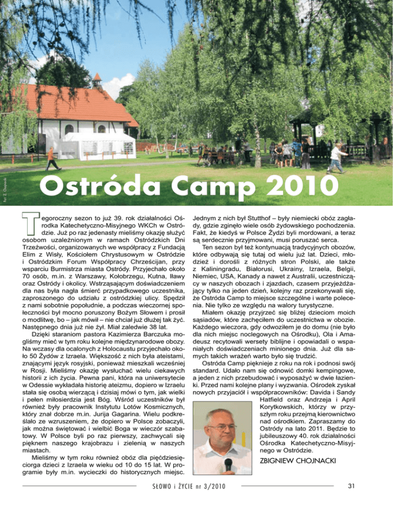 Fot. Z. Chojnacki Ostróda Camp 2010 T egoroczny sezon to już 39. rok działalności Oś rodka Katechetyczno-Misyjnego WKCh w Ostró dzie. Już po raz jedenasty mieliśmy okazję służyć osobom uzależnionym w ramach Ostródzkich Dni Trzeźwości, organizowanych we współpracy z Fundacją Elim z Wisły, Kościołem Chrystusowym w Ostródzie i Ostródzkim Forum Współpracy Chrześcijan, przy wsparciu Burmistrza miasta Ostródy. Przyjechało około 70 osób, m.in. z Warszawy, Kołobrzegu, Kutna, Iławy oraz Ostródy i okolicy. Wstrząsającym doświadczeniem dla nas była nagła śmierć przypadkowego uczestnika, zaproszonego do udziału z ostródzkiej ulicy. Spędził z nami sobotnie popołudnie, a podczas wieczornej spo łeczności był mocno poruszony Bożym Słowem i prosił o modlitwę, bo – jak mówił – nie chciał już dłużej tak żyć. Następnego dnia już nie żył. Miał zaledwie 38 lat. Dzięki staraniom pastora Kazimierza Barczuka mo gliśmy mieć w tym roku kolejne międzynarodowe obozy. Na wczasy dla ocalonych z Holocaustu przyjechało oko ło 50 Żydów z Izraela. Większość z nich była ateistami, znającymi język rosyjski, ponieważ mieszkali wcześniej w Rosji. Mieliśmy okazję wysłuchać wielu ciekawych historii z ich życia. Pewna pani, która na uniwersytecie w Odessie wykładała historię ateizmu, dopiero w Izraelu stała się osobą wierzącą i dzisiaj mówi o tym, jak wielki i pełen miłosierdzia jest Bóg. Wśród uczestników był również były pracownik Instytutu Lotów Kosmicznych, który znał dobrze m.in. Jurija Gagarina. Wielu podkre ślało ze wzruszeniem, że dopiero w Polsce zobaczyli, jak można świętować i wielbić Boga w wieczór szaba towy. W Polsce byli po raz pierwszy, zachwycali się pięknem naszego krajobrazu i zielenią w naszych miastach. Mieliśmy w tym roku również obóz dla pięćdziesię ciorga dzieci z Izraela w wieku od 10 do 15 lat. W pro gramie były m.in. wycieczki do historycznych miejsc. Jednym z nich był Stutthof – były niemiecki obóz zagła dy, gdzie zginęło wiele osób żydowskiego pochodzenia. Fakt, że kiedyś w Polsce Żydzi byli mordowani, a teraz są serdecznie przyjmowani, musi poruszać serca. Ten sezon był też kontynuacją tradycyjnych obozów, które odbywają się tutaj od wielu już lat. Dzieci, mło dzież i dorośli z różnych stron Polski, ale także z Kaliningradu, Białorusi, Ukrainy, Izraela, Belgii, Niemiec, USA, Kanady a nawet z Australii, uczestniczą cy w naszych obozach i zjazdach, czasem przyjeżdża jący tylko na jeden dzień, kolejny raz przekonywali się, że Ostróda Camp to miejsce szczególne i warte polece nia. Nie tylko ze względu na walory turystyczne. Miałem okazję przyjrzeć się bliżej dzieciom moich sąsiadów, które zachęciłem do uczestnictwa w obozie. Każdego wieczora, gdy odwoziłem je do domu (nie było dla nich miejsc noclegowych na Ośrodku), Ola i Ama deusz recytowali wersety biblijne i opowiadali o wspa niałych doświadczeniach minionego dnia. Już dla sa mych takich wrażeń warto było się trudzić. Ostróda Camp pięknieje z roku na rok i podnosi swój standard. Udało nam się odnowić domki kempingowe, a jeden z nich przebudować i wyposażyć w dwie łazien ki. Przed nami kolejne plany i wyzwania. Ośrodek zyskał nowych przyjaciół i współpracowników: Davida i Sandy Hatfield oraz Andrzeja i April Korytkowskich, którzy w przy szłym roku przejmą kierownictwo nad ośrodkiem. Zapraszamy do Ostródy na lato 2011. Będzie to jubileuszowy 40. rok działalności Ośrodka Katechetyczno-Misyj nego w Ostródzie. S ŁOWO i ŻYC IE n r 3/2010 ZBIGNIEW CHOJNACKI 31 Ostróda Camp – lato 2010