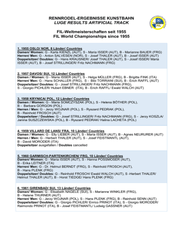 RENNRODEL-ERGEBNISSE KUNSTBAHN LUGE RESULTS ARTIFICIAL TRACK FIL-Weltmeisterschaften seit 1955 FIL World Championships since 1955 1. 1955 OSLO/ NOR, 8 Länder/ Countries Damen/ Women: G - Karla KIENZL (AUT), S - Maria ISSER (AUT), B - Marianne BAUER (FRG) Herren/ Men: G - Anton SALVESEN (NOR), S - Josef THALER (AUT), B - Josef ISSER (AUT) Doppelsitzer/ Doubles: G - Hans KRAUSNER/ Josef THALER (AUT), S - Josef ISSER/ Maria ISSER (AUT), B - Josef STRILLINGER/ Fritz NACHMANN (FRG) 2. 1957 DAVOS/ SUI, 12 Länder/ Countries Damen / Women: G - Maria ISSER (AUT), S - Helga MÜLLER (FRG), B - Brigitte FINK (ITA) Herren/ Men: G - Hans SCHALLER (FRG), S - Bibi TORRIANI (SUI), B - Erich RAFFL (AUT) Doppelsitzer/ Doubles: G - Josef STRILLINGER/ Fritz NACHMANN (FRG), S - Giorgio PICHLER/ Hubert EBNER (ITA), B - Erich RAFFL/ Ewald WALCH (AUT) 3. 1958 KRYNICA/ POL, 12 Länder/ Countries Damen / Women: G - Maria SOMCZYSZAK (POL), S - Helena BÖTHER (POL), B - Barbara GORGON (POL) Herren / Men: G - Jerzy WOJNAR (POL), S - Ryszard PEDRAK (POL), B - Reinhold FROSCH (AUT) Doppelsitzer / Doubles: G - Josef STRILLINGER/ Fritz NACHMANN (FRG), S - Jerzy KOSZLA/ Janina SUSZCZEWSKA (POL), B - Ryszard PEDRAK/ Halina LACHETA (POL) 4. 1959 VILLARD DE LANS/ FRA, 10 Länder/ Countries Damen / Women: G - Elly LIEBER (AUT), S - Maria ISSER (AUT), B - Agnes NEURURER (AUT) Herren / Men: G - Herbert THALER (AUT), S - Josef FEISTMANTL (AUT), B - David MORODER (ITA) Doppelsitzer ausgefallen / Doubles cancelled 5. 1960 GARMISCH-PARTENKIRCHEN/ FRG, 10 Länder/ Countries Damen/ Women: G - Maria ISSER (AUT), S - Hanna POSSMOSER (AUT), B - Erika LEITNER (ITA) Herren/ Men: G - Dr. Helmut BERNDT (FRG), S - Reinhold FROSCH (AUT), B - Hans PLENK (FRG) Doppelsitzer/ Doubles: G - Reinhold FROSCH/ Ewald WALCH (AUT), S -Herbert THALER/ Helmut THALER (AUT), B - Horst TIEDGE/ Hans PLENK (FRG) 6. 1961 GIRENBAD/ SUI, 13 Länder/ Countries Damen/ Women: G - Elisabeth NAGELE (SUI), S - Marianne WINKLER (FRG), B - Helene THURNER (AUT) Herren/ Men: G - Jerzy WOJNAR (POL), S - Hans PLENK (FRG), B - Reinhold SENN (AUT) Doppelsitzer/ Doubles: G - Giorgio PICHLER/ Enrico PRINOT (ITA), S - Giorgio MORODER/ Raimondo PRINOT (ITA), B - Josef FEISTMANTL/ Ludwig GASSNER (AUT) 7. 1962 KRYNICA/ POL, 14 Länder/ Countries Damen/ Women: G - Ilse GEISLER (GDR), S - Gerda RIESER-CEGNAR (AUT), B - Danuta NYCZ (POL) Herren/ Men: G - Thomas KÖHLER (GDR), S - Jerzy WOJNAR (POL), B - Jochen ASCHE (GDR) Doppelsitzer/ Doubles: G - Johann GRABER/ Gianpaolo AMBROSI (ITA), S - Fritz NACHMANN/ Max LEO (FRG), B - Manik NOVOTNY/ Petr SKRABALEK (TCH) 8. 1963 IMST/ AUT, 16 Länder/ Countries Damen/ Women: G - Ilse GEISLER (GDR), S - Helene THURNER (AUT), B - Janina SUSZCZEWSKA (POL) Herren/ Men: G - Fritz NACHMANN (FRG), S - Hans PLENK (FRG), B - Klaus BONSACK (GDR) Doppelsitzer/ Doubles: G - Ryszard PEDRAK/ Lucjan KUDZIA (POL), S - Edward FENDER/ Mieczyslaw PAWELKIEWICZ (POL), B - Anton VENIER/ Ewald WALCH (AUT) 9. 1965 DAVOS/ SUI, 16 Länder/ Countries Damen/ Women: G - Ortrun ENDERLEIN (GDR), S - Petra TIERLICH (GDR), B - Ilse GEISLER (GDR) Herren/ Men: G - Hans PLENK (FRG), S - Mieczyslaw PAWELKIEWICZ (POL), B - Johann GRABER (ITA) Doppelsitzer/ Doubles: G - Wolfgang SCHEIDEL/ Michael KÖHLER (GDR), S - Klaus BONSACK/ Thomas KÖHLER (GDR), B - Horst HÖRNLEIN/ Rolf FUCHS (GDR) 10. 1966 FRIEDRICHRODA/ GDR - AUSGEFALLEN/ CANCELLED 11. 1967 HAMMARSTRAND/ SWE, 13 Länder/ Countries Damen/ Women: G - Ortrun ENDERLEIN (GDR), S - Petra TIERLICH (GDR), B - Helene THURNER (AUT) Herren/ Men: G - Thomas KÖHLER (GDR), S - Klaus BONSACK (GDR), B - Josef FEISTMANTL (AUT) Doppelsitzer/ Doubles: G - Klaus BONSACK/ Thomas KÖHLER (GDR), S - Manfred SCHMID/ Ewald WALCH (AUT), B - Siegfried MAIR/ Ernst MAIR (ITA) 12. 1969 KÖNIGSSEE/ FRG, 16 Länder/ Countries Damen/ Women: G - Petra TIERLICH (GDR), S - Anna-Maria MÜLLER (GDR), B - Christa SCHMUCK (FRG) Herren/ Men: G - Josef FEISTMANTL (AUT), S - Manfred SCHMID (AUT), B - Wolfgang SCHEIDEL (GDR) Doppelsitzer/ Doubles: G - Manfred SCHMID/ Ewald WALCH (AUT), S - Horst HÖRNLEIN/ Reinhard BREDOW (GDR), B - Klaus BONSACK/ Michael KÖHLER (GDR) 13. 1970 KÖNIGSSEE/ FRG, 16 Länder/ Countries Damen/ Women: G - Barbara PIECHA (POL), S - Christa SCHMUCK (FRG), B - Elisabeth DEMLEITNER (FRG) Herren/ Men: G - Josef FENDT (FRG), S - Josef FEISTMANTL (AUT), B - Wolfgang SCHEIDEL (GDR) Doppelsitzer/ Doubles: G - Manfred SCHMID/ Ewald WALCH (AUT), S - Klaus BONSACK/ Michael KÖHLER (GDR), B - Horst HÖRNLEIN/ Reinhard BREDOW (GDR) 14. 1971 OLANG/ ITA, 15 Länder/ Countries Damen/ Women: G - Elisabeth DEMLEITNER (FRG), S - Erika LECHNER (ITA), B - Barbara PIECHA (POL) Herren/ Men: G - Karl BRUNNER (ITA), S - Leonhard NAGENRAUFT (FRG), B - Josef FEISTMANTL (AUT) Doppelsitzer/ Doubles: G - Paul HILDGARTNER/ Walter PLAIKNER (ITA), S - Manfred SCHMID/ Ewald WALCH (AUT), B - Horst HÖRNLEIN/ Reinhard BREDOW (GDR) 15. 1973 OBERHOF/ GDR, 18 Länder/ Countries Damen/ Women: G - Margit SCHUMANN (GDR), S - Ute RÜHROLD (GDR), B - Eva-Maria WERNICKE (GDR) Herren/ Men: G - Hans RINN (GDR), S - Wolfram FIEDLER † (GDR), B - Harald EHRIG (GDR) Doppelsitzer/ Doubles: G - Horst HÖRNLEIN/ Reinhard BREDOW (GDR), S - Hans RINN/ Norbert HAHN (GDR), B - Paul HILDGARTNER/ Walter PLAIKNER (ITA) 16. 1974 KÖNIGSSEE/ FRG, 17 Länder/ Countries Damen/ Women: G - Margit SCHUMANN (GDR), S - Elisabeth DEMLEITNER (FRG), B - Ute RÜHROLD (GDR) Herren/ Men: G - Josef FENDT (FRG), S - Hans RINN (GDR), B - Horst MÜLLER (GDR) Doppelsitzer/ Doubles: G - Bernd HAHN/ Ulrich HAHN (GDR), S - Hans-Henning SCHULZE/ Hans-Jürgen NEUMANN (GDR), B - Rudolf SCHMID/ Franz SCHACHNER (AUT) 17. 1975 HAMMARSTRAND/ SWE, 15 Länder/ Countries Damen/ Women: G - Margit SCHUMANN (GDR), S - Ute RÜHROLD (GDR), B - Dana SPALENSKA (TCH) Herren/ Men: G - Wolfram FIEDLER † (GDR), S - Manfred SCHMID (AUT), B - Harald EHRIG (GDR) Doppelsitzer/ Doubles: G - Bernd HAHN/ Ulrich HAHN (GDR), S - Horst MÜLLER/ Ha