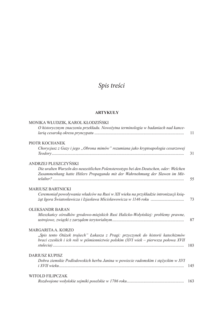 Spis treści ARTYKUŁY Monika Włudzik, Karol Kłodziński O historycznym znaczeniu przekładu. Nowożytna terminologia w badaniach nad kancelarią cesarską okresu pryncypatu....................................................................................... 11 Piotr Kochanek Chorycjusz z Gazy i jego „Obrona mimów” rozumiana jako kryptoapologia cesarzowej Teodory................................................................................................................................ 31 Andrzej Pleszczyński Die uralten Wurzeln des neuzeitlichen Polenstereotyps bei den Deutschen, oder: Welchen Zusammenhang hatte Hitlers Propaganda mit der Wahrnehmung der Slawen im Mittelalter?............................................................................................................................... 55 Mariusz Bartnicki Ceremoniał powoływania władców na Rusi w XII wieku na przykładzie intronizacji książąt Igora Światosławicza i Izjasława Mścisławowicza w 1146 roku ................................. 73 Oleksandr Baran Mieszkańcy ośrodków grodowo-miejskich Rusi Halicko-Wołyńskiej: problemy prawne, ustrojowe, związki z zarządem terytorialnym...................................................................... 87 Margarita A. Korzo „Spis tento Otázek trojiech” Łukasza z Pragi: przyczynek do historii katechizmów braci czeskich i ich roli w piśmiennictwie polskim (XVI wiek – pierwsza połowa XVII stulecia)............................................................................................................................... 103 Dariusz Kupisz Dobra ziemskie Podlodowskich herbu Janina w powiecie radomskim i stężyckim w XVI i XVII wieku......................................................................................................................... 145 Witold Filipczak Rozdwojone wołyńskie sejmiki poselskie w 1786 roku........................................................ 163 6 SPIS TREŚCI Dominik Szulc Relikwie z kościoła pw. św. Stanisława Biskupa w Modliborzycach z drugiej połowy XVIII wieku i okoliczności ich zdeponowania..................................................................... 191 Людмила Посохова Реформы духовных учебных заведений в Российской империи в конце XVIII – в начале ХІХ века и историческая судьба православных коллегиумов Украины......... 203 Monika Gabryś-Sławińska Wielka Wojna na łamach warszawskiego „Tygodnika Ilustrowanego” – okres okupacji niemieckiej.......................................................................................................................... 219 Lech Maliszewski Uwagi o wyratowaniu części żołnierzy polskich z matni w Bretanii w roku 1940.............. 243 Екатерина Еремеева, Владимир Куликов Потребительский идеал в юмористическом дискурсе Советской Украины: контент-анализ советских анекдотов и журнала «Перец»........................................ 261 Marek Woźniak Metodologia a historia: horyzont oczekiwań, przestrzeń doświadczeń.............................. 279 MATERIAŁY Katarzyna Madejska Sprawiedliwość kosztuje: procedury i ich koszty ponoszone przez mieszczan stających przed sądami różnych instancji (na przykładzie sprawy mieszczanina kazimierskiego Wawrzyńca Królika z 1628 roku)........................................................................................ 289 Mirosław Szumiło Działalność redakcji „Trybuny Ludu” w 1955 roku w świetle raportu ambasadora sowieckiego w Warszawie................................................................................................... 301 ARTYKYŁY RECENZYJNE I RECENZJE Polskie samobójstwo, czyli pięćdziesiąt cztery uwagi, pytania, komentarze, refleksje i opinie o książce Piotra Zychowicza, Obłęd ’44. Czyli jak Polacy zrobili prezent Stalinowi, wywołując Powstanie Warszawskie, Dom Wydawniczy Rebis, Poznań 2013, ss. 511 (Marek Sioma)................................................................................................................................. 315 * * * Geoffrey z Monmouth, Historia królów Brytanii, tłum. Aleksandra Radomyska, Armoryka, Biblioteka Tradycji Europejskiej nr 40, Sandomierz 2012, ss. 269 (Tomasz Tarczyński) 325 Joanna Matyasik, Obóz polityczny króla Michała Korybuta Wiśniowieckiego, Warszawa 2011, ss. 395 (Leszek A. Wierzbicki)............................................................................................. 327 SPIS TREŚCI 7 Andrzej Przybyszewski, 9. Pułk Ułanów Małopolskich 1809–1947, Radomyśl Wielki 2011, historyczna.pl, ss. 461 (Marcin Tuzinek)............................................................................. 329 Mateusz Staroń, Likwidacja Polskiego Korpusu Posiłkowego w 1918 roku. Losy legionistów po traktacie brzeskim, Instytut Pamięci Narodowej, Warszawa 2013, ss. 288 (Agnieszka Kidzińska)............................................................................................................................ 334 Mobilizacja marcowa 1939, red. Andrzej Wesołowski, Kamil Stepan, Centralne Archiwum Wojskowe im. mjr. Bolesława Waligóry, Instytut Polski i Muzeum im. gen. Sikorskiego, Warszawa 2012, ss. 592 (Michał Kuchciak)....................................................................... 337 Joanna Pisulińska, Lwowskie środowisko historyczne w okresie międzywojennym (1918–1939), Wydawnictwo Uniwersytetu Rzeszowskiego, Rzeszów 2012, ss. 358 (Dominika Staszczyk).................................................................................................................................... 341 Barbara Wagner, Szkoła publiczna w Polsce w XX wieku. Zarys dziejów społecznych, Uniwersytet Warszawski, 