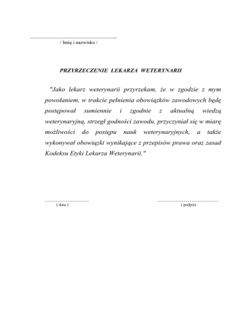 ........................................................... / Imię i nazwisko / PRZYRZECZENIE LEKARZA WETERYNARII "Jako lekarz weterynarii przyrzekam, że w zgodzie z mym powołaniem, w trakcie pełnienia obowiązków zawodowych będę postępował sumiennie i zgodnie z aktualną wiedzą weterynaryjną, strzegł godności zawodu, przyczyniał się w miarę możliwości do postępu nauk weterynaryjnych, a także wykonywał obowiązki wynikające z przepisów prawa oraz zasad Kodeksu Etyki Lekarza Weterynarii." .......................................... ( data ) .......................................................... ( podpis)