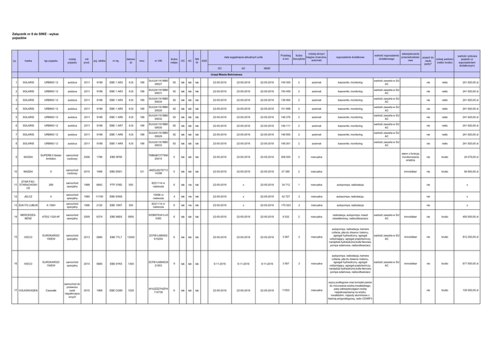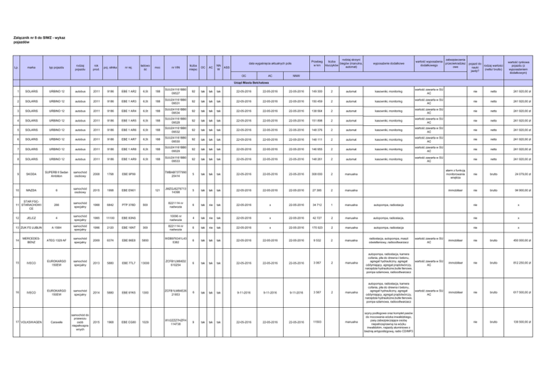 Załącznik nr 8 do SIWZ - wykaz pojazdów Lp. marka typ pojazdu rodzaj pojazdu rok prod. poj. silnika nr rej. ładowo ść moc nr VIN liczba miejsc OC AC NN W rodziaj skrzyni Przebieg liczba biegów (manulna, w km kluczyków automat) data wygaśnięcia aktualnych polis ASS OC AC wyposażenie dodatkowe zabezpieczenia wartość wyposażenia przeciwkradziez dodatkowego owe pojazd do rodzaj wartości nauki (netto/ brutto) jazdy? wartość rynkowa pojazdu (z wyposażeniem dodatkowym) NNW Urząd Miasta Bełchatowa 1 2 SOLARIS SOLARIS URBINO 12 URBINO 12 autobus autobus 2011 2011 9186 9186 EBE 1 AR2 EBE 1 AR3 6,5t 6,5t 188 SUU241161BB0 09527 188 SUU241161BB0 09531 92 tak tak tak 22-05-2016 22-05-2016 22-05-2016 138 564 2 92 tak tak tak 22-05-2016 22-05-2016 22-05-2016 151 898 2 3 SOLARIS URBINO 12 autobus 2011 9186 EBE 1 AR4 6,5t 188 SUU241161BB0 09534 4 SOLARIS URBINO 12 autobus 2011 9186 EBE 1 AR5 6,5t 188 SUU241161BB0 09528 188 SUU241161BB0 09532 188 SUU241161BB0 09530 5 6 SOLARIS SOLARIS URBINO 12 URBINO 12 autobus autobus 2011 2011 9186 9186 EBE 1 AR6 EBE 1 AR7 6,5t 6,5t 92 92 92 92 tak tak tak tak tak tak tak tak tak tak tak tak 22-05-2016 22-05-2016 22-05-2016 22-05-2016 22-05-2016 22-05-2016 22-05-2016 22-05-2016 22-05-2016 22-05-2016 22-05-2016 22-05-2016 149 300 150 459 148 376 148 111 2 2 2 2 kasowniki, monitoring wartość zawarta w SU AC nie netto 241 920,00 zł kasowniki, monitoring wartość zawarta w SU AC nie netto 241 920,00 zł automat kasowniki, monitoring wartość zawarta w SU AC nie netto 241 920,00 zł automat kasowniki, monitoring wartość zawarta w SU AC nie netto 241 920,00 zł kasowniki, monitoring wartość zawarta w SU AC nie netto 241 920,00 zł kasowniki, monitoring wartość zawarta w SU AC nie netto 241 920,00 zł nie netto 241 920,00 zł nie netto 241 920,00 zł automat automat automat automat 7 SOLARIS URBINO 12 autobus 2011 9186 EBE 1 AR8 6,5t 188 SUU241161BB0 09529 92 tak tak tak 22-05-2016 22-05-2016 22-05-2016 146 955 2 automat kasowniki, monitoring wartość zawarta w SU AC 8 SOLARIS URBINO 12 autobus 2011 9186 EBE 1 AR9 6,5t 188 SUU241161BB0 09533 92 tak tak tak 22-05-2016 22-05-2016 22-05-2016 148 261 2 automat kasowniki, monitoring wartość zawarta w SU AC 9 SKODA SUPERB II Sedan Ambition samochód osobowy 2008 1798 EBE 9P99 TMBAB73T7990 20414 5 tak tak tak 22-05-2016 22-05-2016 22-05-2016 308 000 2 manualna alarm z funkcją monitorowania wnętrza nie brutto 24 079,00 zł 10 MAZDA 6 samochód osobowy 2015 1998 EBE EN01 JMZGJ6276713 14398 5 tak tak tak 22-05-2016 22-05-2016 22-05-2016 27 385 2 manualna immobiliser nie brutto 94 900,00 zł 266 samochód specjalny 1988 6842 PTP 378D 8221114 nr nadwozia 6 tak nie tak 22-05-2016 x 22-05-2016 34 712 1 manualna autopompa, radiostacja nie x 4 samochód specjalny 1985 11100 EBE 83NS 10096 nr nadwozia 4 tak nie tak 22-05-2016 x 22-05-2016 42 727 2 manualna autopompa, radiostacja, nie x A 156H samochód specjalny 1996 2120 EBE 16NT 300 8221114 nr nadwozia 6 tak nie tak 22-05-2016 x 22-05-2016 175 023 2 manualna autopompa, radiostacja nie x radiostacja, autopompa, maszt oświetleniowy, radioodtwarzacz STAR FSC11 STARACHOWI CE 12 JELCZ 13 ZUK FS LUBLIN 121 500 14 MERCEDESBENZ ATEG 1329 AF samochód specjalny 2009 6374 EBE 86E8 5850 WDB976341L43 5382 6 tak tak tak 22-05-2016 22-05-2016 22-05-2016 9 532 2 manualna 15 IVECO EUROKARGO 150EW samochód specjalny 2013 5880 EBE 7TL7 13000 ZCFB1LM84D2 610254 6 tak tak tak 22-05-2016 22-05-2016 22-05-2016 3 067 2 IVECO EUROKARGO 150EW samochód specjalny 2014 5880 EBE 6YK5 1300 ZCFB1LM84E26 21853 6 tak tak tak 9-11-2016 9-11-2016 9-11-2016 3 567 Caravelle samochód do przewozu osób niepełnospra wnych 2015 1968 EBE CG80 1029 WV2ZZZ7HZFH 114738 9 tak tak tak 22-05-2016 22-05-2016 22-05-2016 11503 16 17 VOLKSWAGEN 2 wartość zawarta w SU AC immobiliser nie brutto 450 000,00 zł manualna autopompa, radiostacja, kamera cofania, piła do drewna i betonu, agregat hydrauliczny, agregat wartość zawarta w SU oddymiający, agregat prądotwórczy, AC narzędzia hydrauliczne,butle tlenowe, pompa szlamowa, radioodtwarzacz immobiliser nie brutto 812 250,00 zł manualna autopompa, radiostacja, kamera cofania, piła do drewna i betonu, agregat hydrauliczny, agregat wartość zawarta w SU oddymiający, agregat prądotwórczy, AC narzędzia hydrauliczne,butle tlenowe, pompa szlamowa, radioodtwarzacz immobiliser nie brutto 617 500,00 zł manualna szyny podłogowe oraz komplet pasów do mocowania wózka inwalidzkiego, pasy zabezpieczające osobę niepełnosprawną na wózku inwalidzkim, najazdy aluminiowe z bieżnią antypoślizgową, radio CD/MP3 nie brutto 139 500,00 zł 18 VOLKSWAGEN Transporter Shutt LR kombi 19 VOLKSWAGEN Transporter 20 RENAULT Kangoo samochód do przewozu osób niepełnospra wnych 2006 1896 EBE 24UM ciężarowy 1997 2370 PUK 2039 1070 2007 1149 EBE 3C72 420 872 samochód specjalny samochód specjalny 21 FORD Transit custome 2015 2198 EBE GR44 22 FIAT DOBLO Easy 1,4 T-JET 120 KM samochód osobowy 2015 1368 EBE HH10 24 LEIKE MOTOROWER Motorower 2007 49,5 cm3 EBE44XT WV2ZZZ7HZ7X 011949 7 166 933 manualna 22-05-2016 x 22-05-2016 294 680 manualna 22-05-2016 22-05-2016 22-05-2016 345 786 manualna 16-12-2016 16-12-2016 1 200 2 22-05-2016 544 2 MANUALNA 22-05-2016 tak nie tak tak tak tak 7 tak tak tak 28-12-2016 5 tak tak tak 16-12-2016 LD6TCB1917L000156 2 tak nie ZFA26300006A 60390 6 22-05-2016 tak 88 kW tak 22-05-2016 tak WV1ZZZ707WX 062837 VF1KCEDEF38 223609 WF0YXXTTGYF 100 KM Y85681 9 Najazd z powłoką antypoślizgową do wprowadzenia wózka inwalidzkiego, szyny mocujące, 2 wózki, nakładka ochronna progu, radio z odtwarzaczem cd, mikrofon do komunikacji z pasażerami 200 wartość zawarta w SU AC immobiliser, autoalarm nie belka świetlna 2500 immobiliser nie belka świetlna 2500 (zawarta w SU AC) immobiliser manualna belka świetlna 5000 manualna hak holowniczy, radio/MP3, instalacja LPG TARTARINI, brutto 59 500,00 zł nie brutto 10 824,00 zł immobiliser nie bru