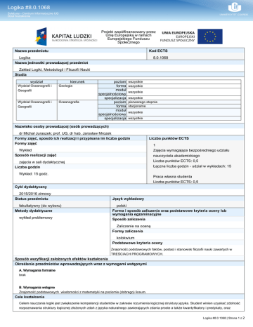 Logika #8.0.1068 Sylabusy - Centrum Informatyczne UG Dział Kształcenia Projekt współfinansowany przez Unię Europejską w ramach Europejskiego Funduszu Społecznego Nazwa przedmiotu Kod ECTS Logika Nazwa jednostki prowadzącej przedmiot 8.0.1068 Zakład Logiki, Metodologii i Filozofii Nauki Studia wydział kierunek Wydział Oceanografii i Geografii Geologia Wydział Oceanografii i Geografii Oceanografia poziom forma moduł specjalnościowy specjalizacja poziom forma moduł specjalnościowy specjalizacja wszystkie wszystkie wszystkie wszystkie pierwszego stopnia stacjonarne wszystkie wszystkie Nazwisko osoby prowadzącej (osób prowadzących) dr Michał Juraszek; prof. UG, dr hab. Jarosław Mrozek Formy zajęć, sposób ich realizacji i przypisana im liczba godzin Formy zajęć Liczba punktów ECTS Wykład Sposób realizacji zajęć zajęcia w sali dydaktycznej Liczba godzin Wykład: 15 godz. 1 Zajęcia wymagające bezpośredniego udziału nauczyciela akademickiego Liczba punktów ECTS: 0,5 Łączna liczba godzin - udział w wykładach: 15 Praca własna studenta Liczba punktów ECTS: 0,5 Cykl dydaktyczny 2015/2016 zimowy Status przedmiotu fakultatywny (do wyboru) Metody dydaktyczne wykład problemowy Język wykładowy polski Forma i sposób zaliczenia oraz podstawowe kryteria oceny lub wymagania egzaminacyjne Sposób zaliczenia Zaliczenie na ocenę Formy zaliczenia kolokwium Podstawowe kryteria oceny Znajomość podstawowych faktów, postaci i stanowisk filozofii nauki zawartych w TREŚCIACH PROGRAMOWYCH. Sposób weryfikacji założonych efektów kształcenia Określenie przedmiotów wprowadzających wraz z wymogami wstępnymi A. Wymagania formalne brak B. Wymagania wstępne Znajomość podstawowych wiadomości z matematyki na poziomie (dobrego) liceum. Cele kształcenia Celem nauczania logiki jest zwiększenie kompetencji studentów w zakresie rozumienia logicznej struktury języka. Student winien uzyskać zdolność rozpoznawania struktury logicznej złożonych zdań z języka naturalnego zawierających zdania proste a także kwantyfikatory i predykaty, oraz Logika #8.0.1068 | Strona 1 z 2 Logika #8.0.1068 Sylabusy - Centrum Informatyczne UG Dział Kształcenia rozumowań przeprowadzanych w języku naturalnym. Treści programowe 1. 2. 3. 4. 5. 6. 7. Pojęcie zdania w sensie logicznym. Wartości logiczne. Funktory Klasycznego Rachunku Zdań (KRZ). Zdanie proste. Słownik KRZ. Formuła KRZ. Przekład zdań z języka naturalnego na język symboliczny i na odwrót. Pojęcie tautologii, kontrtautologii. Metoda zerojedynkowa sprawdzania formuł KRZ. Skrócona metoda zerojedynkowa jako paradygmat rozumowań formalnych ad absurdum. Pojęcie prawdy logicznej, wynikania logicznego, wnioskowania dedukcyjnego. Pojęcie kwantyfikatora i predykatu. Słownik rachunku predykatów. Przekład zdań z języka naturalnego na język predykatów i odwrotnie. Wykaz literatury A. Literatura wymagana do ostatecznego zaliczenia zajęć (zdania egzaminu): A.1. wykorzystywana podczas zajęć: 1. Przybyłowski J. (1995): Logika z ogólną metodologią nauk, Gdańsk, Wyd. UG 2. Wieczorek K. (2005): Wprowadzenie do logiki, Warszawa, Wyd. SKRYPT 3. Stanosz B. (1998): Wprowadzenie do logiki formalnej. Podręcznik dla humanistów. Wyd. PWN A.2. studiowana samodzielnego: 1. Stanosz B. (1998): Ćwiczenia z logiki, Warszawa, Wyd. PWN 2. Wajszczyk J. Gruszycka-Glabas M.(1997), Zbiór ćwiczeń z logiki, Olsztyn, WSP B. Literatura uzupełniająca: MAŁA ENCYKLOPEDIA LOGIKI, pod red. W Marciszewskiego (1988): Wrocław – Warszawa – Kraków – Gdańsk – Łódź: Zakład Narodowy im Ossolińskich. Efekty kształcenia (obszarowe i kierunkowe) [Kod efektu kształcenia dla modułu, odniesienie do efektów kształcenia dla kierunku (stopień realizacji)] Opis efektu kształcenia. Wiedza 1. [K_W08, H1A_W06] Zna i rozumie główne pojęcia logiki. 2. [K_W09, H1A_W07, H1A_W09] Zna i rozumie charakter rozumowań logicznych. 3. [K_W10, H1A_W04] Zna idee i argumenty wybranych zastosowań logiki do analizy języka naturalnego. Umiejętności 1. [K_U04, H1A_U04] Słucha ze zrozumieniem ustnej prezentacji pojęć logicznych. 2. [K_U07; H1A_U05] Analizuje argumenty logiczne, identyfikuje ich kluczowe tezy i założenia. 3. [K_U15; H1A_U01; H1A_U08] Samodzielnie rozwiązuje proste ćwiczenia z logiki. Kompetencje społeczne (postawy) 1. [K_K03, H1A_K01] Jest otwarty na nowe idee i gotów do zmiany opinii w świetle dostępnych danych argumentów. 2. [K_K05; H1A_K02] Efektywnie organizuje własną pracę i krytycznie ocenia stopień jej zaawansowania. Kontakt [email protected] Logika #8.0.1068 | Strona 2 z 2