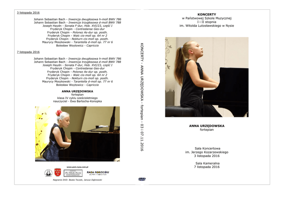 3 listopada 2016 7 listopada 2016 Johann Sebastian Bach - Inwencja dwugłosowa h-moll BWV 786 Johann Sebastian Bach - Inwencja trzygłosowa d-moll BWV 788 Joseph Haydn - Sonata F-dur, Hob. XVI/23, część I Fryderyk Chopin - Contredanse Ges-dur Fryderyk Chopin - Polonez As-dur op. posth. Fryderyk Chopin - Walc cis-moll op. 64 nr 2 Fryderyk Chopin - Nokturn cis-moll op. posth. Maurycy Moszkowski - Tarantella d-moll op. 77 nr 6 Bolesław Woytowicz - Capriccio ANNA URZĘDOWSKA fortepian klasa IV cyklu sześcioletniego nauczyciel - Ewa Bartocha-Konopka www.psm.nysa.com.pl Nagranie DVD: Beata Toczek, Janusz Dąbrowski KONCERTY - ANNA URZĘDOWSKA - fortepian - 03 i 07.11.2016 Johann Sebastian Bach - Inwencja dwugłosowa h-moll BWV 786 Johann Sebastian Bach - Inwencja trzygłosowa d-moll BWV 788 Joseph Haydn - Sonata F-dur, Hob. XVI/23, część I Fryderyk Chopin - Contredanse Ges-dur Fryderyk Chopin - Polonez As-dur op. posth. Fryderyk Chopin - Walc cis-moll op. 64 nr 2 Fryderyk Chopin - Nokturn cis-moll op. posth. Maurycy Moszkowski - Tarantella d-moll op. 77 nr 6 Bolesław Woytowicz - Capriccio KONCERTY w Państwowej Szkole Muzycznej I i II stopnia im. Witolda Lutosławskiego w Nysie ANNA URZĘDOWSKA fortepian Sala Koncertowa im. Jerzego Kozarzewskiego 3 listopada 2016 Sala Kameralna 7 listopada 2016