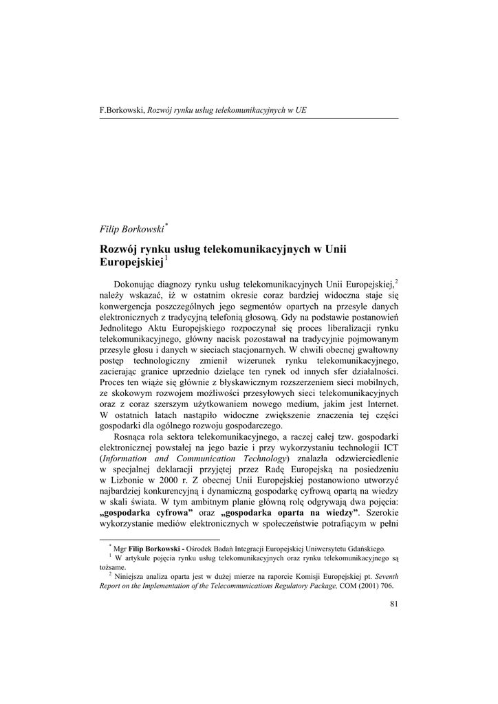 F.Borkowski, Rozwój rynku usług telekomunikacyjnych w UE Filip Borkowski * Rozwój rynku usług telekomunikacyjnych w Unii Europejskiej 1 Dokonując diagnozy rynku usług telekomunikacyjnych Unii Europejskiej, 2 należy wskazać, iż w ostatnim okresie coraz bardziej widoczna staje się konwergencja poszczególnych jego segmentów opartych na przesyle danych elektronicznych z tradycyjną telefonią głosową. Gdy na podstawie postanowień Jednolitego Aktu Europejskiego rozpoczynał się proces liberalizacji rynku telekomunikacyjnego, główny nacisk pozostawał na tradycyjnie pojmowanym przesyle głosu i danych w sieciach stacjonarnych. W chwili obecnej gwałtowny postęp technologiczny zmienił wizerunek rynku telekomunikacyjnego, zacierając granice uprzednio dzielące ten rynek od innych sfer działalności. Proces ten wiąże się głównie z błyskawicznym rozszerzeniem sieci mobilnych, ze skokowym rozwojem możliwości przesyłowych sieci telekomunikacyjnych oraz z coraz szerszym użytkowaniem nowego medium, jakim jest Internet. W ostatnich latach nastąpiło widoczne zwiększenie znaczenia tej części gospodarki dla ogólnego rozwoju gospodarczego. Rosnąca rola sektora telekomunikacyjnego, a raczej całej tzw. gospodarki elektronicznej powstałej na jego bazie i przy wykorzystaniu technologii ICT (Information and Communication Technology) znalazła odzwierciedlenie w specjalnej deklaracji przyjętej przez Radę Europejską na posiedzeniu w Lizbonie w 2000 r. Z obecnej Unii Europejskiej postanowiono utworzyć najbardziej konkurencyjną i dynamiczną gospodarkę cyfrową opartą na wiedzy w skali świata. W tym ambitnym planie główną rolę odgrywają dwa pojęcia: „gospodarka cyfrowa” oraz „gospodarka oparta na wiedzy”. Szerokie wykorzystanie mediów elektronicznych w społeczeństwie potrafiącym w pełni * Mgr Filip Borkowski - Ośrodek Badań Integracji Europejskiej Uniwersytetu Gdańskiego. W artykule pojęcia rynku usług telekomunikacyjnych oraz rynku telekomunikacyjnego są tożsame. 2 Niniejsza analiza oparta jest w dużej mierze na raporcie Komisji Europejskiej pt. Seventh Report on the Implementation of the Telecommunications Regulatory Package, COM (2001) 706. 1 81 Studia Europejskie, 4/2002 wykorzystać nowe narzędzia ma zapewnić UE dynamiczny rozwój i poprawę pozycji wobec głównych światowych konkurentów. Decyzje podjęte w Lizbonie pozostają w granicach nakreślonych w inicjatywie, z którą wystąpiła Komisja Europejska podczas posiedzenia Rady Europejskiej w Helsinkach, noszącej nazwę: eEurope – an Information Society for All. Inicjatywa ta, podobnie jak deklaracja z Lizbony, wyraża wolę modernizacji i umocnienia europejskiej gospodarki poprzez transformację społeczeństwa europejskiego w tzw. społeczeństwo informacyjne. 3 1. Regulacja rynku Unia Europejska, aby zrealizować swe zamiary, musi nadal bardzo uważnie kontrolować zmiany zachodzące na rynku telekomunikacyjnym, odgrywającym podstawową rolę w budowie nowej gospodarki. W raporcie Komisji Europejskiej pt. Seventh Report on the Implementation of the Telecommunications Regulatory Package dokonano podsumowania procesów zachodzących obecnie w unijnej telekomunikacji. Oprócz przeglądu i oceny stopnia wprowadzania europejskich regulacji w zakresie rynku telekomunikacyjnego w raporcie poświęcono wiele miejsca kwestiom związanym z przejściem od dotychczasowego stanu prawnego do tzw. nowych ram regulacyjnych. Proces liberalizacji wymagał wydania wielu regulacji. Do końca 1999 r. wydano ponad 60 dyrektyw i decyzji dotyczących telekomunikacji. Należy przypomnieć, iż do głównych dyrektyw otwierających poszczególne fragmenty rynku telekomunikacyjnego zalicza się: – Dyrektywę 90/388/EWG, 4 szczególnie ważną dla demonopolizacji świadczenia usług transmisji danych, wprowadzonej z dniem 1 stycznia 1993 r., – Dyrektywę 96/2/WE 5 dotyczącą otwarcia rynku w zakresie telekomunikacji ruchomej z dniem 1 lutego 1996 r., – Dyrektywę 96/19/WE, 6 na podstawie której dokonano pełnej liberalizacji rynku usług telekomunikacyjnych, włączając w ten proces z dniem 1 stycznia 1998 r. stacjonarną telefonię głosową. 3 Szerzej na temat inicjatywy eEurope patrz: W.Marciński, Inicjatywa „eEurope” jako narzędzie przyspieszenia transformacji w kierunku społeczeństwa informacyjnego, „Wspólnoty Europejskie – Biuletyn Informacyjny”, nr 4(104)/2000. 4 Dyrektywa Komisji 90/388/EWG z 28.06.1990 r. w sprawie konkurencji na rynku usług telekomunikacyjnych (por.: O.J. L 192/10, 24.07.1990). 5 Dyrektywa Komisji 96/2/WE z 16.01.1996 r. w sprawie telekomunikacji ruchomej (por.: O.J. L 20/59, 26.01.1996). 6 Dyrektywa Komisji 96/19/WE z 13.03.1996 r. o pełnej liberalizacji w sektorze telekomunikacyjnym (por.: O.J. L 74/13, 22.03.1996). 82 F.Borkowski, Rozwój rynku usług telekomunikacyjnych w UE Ważną rolę odegrały również dyrektywy harmonizacyjne wydawane przez Radę oraz poszczególne inicjatywy dotyczące telekomunikacji podejmowane przez organy Wspólnot w ramach prowadzonych polityk. Potrzeba stworzenia tzw. nowych ram regulacyjnych wynika z faktu, iż telekomunikacja jest dziedziną, jak wspomniano, niezmiernie dynamiczną, co wymusza odpowiednie dostosowania prawa. Dotychczasowa infrastruktura prawna była tworzona głównie z myślą o sprawnym przeprowadzeniu procesu liberalizacji. W chwili obecnej staje się w pełni widoczna konieczność wprowadzenia skonsolidowanych zasad odnoszących się do już zliberalizowanego rynku, który staje się coraz bardziej konkurencyjny i podlega procesowi konwergencji. Po przeglądzie tego sektora w 1999 r. Komisja Europejska zaproponowała stworzenie na bazie dotychczasowych dokonań nowych ram legislacyjnych, które powinny składać się z trzech podstawowych elementów, a mianowicie: wiążącego prawa sektorowego, dodatkowych niewiążących środków sektorowych oraz prawa konkurencji. Liczba dyrektyw zos