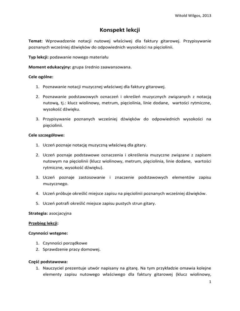 Witold Wilgos, 2013 Konspekt lekcji Temat: Wprowadzenie notacji nutowej właściwej dla faktury gitarowej. Przypisywanie poznanych wcześniej dźwięków do odpowiednich wysokości na pięciolinii. Typ lekcji: podawanie nowego materiału Moment edukacyjny: grupa średnio zaawansowana. Cele ogólne: 1. Poznawanie notacji muzycznej właściwej dla faktury gitarowej. 2. Poznawanie podstawowych oznaczeń i określeń muzycznych związanych z notacją nutową, tj.: klucz wiolinowy, metrum, pięciolinia, linie dodane, wartości rytmiczne, wysokość dźwięku. 3. Przypisywanie poznanych wcześniej dźwięków do odpowiednich wysokości na pięciolinii. Cele szczegółowe: 1. Uczeń poznaje notację muzyczną właściwą dla gitary. 2. Uczeń poznaje podstawowe oznaczenia i określenia muzyczne związane z zapisem nutowym na pięciolinii (klucz wiolinowy, metrum, pięciolinia, linie dodane, wartości rytmiczne, wysokość dźwięku). 3. Uczeń poznaje zastosowanie i znaczenie podstawowych elementów zapisu muzycznego. 4. Uczeń próbuje określić miejsce zapisu na pięciolinii poznanych wcześniej dźwięków. 5. Uczeń potrafi określić miejsce zapisu pustych strun gitary. Strategia: asocjacyjna Przebieg lekcji: Czynności wstępne: 1. Czynności porządkowe 2. Sprawdzenie pracy domowej. Część podstawowa: 1. Nauczyciel prezentuje utwór napisany na gitarę. Na tym przykładzie omawia kolejne elementy zapisu nutowego właściwego dla faktury gitarowej (klucz wiolinowy, 1 Witold Wilgos, 2013 metrum, pięciolinia, linie dodane, wartości rytmiczne, wysokość dźwięku). Uczniowie zapisują podawane przez nauczyciela informacje w zeszytach przedmiotowych. 2. Następnie nauczyciel pokazuje w jaki sposób można zapisać znane uczniom dźwięki. Uczniowie określają miejsca, w których zapisane są puste struny gitary. Następnie odszukują w przykładowym utworze odpowiednie wysokości. Zadanie powinno być tak zorganizowane, żeby każdy uczeń mógł indywidualnie znaleźć w nutach miejsce, w którym są zanotowane puste struny. 3. Na koniec nauczyciel rozdaje kartkę z pięciolinią, na której są zapisane dźwięki naturalne w pierwszej pozycji. Czynności końcowe: 1. Podsumowanie zajęć. 2. Do domu jest zadane nauczenie się omawianych zagadnień teoretycznych. 2