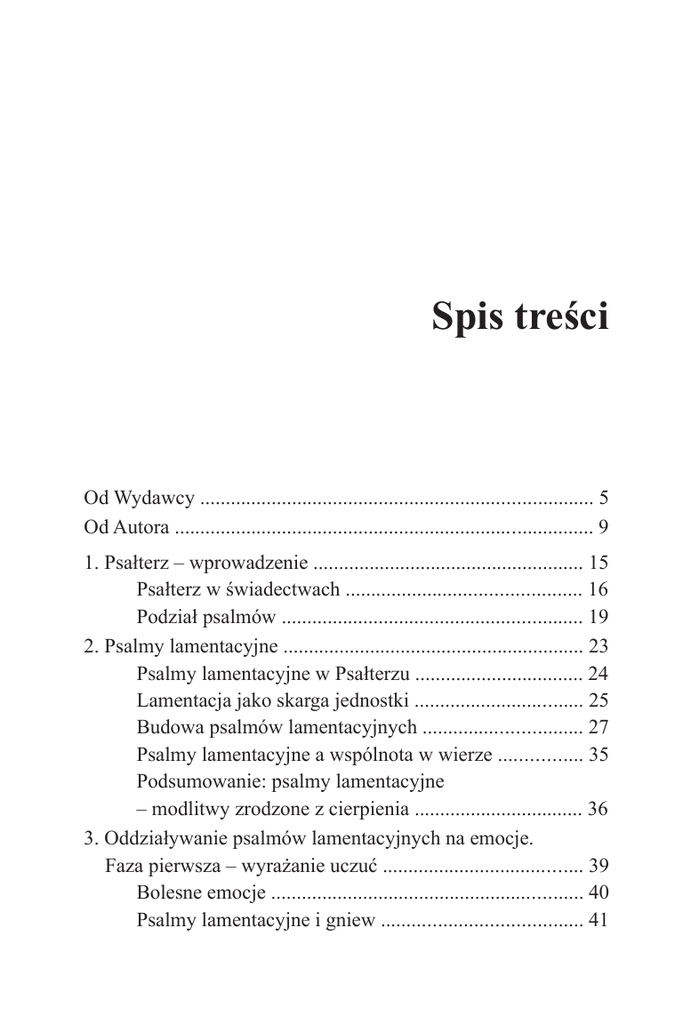 Spis treści Od Wydawcy ............................................................................. 5 Od Autora .................................................................................. 9 1. Psałterz – wprowadzenie ..................................................... 15 Psałterz w świadectwach .............................................. 16 Podział psalmów ........................................................... 19 2. Psalmy lamentacyjne ........................................................... 23 Psalmy lamentacyjne w Psałterzu ................................. 24 Lamentacja jako skarga jednostki ................................. 25 Budowa psalmów lamentacyjnych ............................... 27 Psalmy lamentacyjne a wspólnota w wierze ................ 35 Podsumowanie: psalmy lamentacyjne – modlitwy zrodzone z cierpienia ................................. 36 3. Oddziaływanie psalmów lamentacyjnych na emocje. Faza pierwsza – wyrażanie uczuć ....................................... 39 Bolesne emocje ............................................................. 40 Psalmy lamentacyjne i gniew ....................................... 41 Psalmy lamentacyjne i strach ........................................ 52 Psalmy lamentacyjne i rozpacz ..................................... 58 Psalmy lamentacyjne i wina ......................................... 65 Psalmy lamentacyjne jako wzór wyrażania emocji ...... 78 Podsumowanie: wiara woła i oczekuje ......................... 87 4. Oddziaływanie psalmów lamentacyjnych na emocje. Faza druga – przezwyciężenie uczuć .................................. 89 Wołanie do Boga ........................................................... 90 Przezwyciężenie gniewu ............................................... 92 Przezwyciężenie strachu ............................................... 98 Przezwyciężenie rozpaczy .......................................... 102 Przezwyciężenie winy ................................................. 106 Podsumowanie: Wybawię cię, a ty mnie uwielbisz ...... 112 5. Oddziaływanie psalmów lamentacyjnych na emocje. Faza trzecia – uwielbienie Boga ....................................... 115 Pieśń uwielbienia ........................................................ 116 Świadectwa mocy ....................................................... 119 Owoc cierpienia .......................................................... 119 Podsumowanie: Bóg jest prawdziwy .......................... 120 6. Znaczenie psalmów lamentacyjnych w duszpasterstwie ... 123 Bóg słucha – znaczenie empatii .................................. 124 Bóg wspiera wołanie – znaczenie wsparcia ................ 124 Bóg daje słowo – znaczenie werbalizacji ................... 126 Miejsce spotkania – znaczenie wspólnoty .................. 126 Naśladować i prowadzić ............................................. 127 Duszpasterskie usługiwanie ........................................ 128 Podsumowanie: Wzywaj mnie w dniu niedoli ............. 131 7. Zakończenie: od skargi do chwały .................................... 133 Przypisy ................................................................................. 137 Bibliografia ............................................................................ 145 Wykaz skrótów ...................................................................... 149