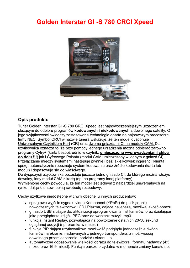 Golden Interstar GI -S 780 CRCI Xpeed Opis produktu Tuner Golden Interstar GI -S 780 CRCI Xpeed jest najnowocześniejszym urządzeniem służącym do odbioru programów kodowanych i niekodowanych z dowolnego satelity. O jego wyjątkowości świadczy zastosowana technologia oparta na najnowszym procesorze firmy NEC. Symbol CRCI w nazwie tunera wskazuje, że ten model dysponuje Uniwersalnym Czytnikiem Kart (CR) oraz dwoma gniazdami CI na moduly CAM. Dla użytkownika oznacza to, że przy pomocy jednego urządzenia można odbierać zarówno programy Cyfry+ (karta bezpośrednio w czytnik, umieszczona wyprowadzeniami chipa do dołu !!!) jak i Cyfrowego Polsatu (moduł CAM umieszczony w jednym z gniazd CI). Przełączanie między systemami następuje płynnie i bez jakiejkolwiek ingerencji klienta, sprzęt automatycznie ropoznaje system kodowania oraz źródło kodowania (karta lub moduł) i dopasowuje się do właściwego. Do dyspozycji użytkownika pozostaje jeszcze jedno gniazdo CI, do którego można włożyć dowolny, inny moduł CAM z kartą (np. na programy innej platformy). Wymienione cechy powodują, że ten model jest jednym z najbardziej uniwersalnych na rynku, dając klientowi pełną swobodę rozbudowy. Cechy użytkowe niedostępne w chwili obecnej u innych producentów: • • • • • sprzętowe wyjście sygnału video Komponent (YPbPr) do podłączenia nowoczesnych telewizorów LCD i Plazma, dające najlepszą, możliwą jakość obrazu gniazdo USB służące do: aktualizacji oprogramowania, list kanałów, oraz działające jako przeglądarka zdjęć JPEG oraz odtwarzacz muzyki mp3 funkcja Instant Replay, pozwalająca na powtórzenie ostatnich 20-30 sekund oglądanej audycji (np. bramka w meczu) funkcja PIP dająca użytkownikowi możliwość podglądu jednocześnie dwóch kanałów na ekranie, nadawanych z jednego transpondera, z możliwością dowolnego przemieszczania, podziału ekranu itp. automatyczne dopasowanie wielkości obrazu do telewizora i formatu nadawcy (4:3 mixed oraz 16:9 mixed). Funkcja bardzo przydatna w momencie zmiany kanału np. • z Canal+ (zwykle 4:3) na Canal+ Film (najczęściej 16:9), nie wymaga żadnej ingerencji użytkownika 256MB pamięci DDR do wykorzystania przez Użytkownika (przeglądarka zdjęć, PIP i inne funkcje) Oprócz wymienionych, tunery z serii Xpeed posiadają całą gamę możliwości, które ułatwiają codzienne użytkowanie. Poniżej najistotniejsze z nich: • • • • • • • • • • • • • • • • • • regulacja jaskrawości i kontrastu gry TV (w tym hit ostatnich miesięcy - SUDOKU) obsługa wszystkich typów modułów CAM cyfrowy dźwięk z gniazda SPDiF funkcja ZOOM (powiększenie fragmentu ekranu) funkcja Multiobraz (do 16 obrazów na jednym ekranie) wbudowany dekoder telegazety, nie wymaga teletekstu w TV najbardziej rozbudowane funkcje edycji kanałów/transponderów/satelitów spośród tunerów na rynku możliwość szybkiego sortowania kanałów wg: - kolejności programowania - alfabetycznie (obsługa jak w telefonach komórkowych) - nadawców - satelitów - ulubionych - transponderami - systemów kodowania - kodowane/niekodowane możliwość sortowania układu satelitów i transponderów najszybszy procesor na rynku firmy NEC programowanie do 6000 kanałów, 1200 transpoderów, 120 satelitów obsługa wszystkich sygnałów diseqc (1.0; 1.1; 1.2; 1.3 - USALS) obsługa napisów ekranowych obsługa EPG (program telewizyjny) do 7 dni (np. kanały TVN) Stop - Klatka historia oglądanych kanałów blokada rodzicielska, z ustawieniem limitu wieku i wiele innych Jako przykład łatwości obsługi tunerów Xpeed można podać wymianę oprogramowania w tym sprzęcie. Kolejne wersje oprogramowania dostępne na stronie Dystrybutora, musiały być do tej pory wgrywane do tunera przy pomocy specjalnego programu (loadera) z użyciem kabla RS 232 oraz komputera. Tunery Xpeed posiadają gniazdo USB i ta operacja obecnie sprowadza się do: • • • Ściągnięcia pliku z oprogramowaniem ze strony WWW Rozpakowania go i umieszczenia bezpośrednio w pamięci USB (pendrive) Włożeniu pamięci USB w gniazdo tunera Tuner automatycznie rozpozna zawartość pamięci i wyświetli ją na ekranie, należy tylko wskazać plik i nacisnąć OK. Po około 45 sekundach cała operacja jest zakończona, a tuner ma najnowsze oprogramowanie. Identycznie odbywa się wgranie gotowej listy kanałów z satelity, dostępnej również na stronach www. Gniazdo USB służy również jako przeglądarka zdjęć JPEG. Wystarczy zdjęcia np. z wakacji umieścić w pamięci USB, włożyć ją do gniazda w tunerze, nacisnąć na pilocie klawisz OK, a następnie F1. Pojawi się lista zdjęć, można je wyświetlać pojedynczo, jak i jako slajdy, ciesząć się w szerokim gronie z możliwości oglądania na dużym ekranie. Identycznie odtwarza się pliki mp3, a podłączenie tunera do wzmacniacza przez oprtyczne słącze SPDiF daje znakomitą, cyfrową jakość dźwięku na posiadanym zestawie audio. Podane możliwości nie wyczerpują wszystkich, którymi dysponuje tuner GI-S 780 CRCI Xpeed. Aby sprawdzić pozostałe, proszę zapoznać się z instrukcją obsługi, dostępną w linku poniżej. Dane techniczne: Specyfikacja techniczna Tuner Wejście sygnału: typ F, IEC 169-24, żeński Zakres częstotliwości: 950-2150MHz Impedancja wejścia: 75ohm Poziom sygnału: -25 do -65dBm Zasilanie LNB/polaryzacja: +13V/pozioma, +18V/pionowa Pobór prądu: max 500mA, zabezpieczenie przed przeciążeniem Sygnał 22KHz: +/-4KHz Amplituda: 0.6V +/-0,2V Sygnały diseqc: 1.0/1.2/1.3 Demodulacja: QPSK Zakres prędkości transmisji (SR): 1~45Ms/s Korekcja FEC: 1/2; 2/3; 3/4; 5/6; 7/8 z ograniczeniem długości K=7 MPEG dekodowanie A/V Strumień danych: MPEG-2 ISO/IEC 13818 Poziom: MPEG-2 MP@ML Szybkość wejściowa: 100Mbit/max Format: 4:3; 16:9 Rozdzielczość: 720x576 (PAL)/ 720x480 (NTSC) Dekodowanie Audio: MPEG/MusiCam Layer I & II Tryb Audio: pojedync